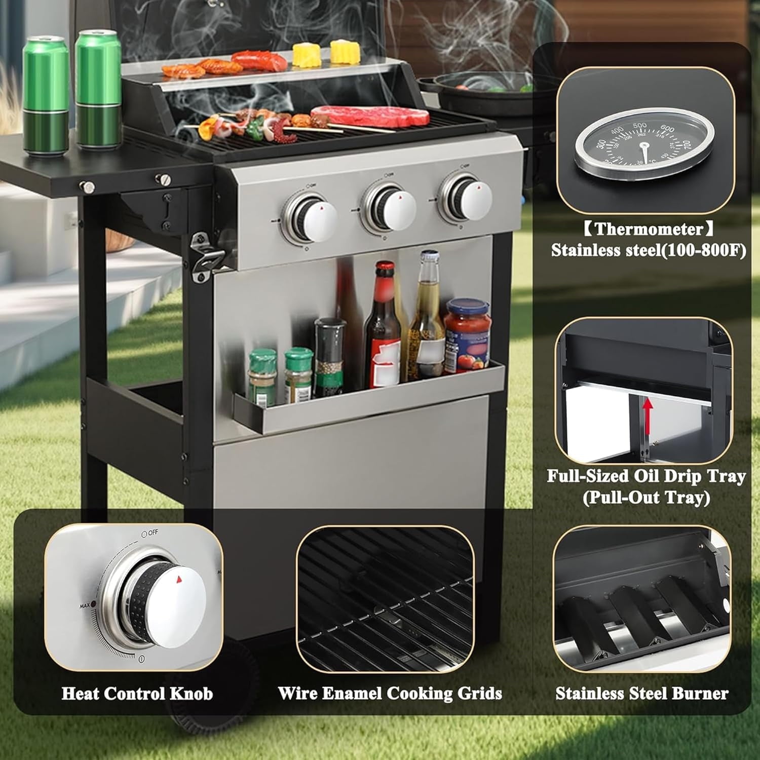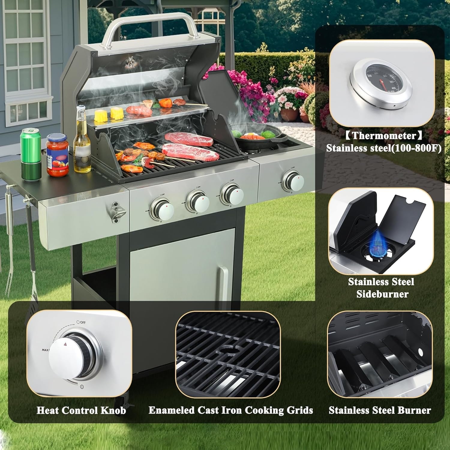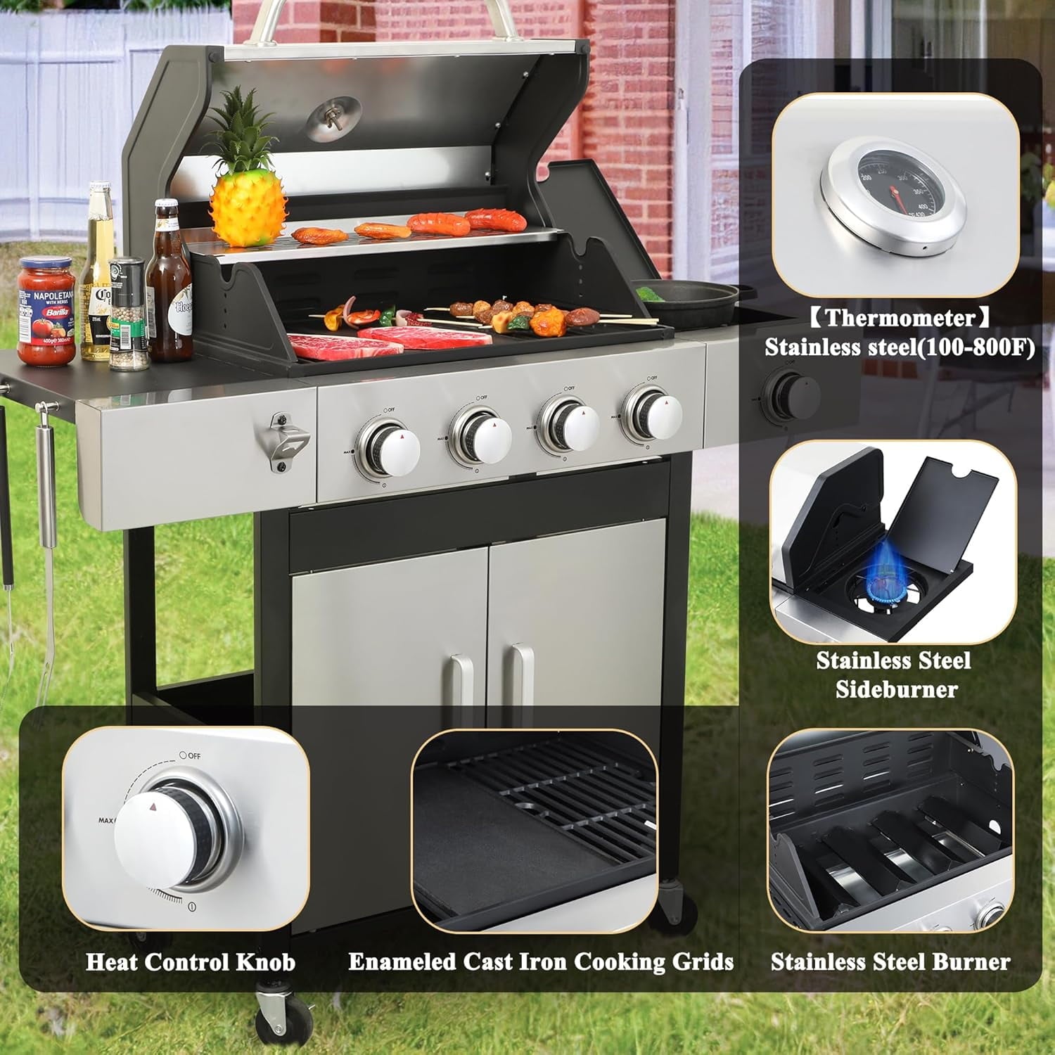 - 【Wire Enamel Cooking Grids】Upgraded cooking grates of this propane gas grills are made of easy-to-clean wire enamel material which helps prevent rusting and cracking. Stainless steel burners, wire-enameled cooking grids and flame stabilizers work in tandem to distribute heat evenly over the entire grill surface and provide excellent insulation to prevent hot or cold spots on the grill.