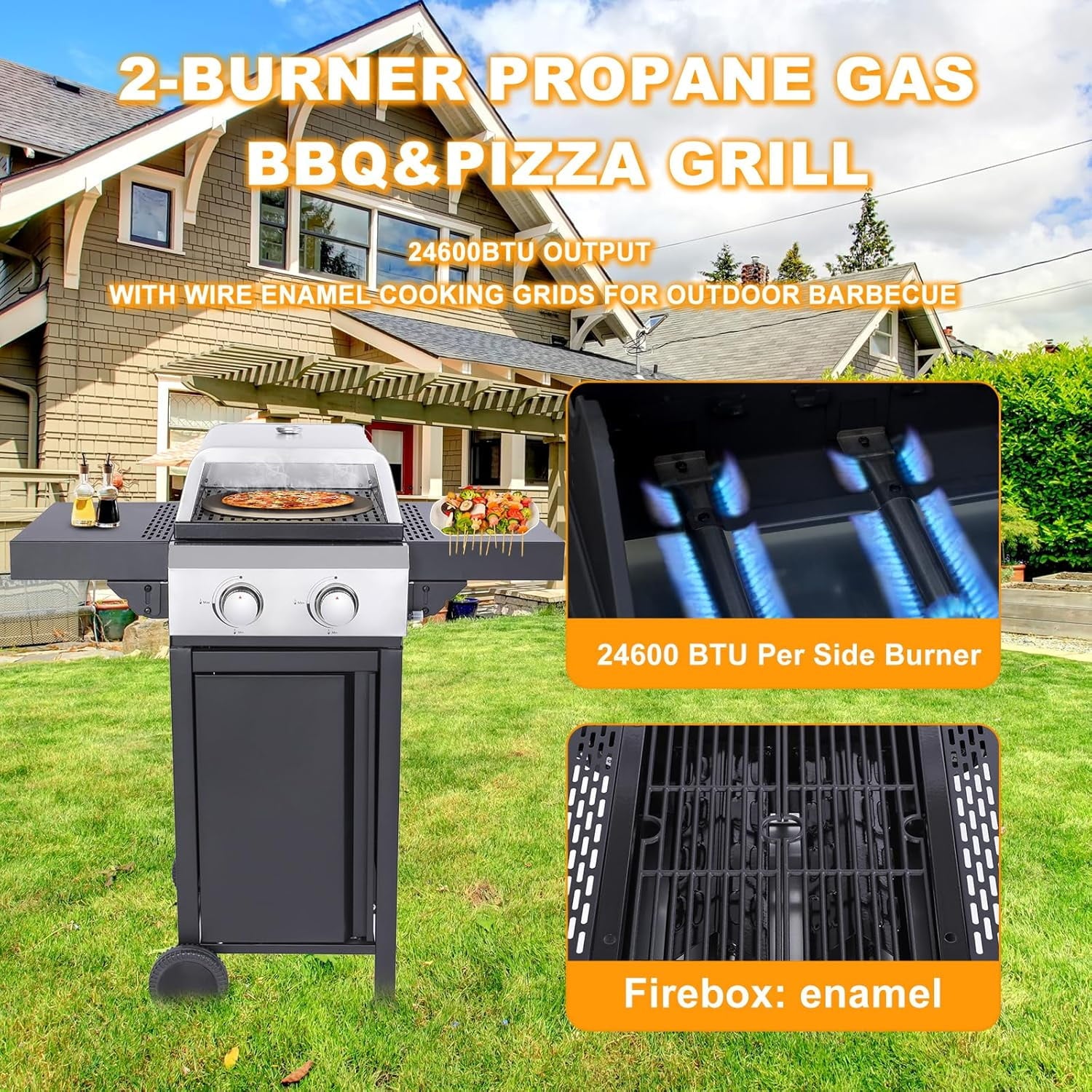 Introducing our 2-Burner Propane Gas BBQ Grill with Wire Enamel Cooking Grids & Pizza Box—innovatively designed to revolutionize your outdoor cooking experience. This versatile grill is equipped with powerful stainless steel burners that deliver an impressive 24,600 BTUs per hour, ensuring everything from sausages to steaks is grilled to perfection. The integrated ignition system allows for effortless start-ups with just a push and turn.