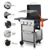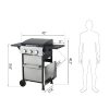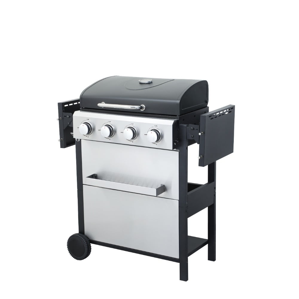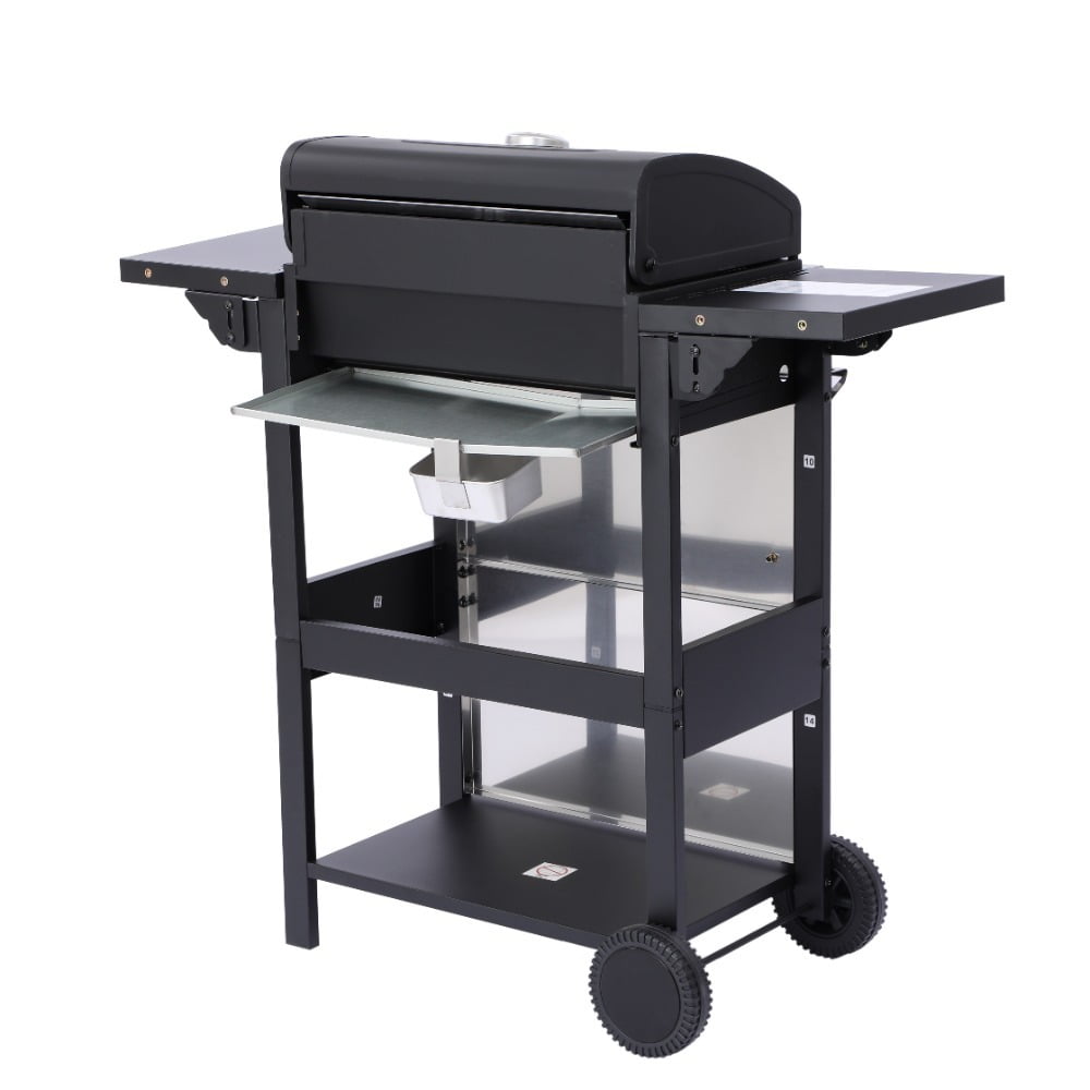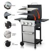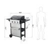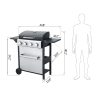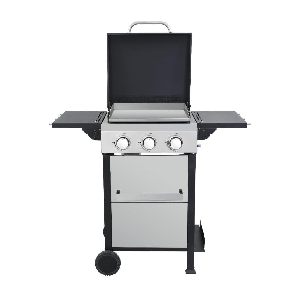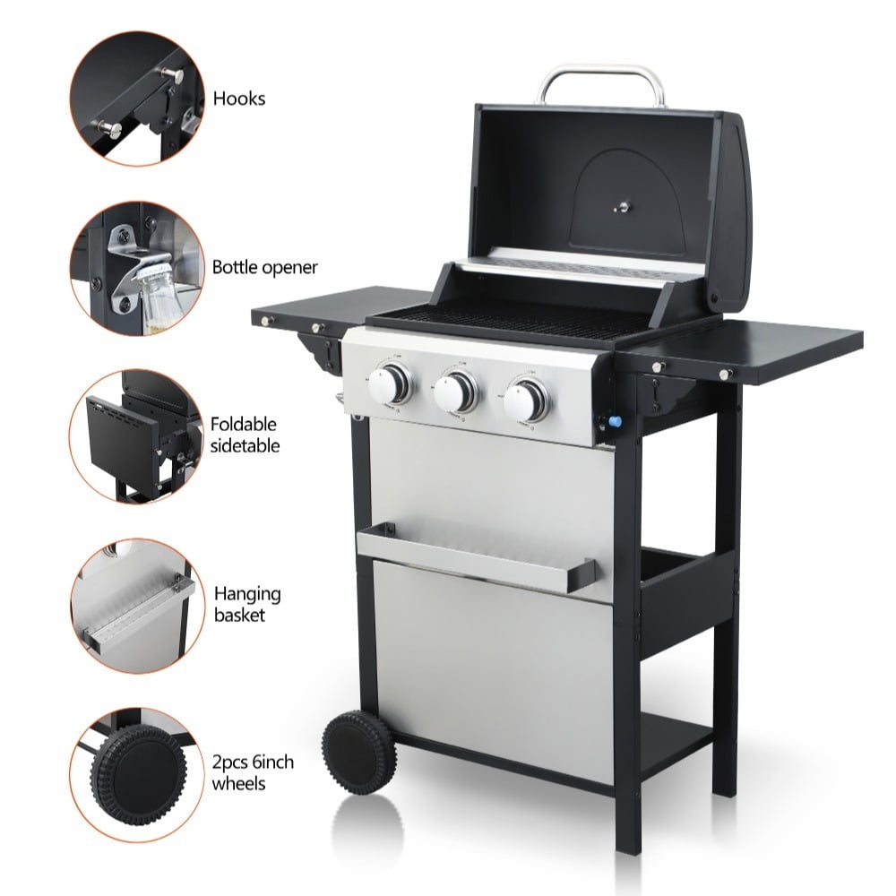 Master outdoor cooking with the 3-Burner Propane Gas Grill! Delivering 25,650 total BTUs (8,550 per burner), this grill heats rapidly for perfect searing while maintaining precise temperature control. The dual enamel-coated wire cooking grids (11.8″x13.2″ + 7.9″x13.2″) provide versatile cooking space and easy cleanup. Premium #430 stainless steel components – including the warming rack, bottle opener, and hooks – resist rust for lasting performance. Monitor heat levels effortlessly with the built-in stainless steel thermometer (100-800°F). Hosting is seamless: use the foldable powder-coated steel side table (10.2″x13.8″) for prep, hang utensils on 4 integrated hooks, and store accessories in the stainless steel hanging basket. The high-temp resistant powder-coated firebox (550°C/1022°F) ensures durability, while three enamel flame tampers distribute heat evenly. With two 6-inch wheels for mobility and push-button ignition for instant starts, this grill makes backyard BBQs effortless and delicious.