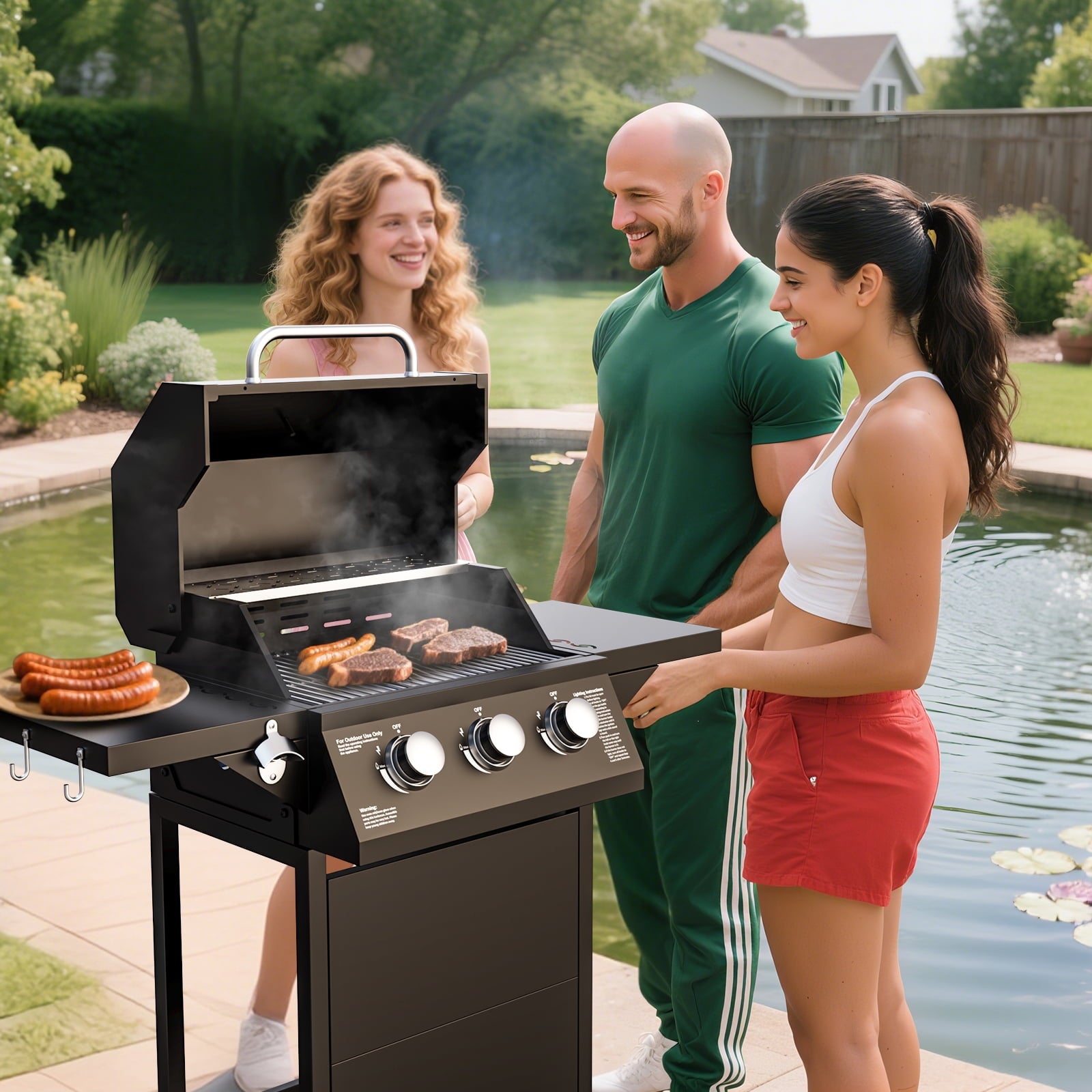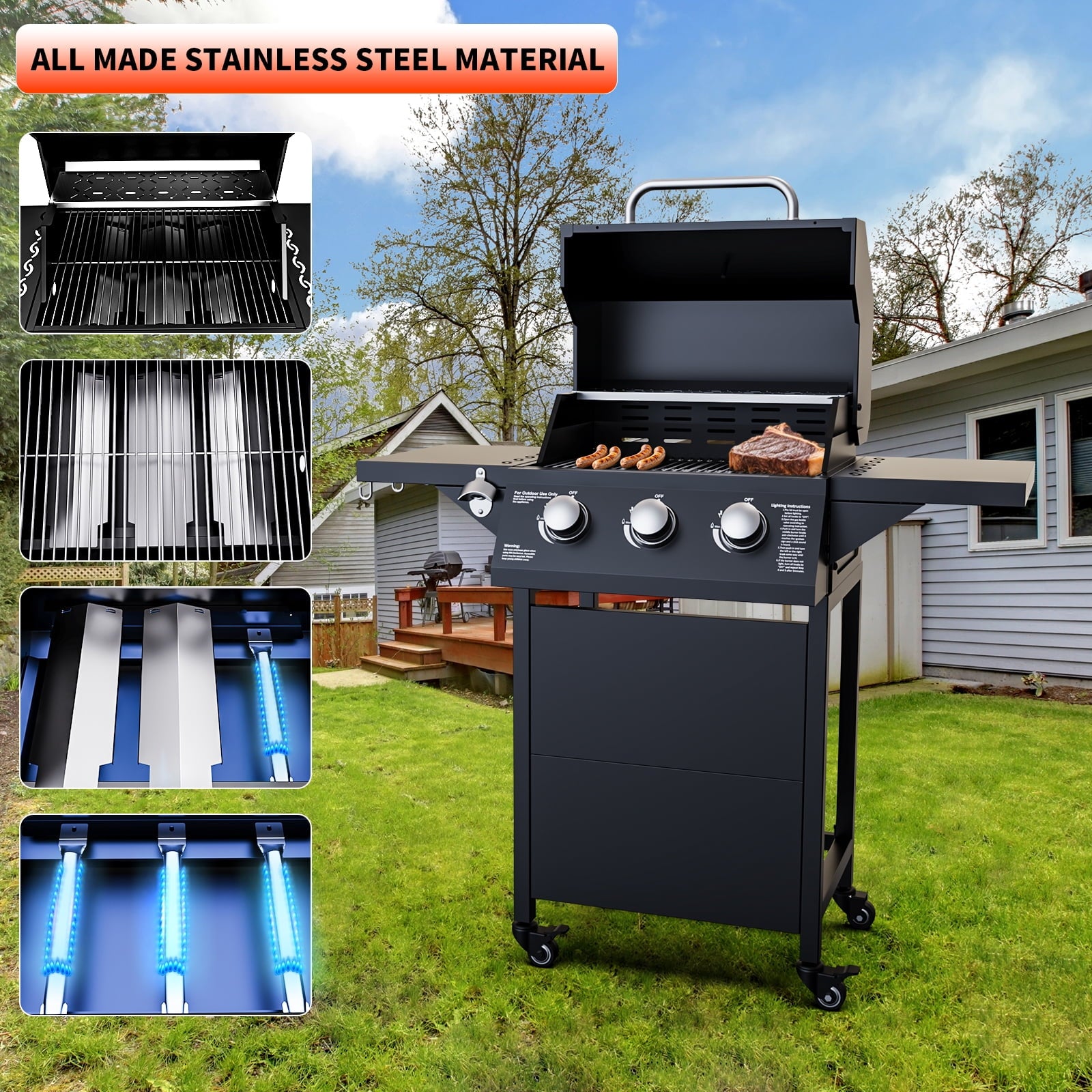 - Stainless Steel Burners:Powerful 30,000 BTU Cooking Performance – Equipped with 3 stainless steel burners, this propane gas grill delivers even heat distribution for perfect grilling, searing, and roasting.