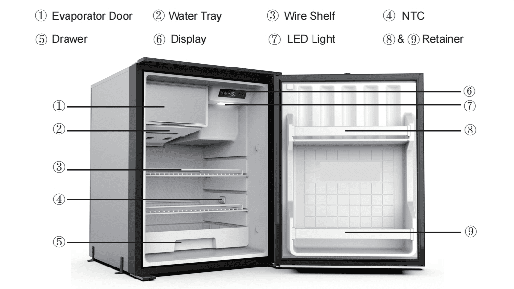 【User-friendly Design】The built-in LED light provides visibility and convenience. The removable door gasket allows for easy cleaning and maintenance. The door gasket can be easily removed for cleaning and maintenance, ensuring hygiene and cleanliness.The refrigerator has a sleep mode that enhances energy efficiency, making it an economical choice for families. User-friendly design enhances the overall experience of your RV journey, providing practicality and ease of use.