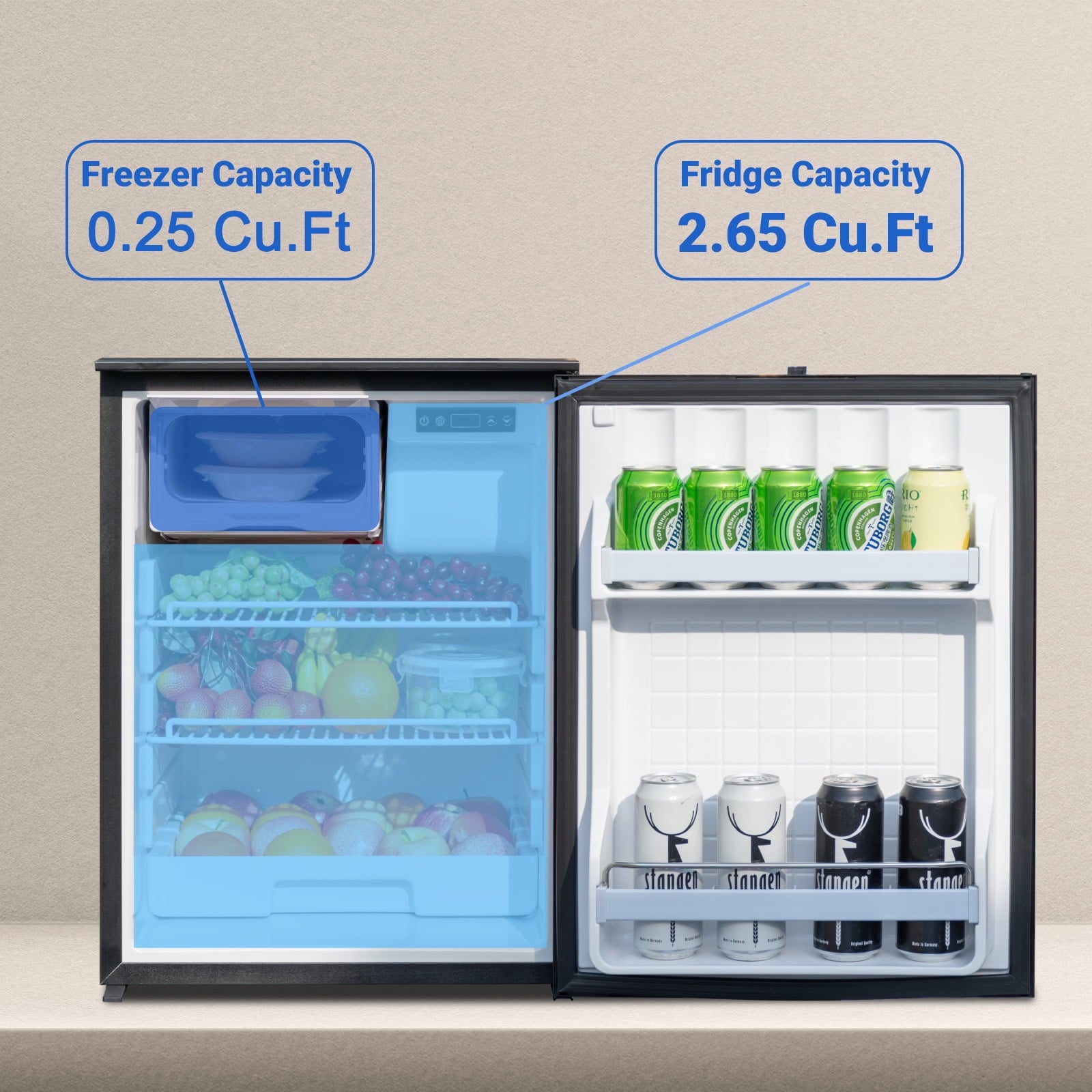 【Compact RV Refrigerator with Freezer】This RV refrigerator has a capacity of 3 Cu. Ft, including 2.65 Cu.Ft of refrigeration capacity and 0.25 Cu.Ft of freezer capacity, which can meet your RV food storage needs.(D*W*H)22.1*18.5*24.8 inches. Compact dimensions can meet the installation requirements of any RV, providing a space-saving solution and providing families with more functionality and convenience, ensuring a comfortable and enjoyable experience for everyone.