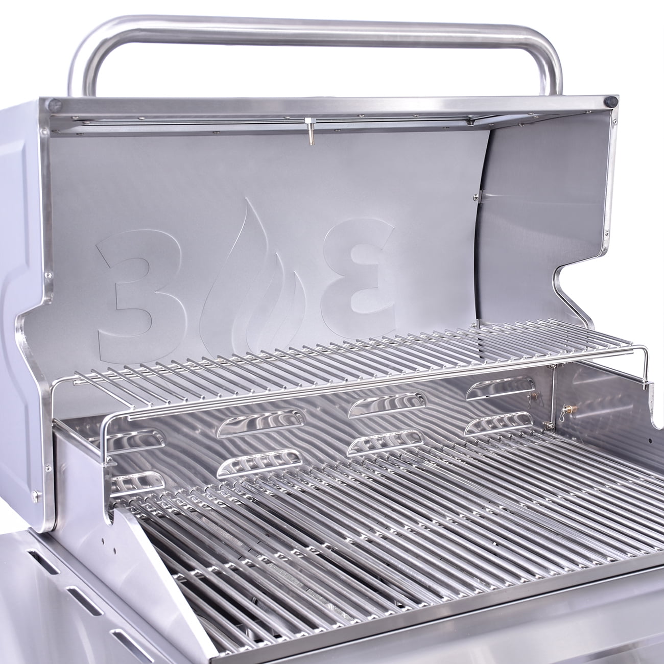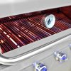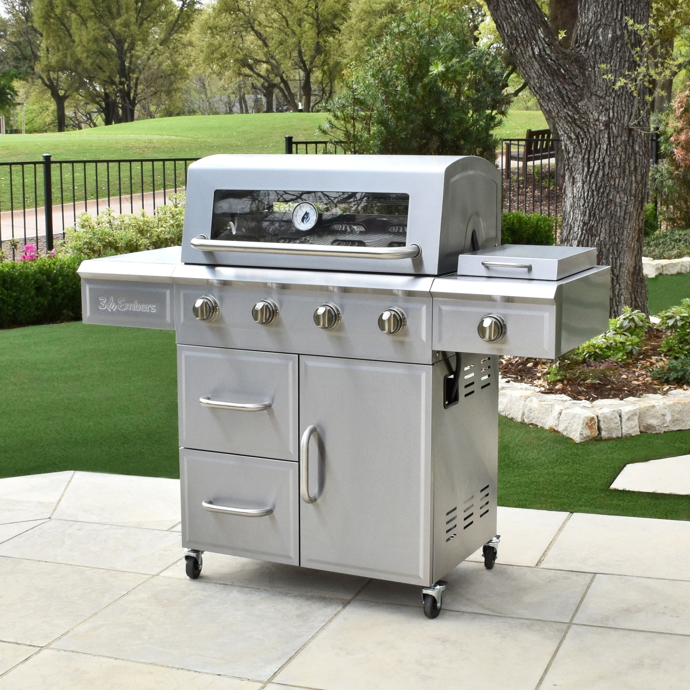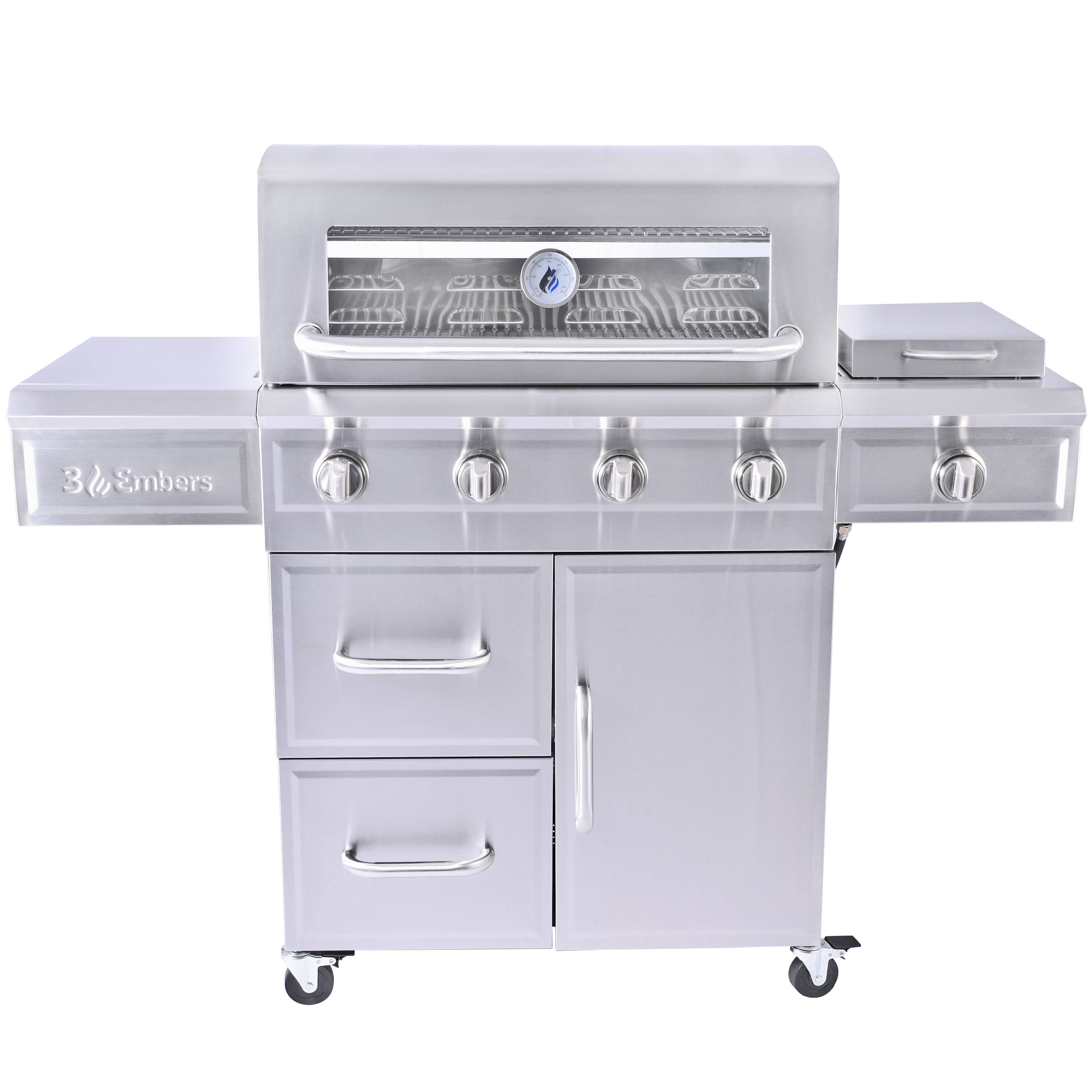 Make a statement by bring the high-end appliance look and performance outdoors with this 3 Embers 4-Burner Gas Grill. This 3 Embers grill offers 540 sq. in. of primary cooking space and 160 sq. in. of secondary cooking space. This grill also includes the Radiant Embers Cooking System, Heat Locking Insulation in the Lid and Firebox, and Ceramic-Titanium Coated Burners backed with a lifetime warranty. This grill is also equipped with an appliance grade glass viewing window, heavy duty stainless steel cooking grates, torch ignition, LED illuminated knobs, cast iron side burner, dual fuel valves, and pull-out drawers for storage.