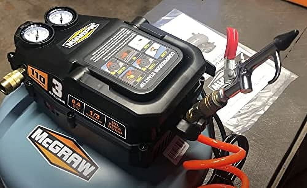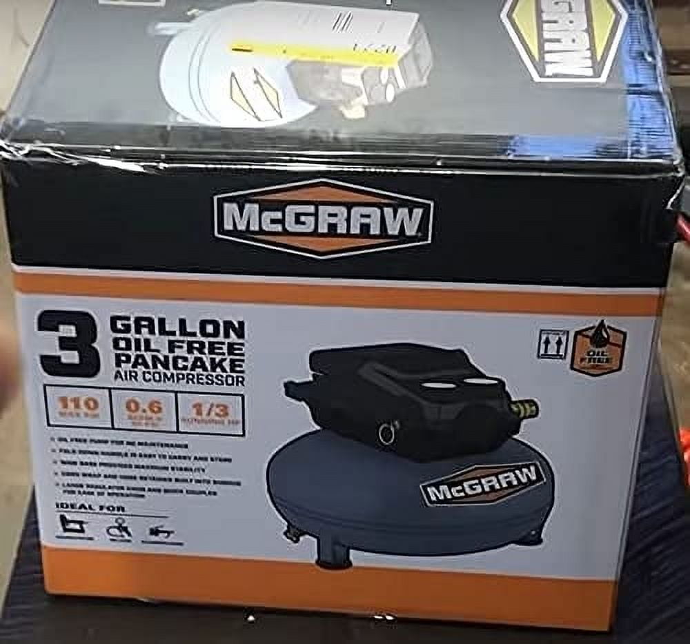 The McGraw 3 Gallon 1/3 HP 110 PSI Oil-Free Pancake Air Compressor features a low-profile pancake design for maximum stability. The compact size and light weight make it ideal for jobsite nailing/stapling, inflation, and cleaning. The compressor has an oil-free pump for no-maintenance operation.