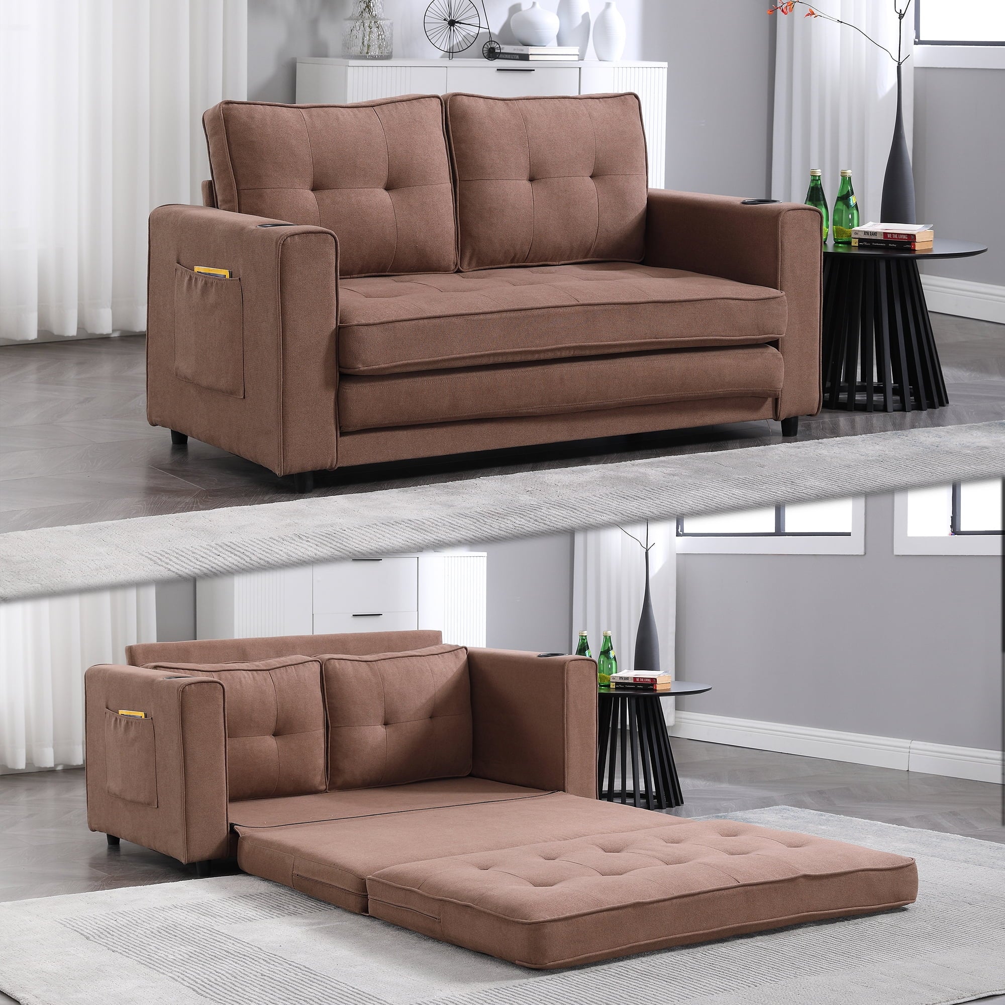 3-in-1 Upholstered Futon Sofa Convertible Floor Sofa bed,Foldable Tufted Loveseat with Pull Out Sleeper Couch Bed,Folding Mattres Love Seat Daybed W/Side Pockets for Living Room, Brown