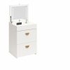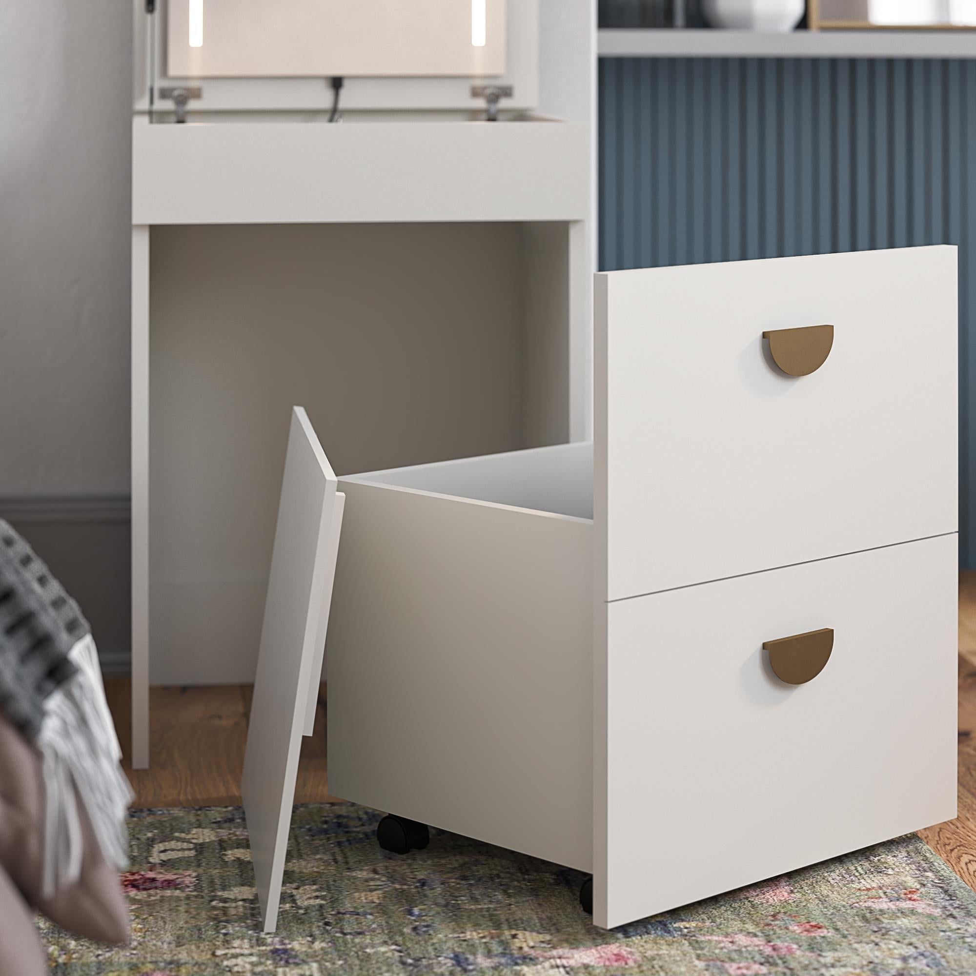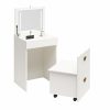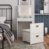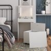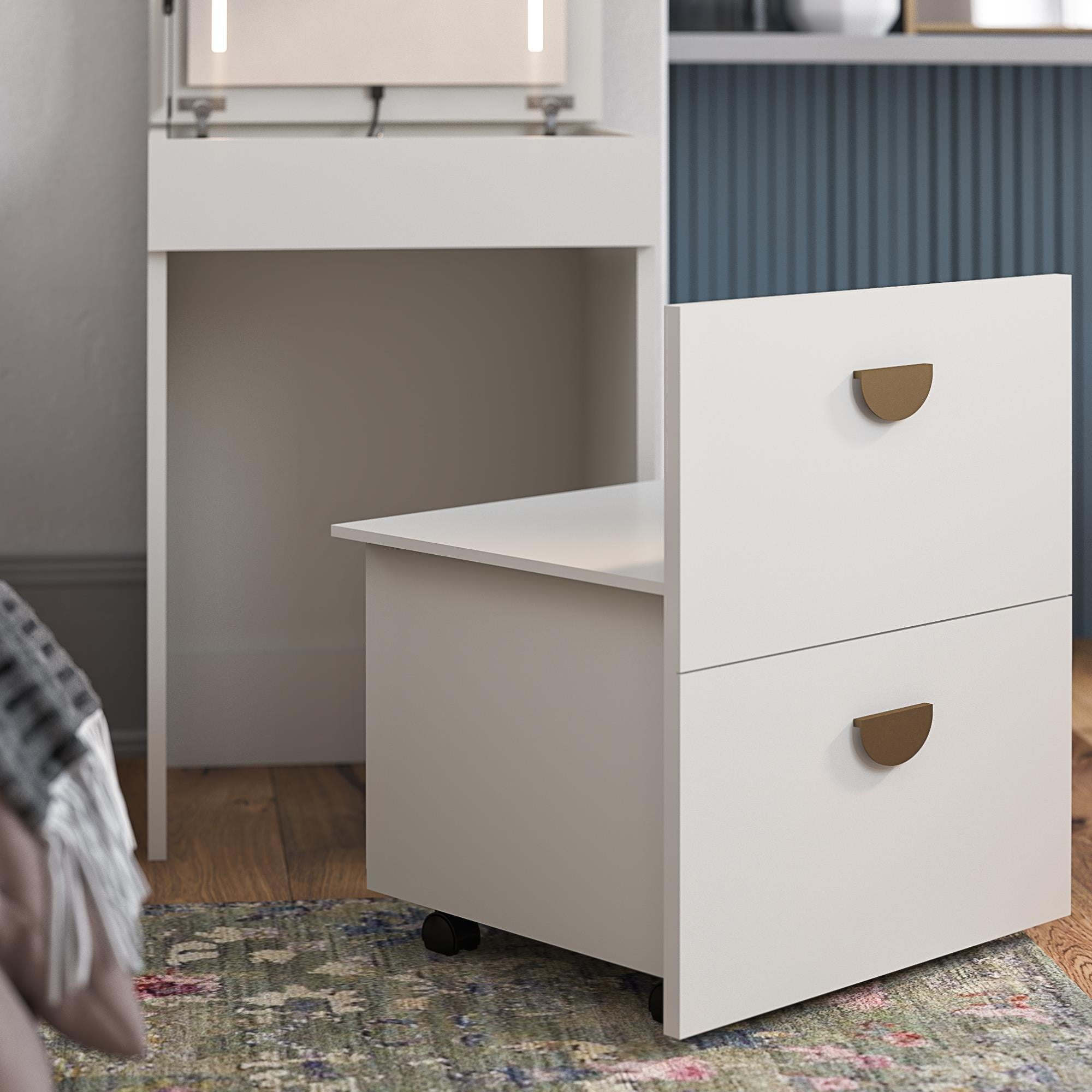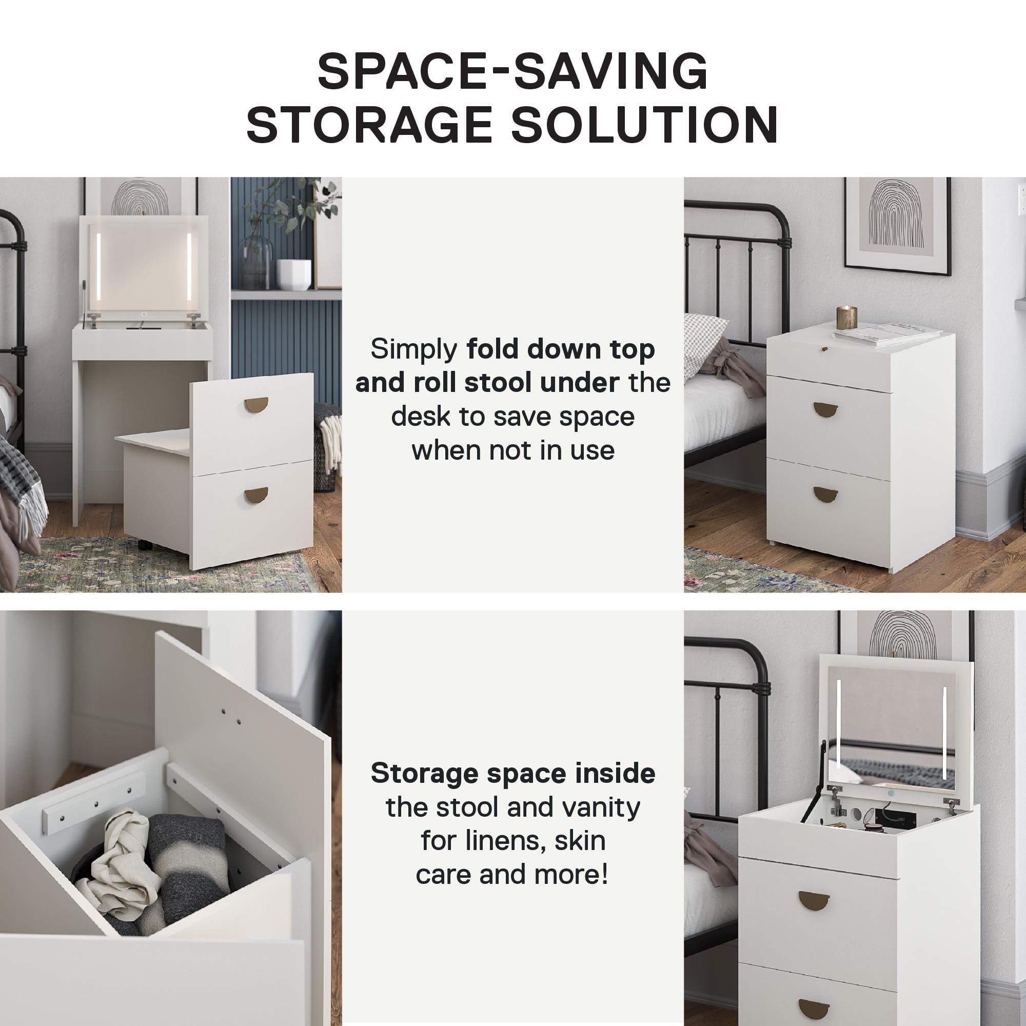 - HIDEAWAY SEAT ON WHEELS WITH SMART STORAGE: Includes a storage stool that rolls neatly under the vanity with a hidden compartment under the seat for organizing skincare, makeup, jewelry, hair tools, or desk supplies