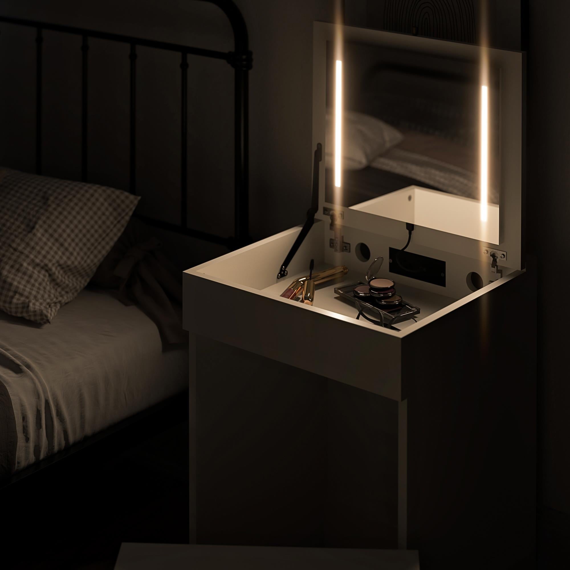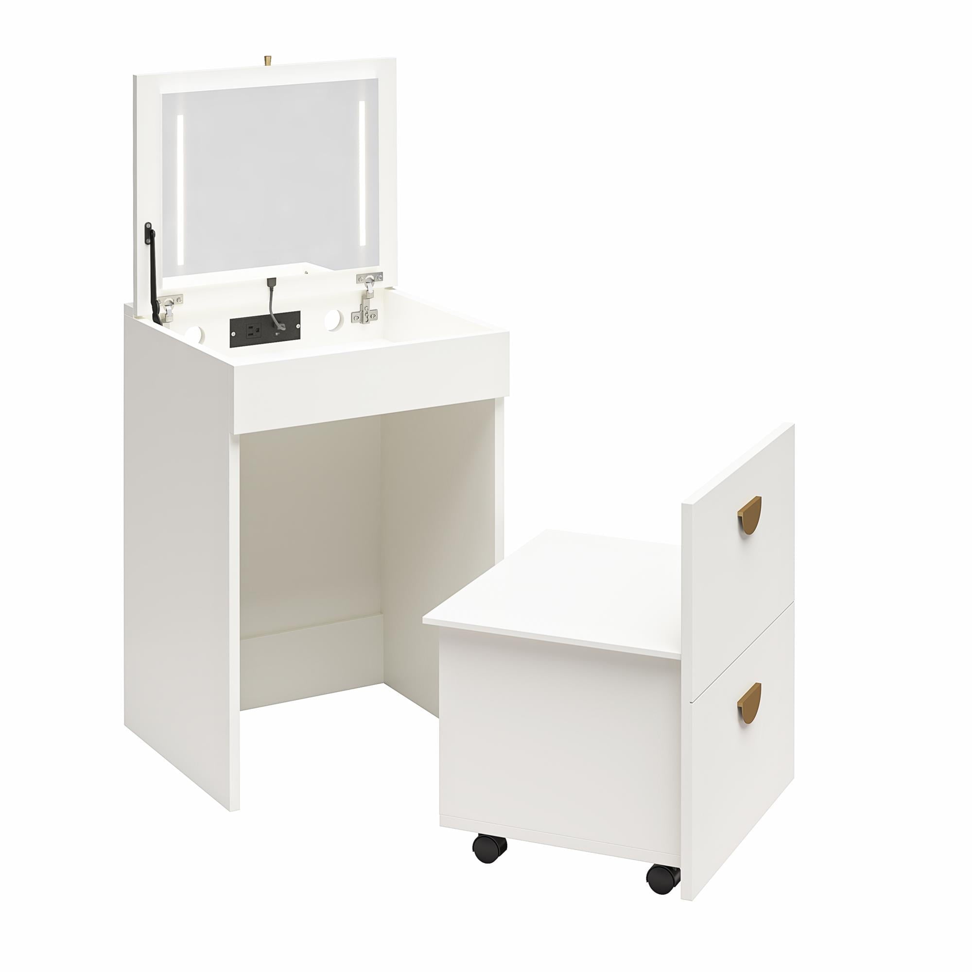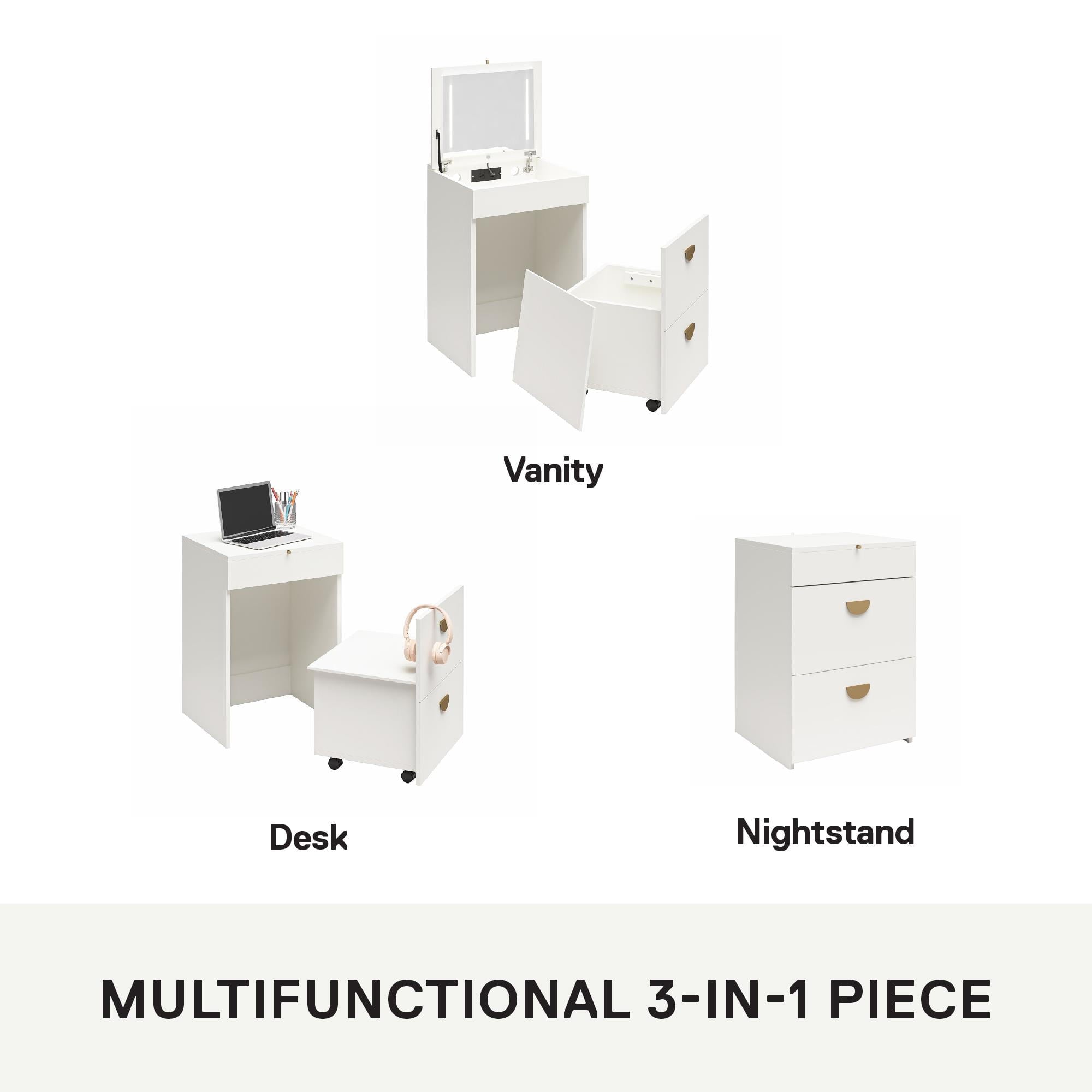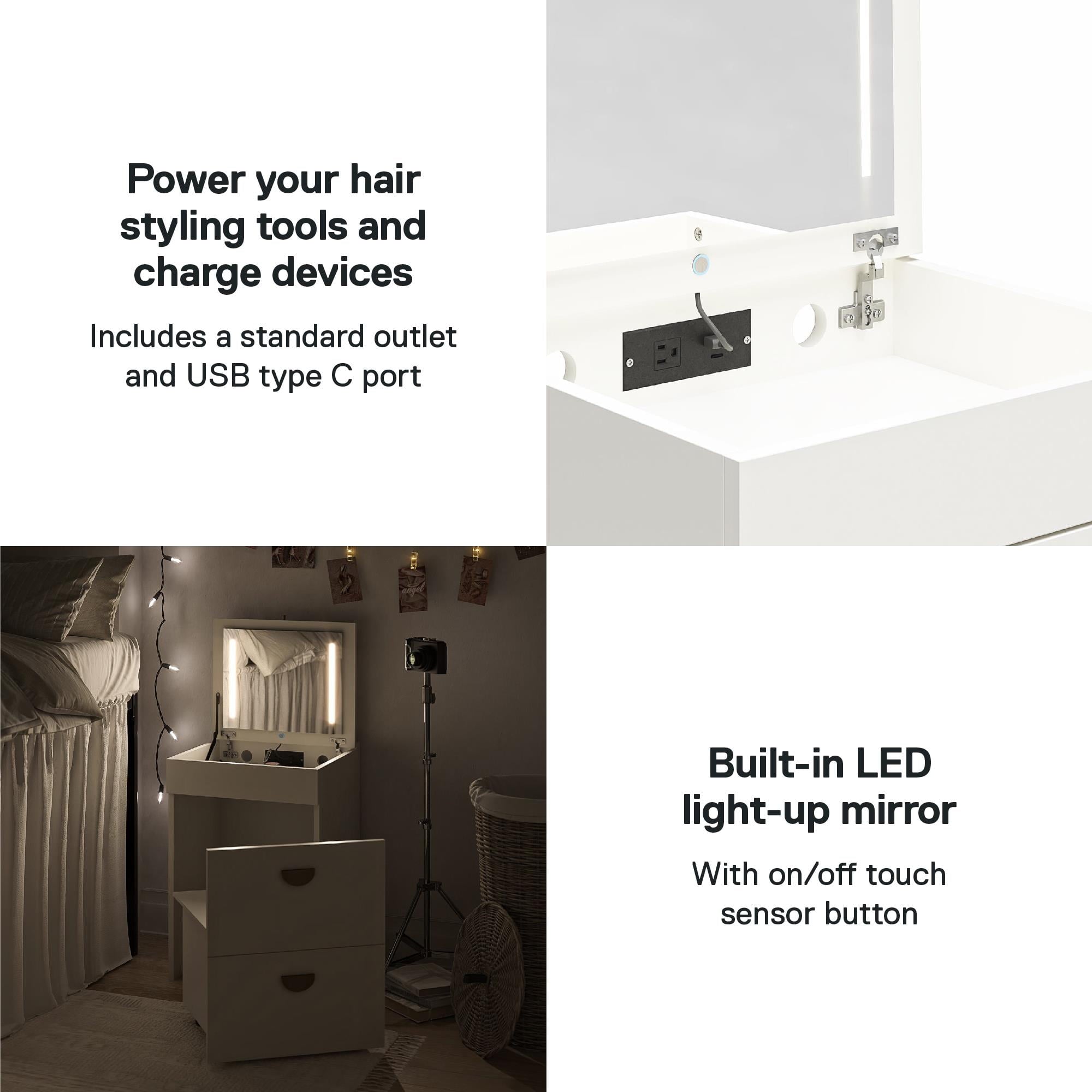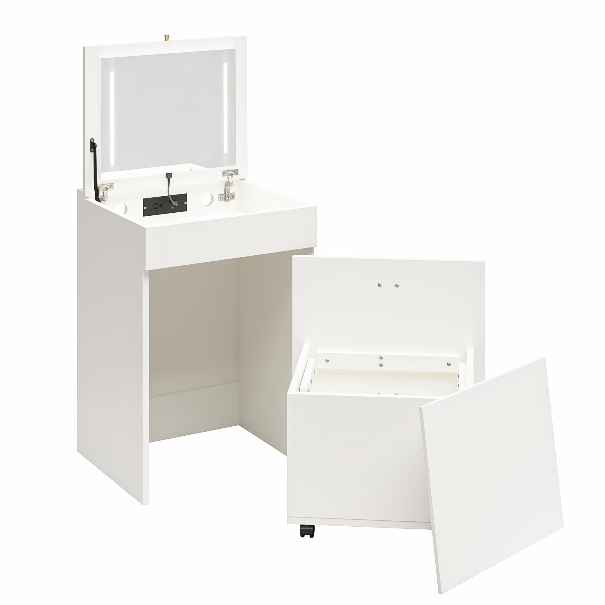 - COMPACT 3-IN-1 VANITY SET, MAKEUP STORAGE DESK & STOOL, MIRROR W/ LED LIGHTS & USB CHARGING STATION, WHITE: Transforms from a practical desk to a sleek dressing table in seconds; Vanity top lifts to reveal an LED lighted mirror with on/off touch sensor, perfect for makeup application and grooming