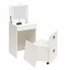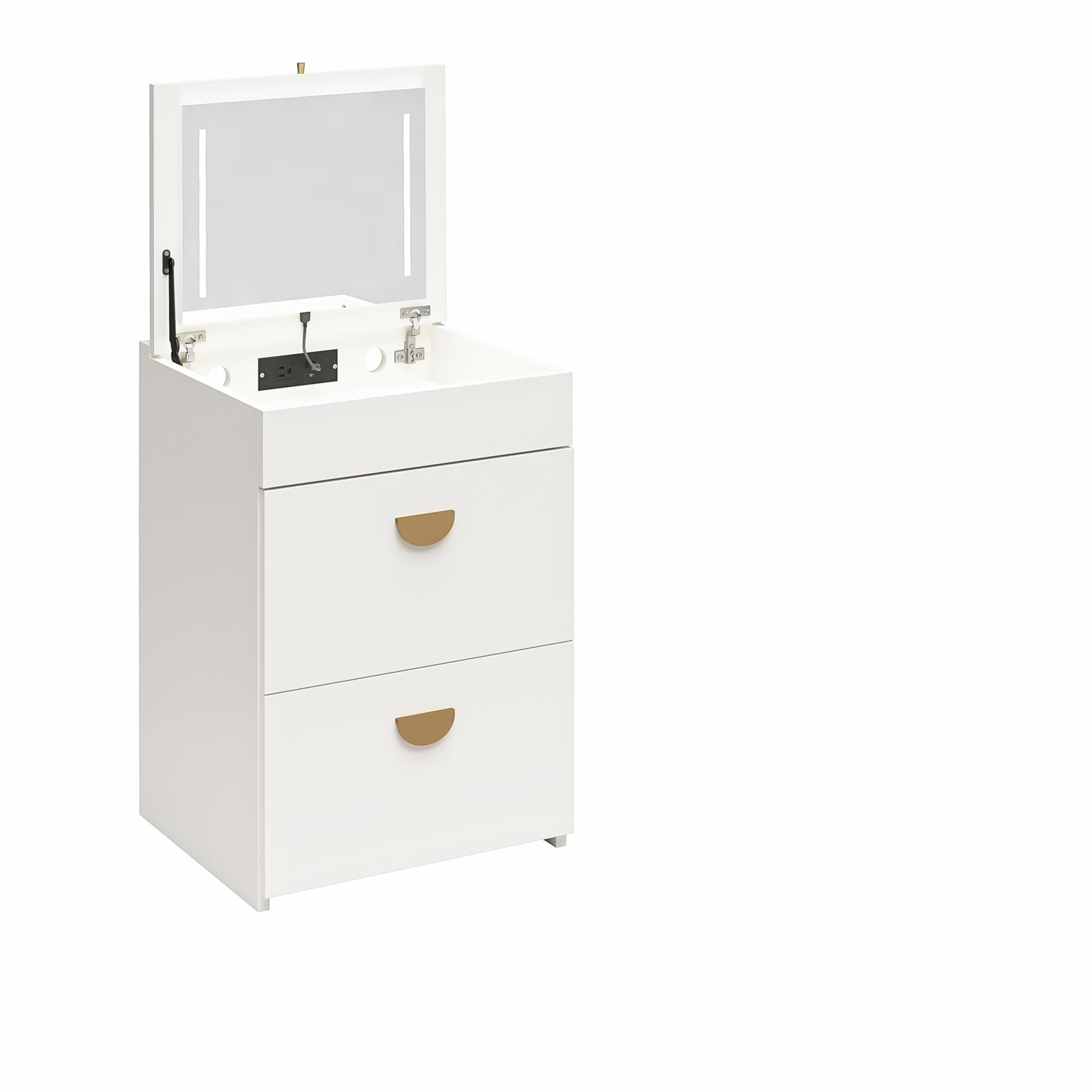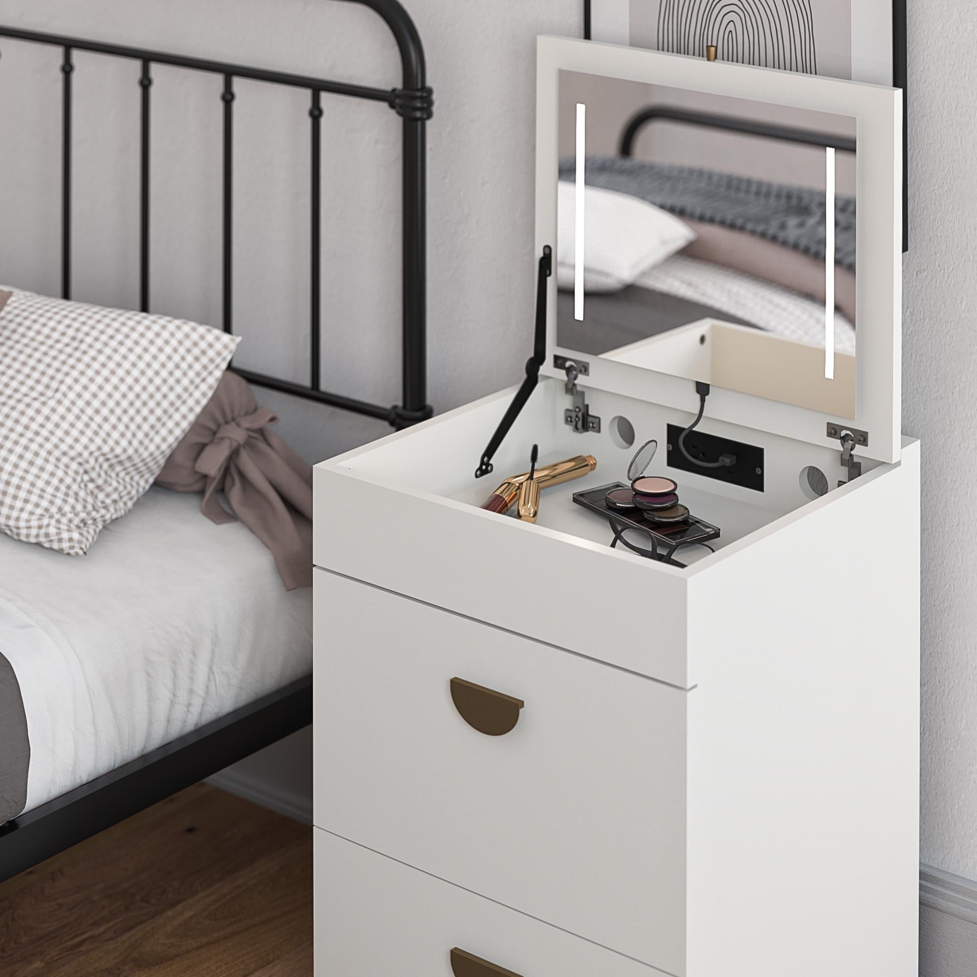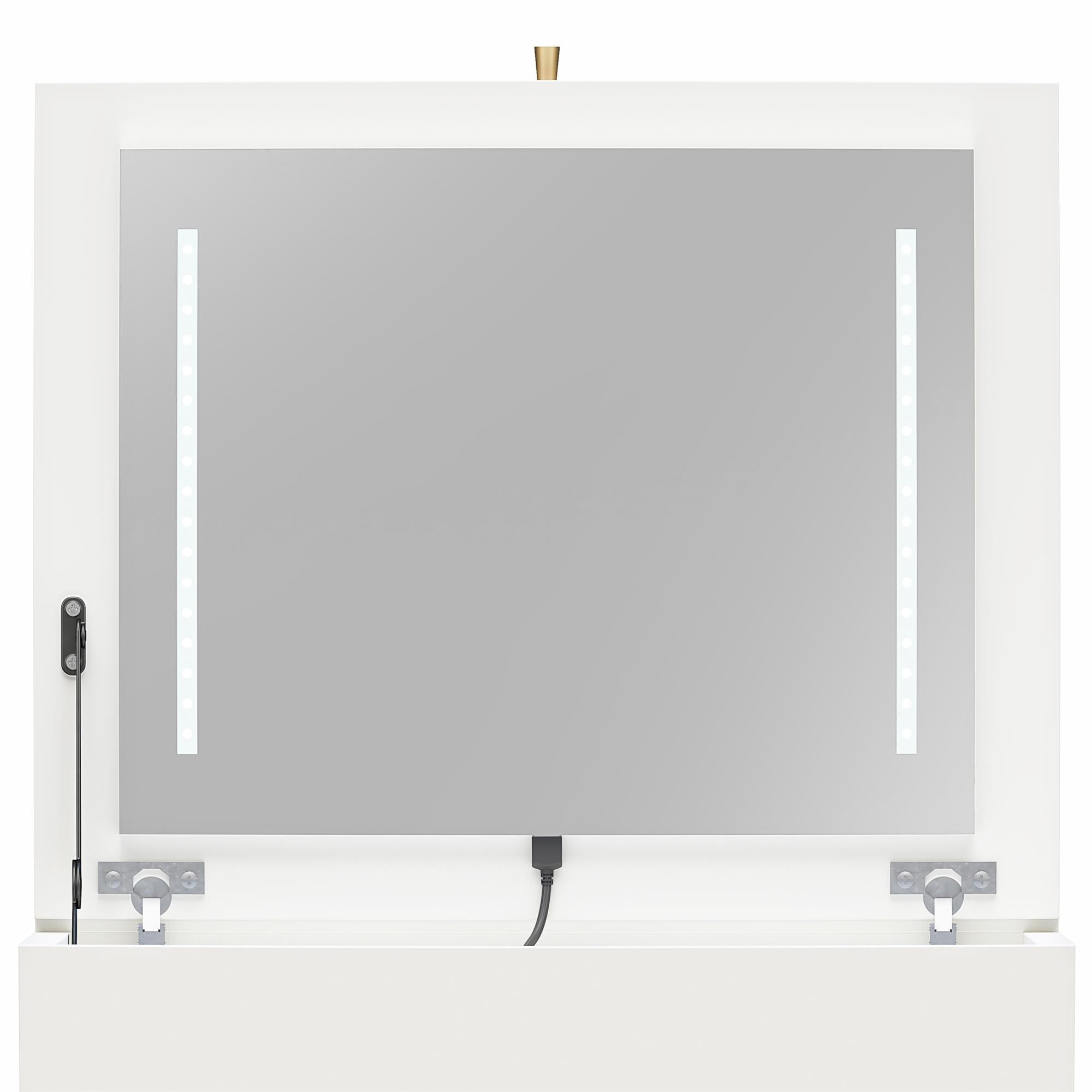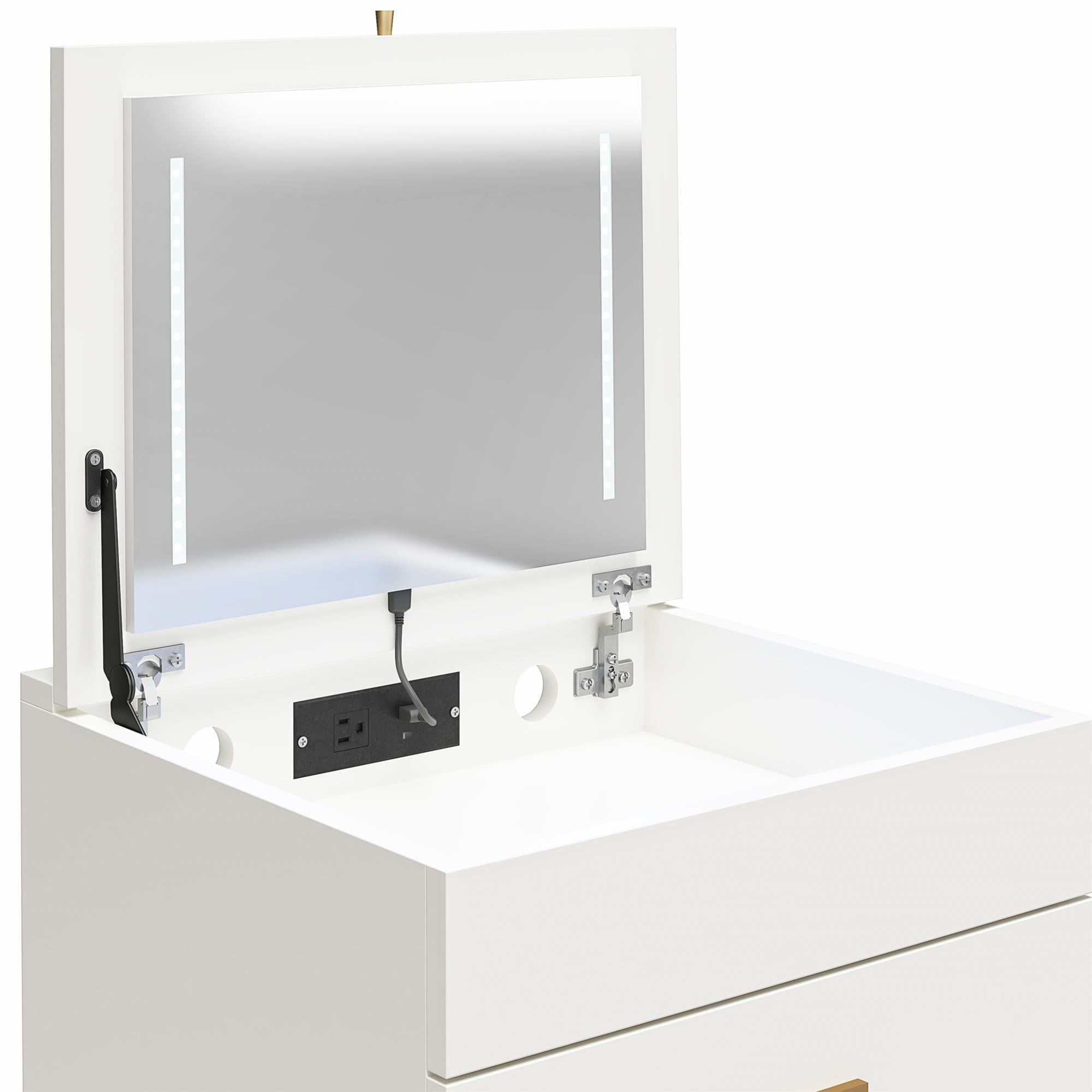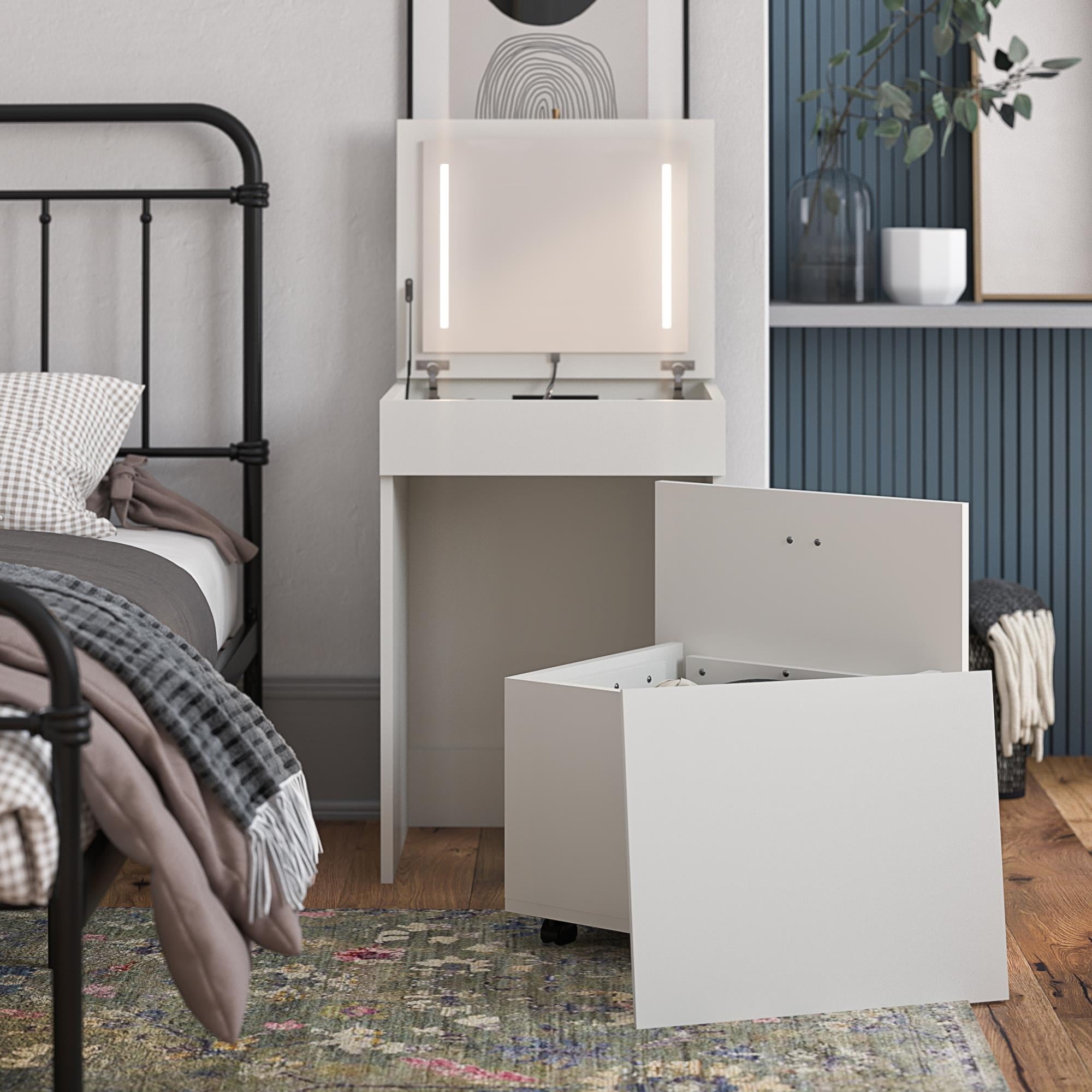 - COMPACT 3-IN-1 VANITY SET, MAKEUP STORAGE DESK & STOOL, MIRROR W/ LED LIGHTS & USB CHARGING STATION, WHITE: Transforms from a practical desk to a sleek dressing table in seconds; Vanity top lifts to reveal an LED lighted mirror with on/off touch sensor, perfect for makeup application and grooming