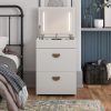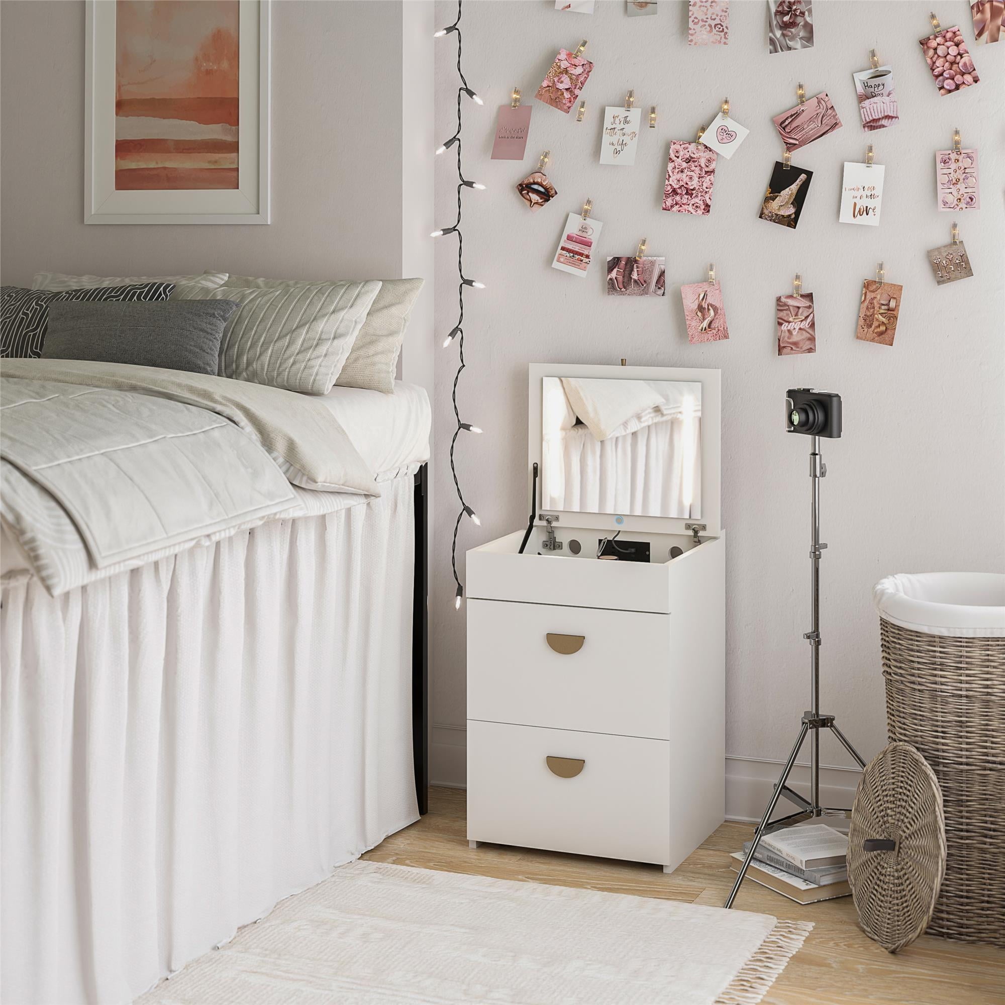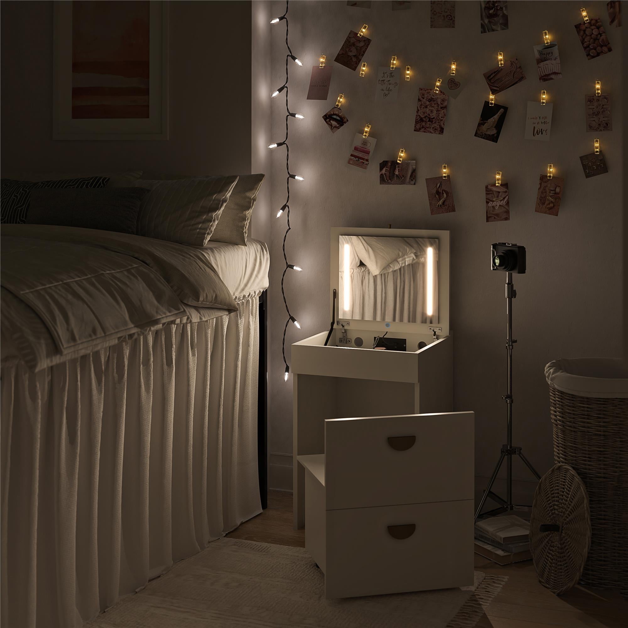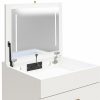 Imagine waking up every morning to the Ameriwood Home 3-in-1 Vanity Set and Makeup Desk with Storage Stool, LED Lighted Mirror, and USB Charging Station. It’s like having your own personal glam squad and workspace rolled into one! This versatile piece is not just a small makeup vanity desk with mirror and lights; it’s your morning motivator and productivity partner. With its compact design and practical features, you’ll start each day feeling organized, stylish, and ready to conquer whatever comes your way. Transform from a sleek dressing table to a practical desk in seconds. The vanity mirror with lights and desk combo is perfect for those who need a space that adapts to their needs. The LED strips on either side of the mirror can be turned on or off with a simple touch sensor button, giving you the perfect lighting for makeup application or late-night study sessions. The vanity stool with storage is a clever addition. When not in use, the stool tucks neatly under the vanity top, making it look like a chic two-drawer unit. Lift the lid of the stool to reveal hidden storage ideal for organizing skincare, makeup, jewelry, or even your study materials and desk supplies. As an added bonus, the makeup vanity desk features a convenient outlet equipped with one standard plug for your laptop, as well as one USB-A, and one USB-C port, to keep your tablet, cell phone, or wireless earbuds charged and ready to go! Constructed from durable engineered wood and finished in a crisp neutral laminate with gold hardware and glamorous half-moon pulls, the space-saving set adds a touch of elegance to any room. This petite 3-in-1 piece is a productivity powerhouse, making it a superb choice for teens, tweens, and young adults who desire a sleek and functional space. The vanity must be secured to the wall for stability, ensuring it stays put no matter how busy your mornings get.