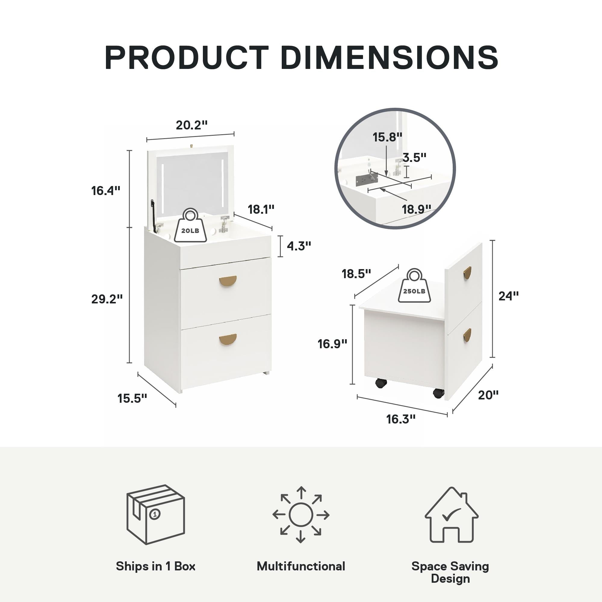 - ITEM DETAILS: Dimensions: 20.25″ W x 18.12″ D x 29.2″ H; Seat size & storage: 18.54″ W x 16.3″ D x 16.97″ H, Vanity storage: 18.9″ W x 15.82″ D x 3.54″ H; Max weights: Vanity Top: 40 lbs.; Vanity Storage: 20 lbs.; Stool: 250 lbs.