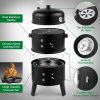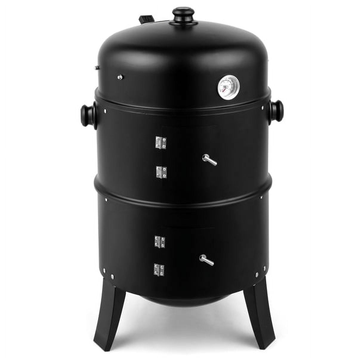 Enjoy the outdoor grilling fun with our vertical smoker!This vertical smoker combines 3-in-1 use of fire pit, BBQ grill and smoker, which is suitable for BBQ, grill, Smoke, Roast and braise. It is easy to control the heat through a damper system. It allows you to control the heat inside without lifting the lid. And the built-in thermometer is designed to inform the inside temp to preserve the good tastes of food. And the charcoal can be added through the bottom access door while the upper one for checking in on your food. This vertical smoker is compact and portable through the heat-insulating handles.