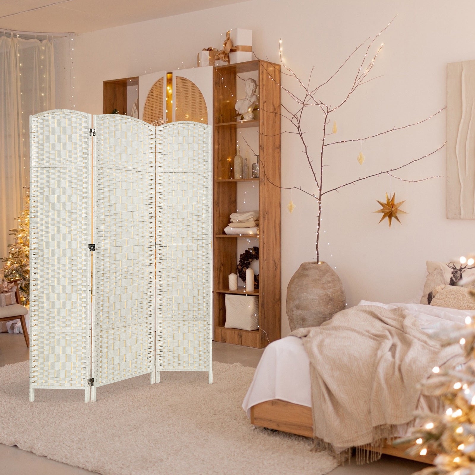 Our versatile and stylish Room Divider! This 3-panel wooden partition is designed to provide you with the utmost privacy and flexibility in dividing your space.
