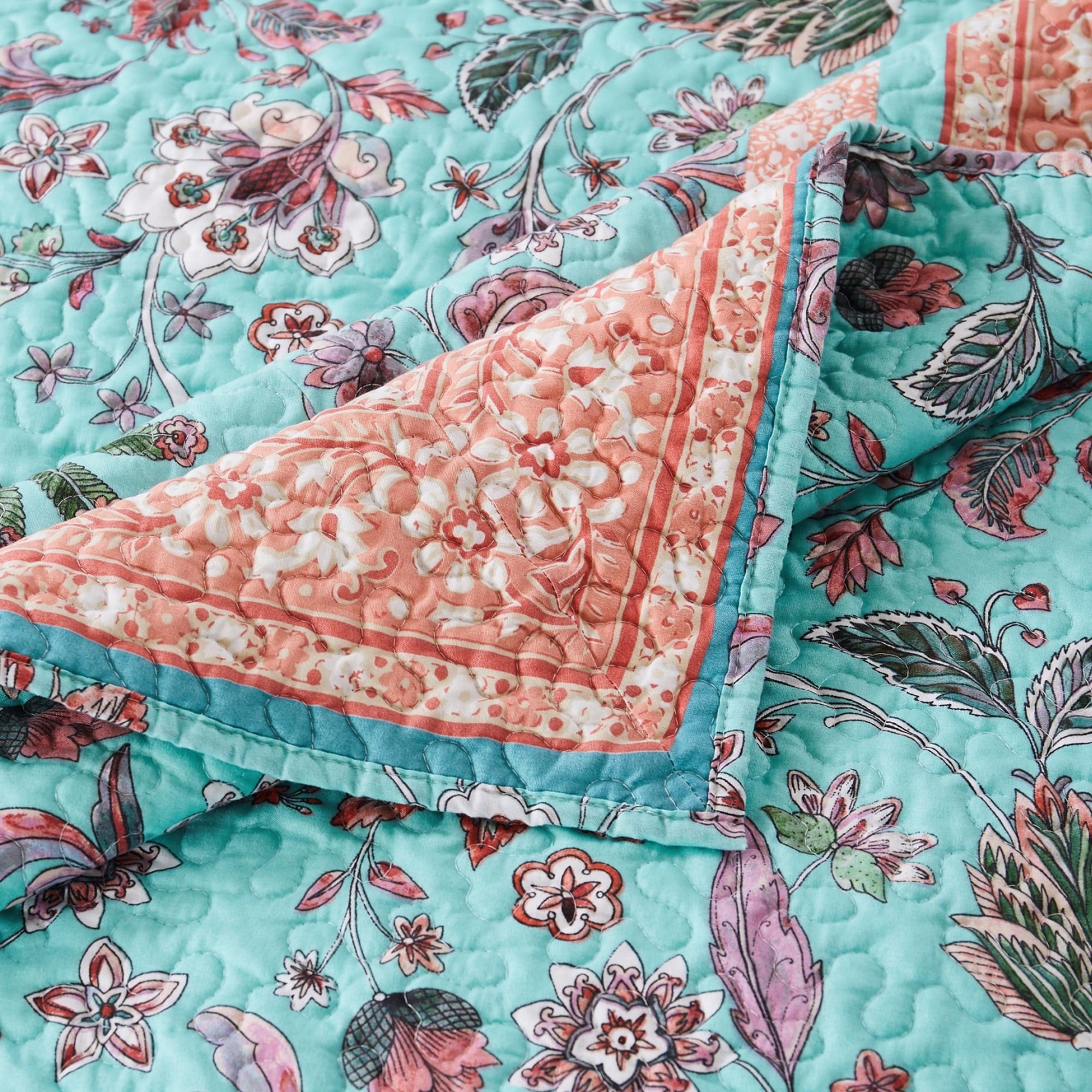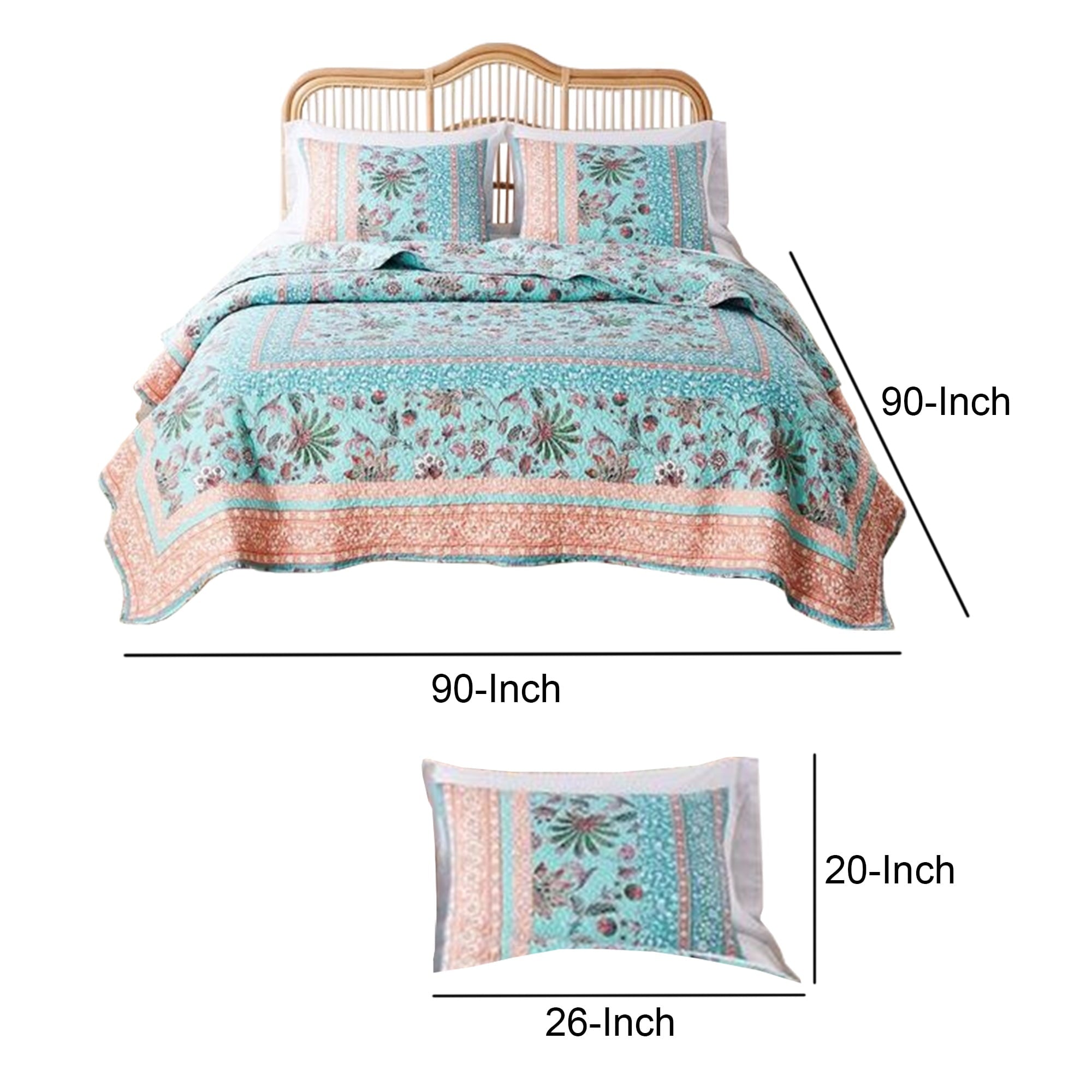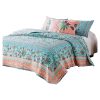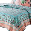 Bring tropical vibe to your bedding with this appealing 3 Piece Full Queen Quilt Set. Incorporating a turquoise base with floral prints, the quilt reverses to an all over Jacobean print. Machine quilted for durability, this machine washable quilt set features cotton and polyester filling for unmatched comfort.