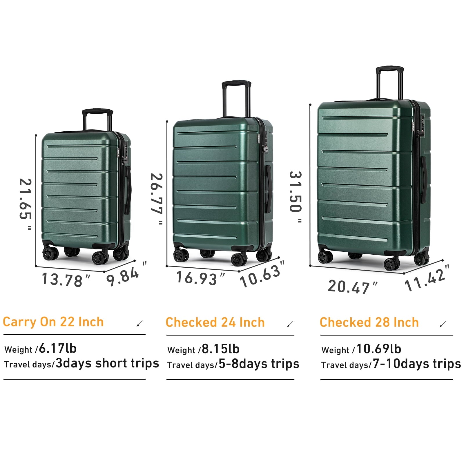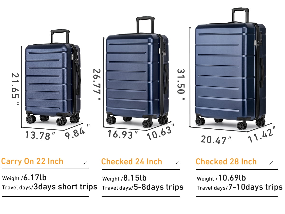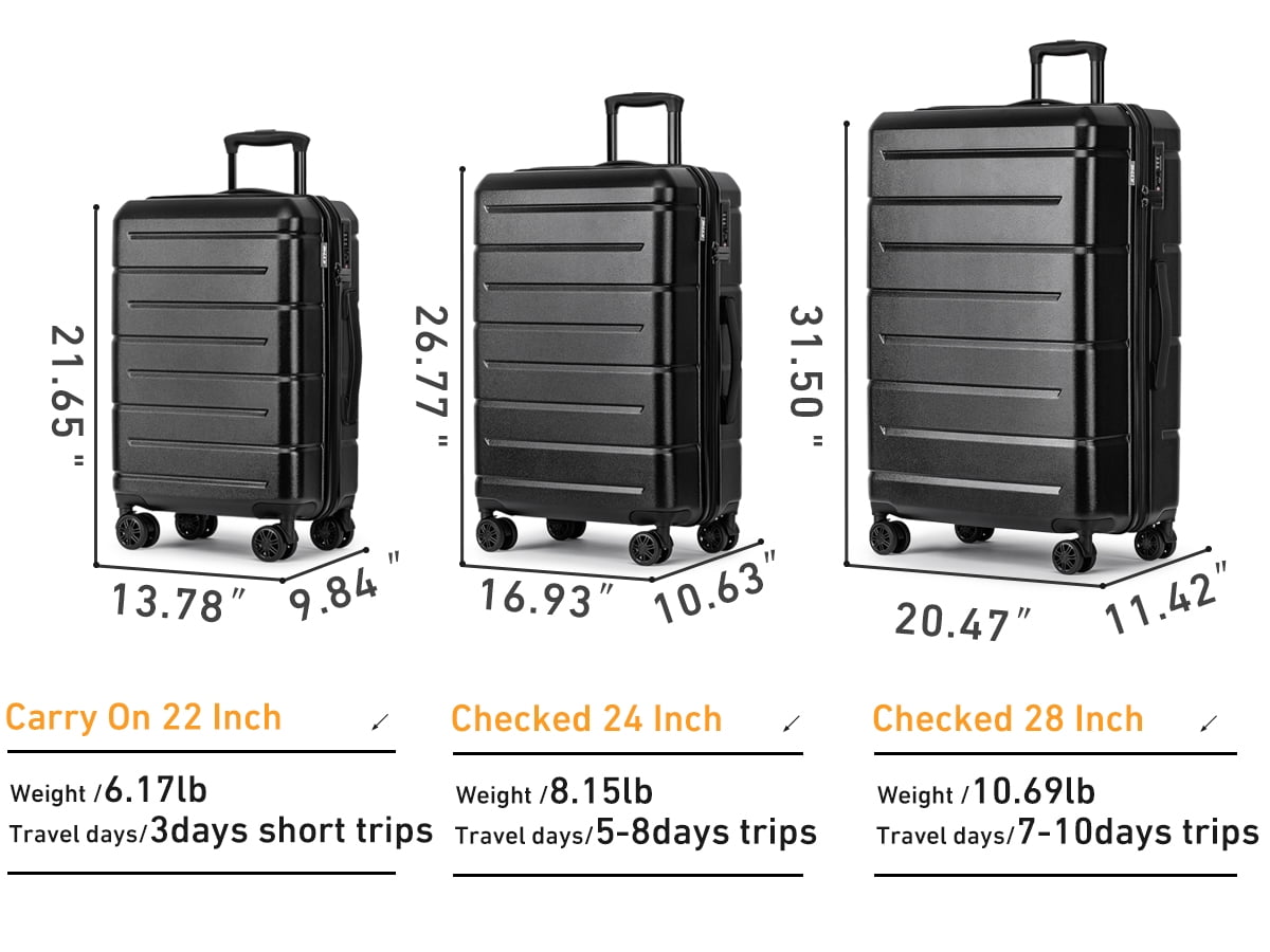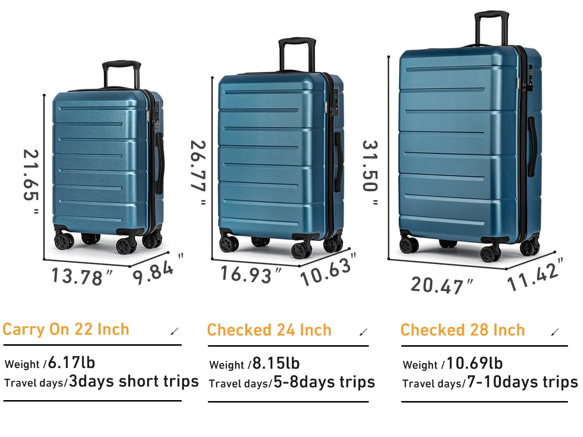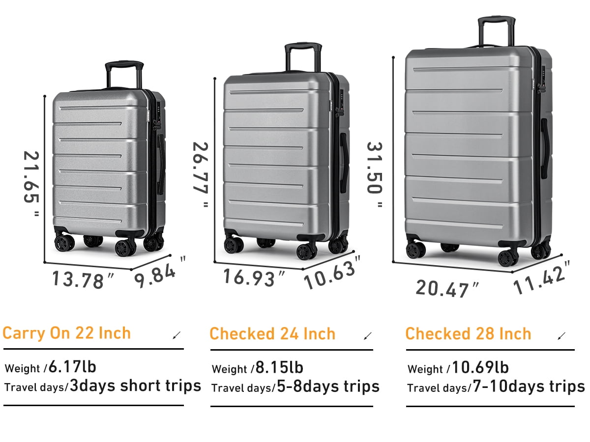 3 Piece Luggage Sets Includes 22″ Carry On(23.22″ x 14.56″ x 9.44″,6.17lbs),26” Checked Medium Luggage(26.77″ x 16.93″ x 10.63,8.15lbs) and 30″ Checked Large luggage(31.50″ x 20.47″ x 11.42″,10.69lbs)