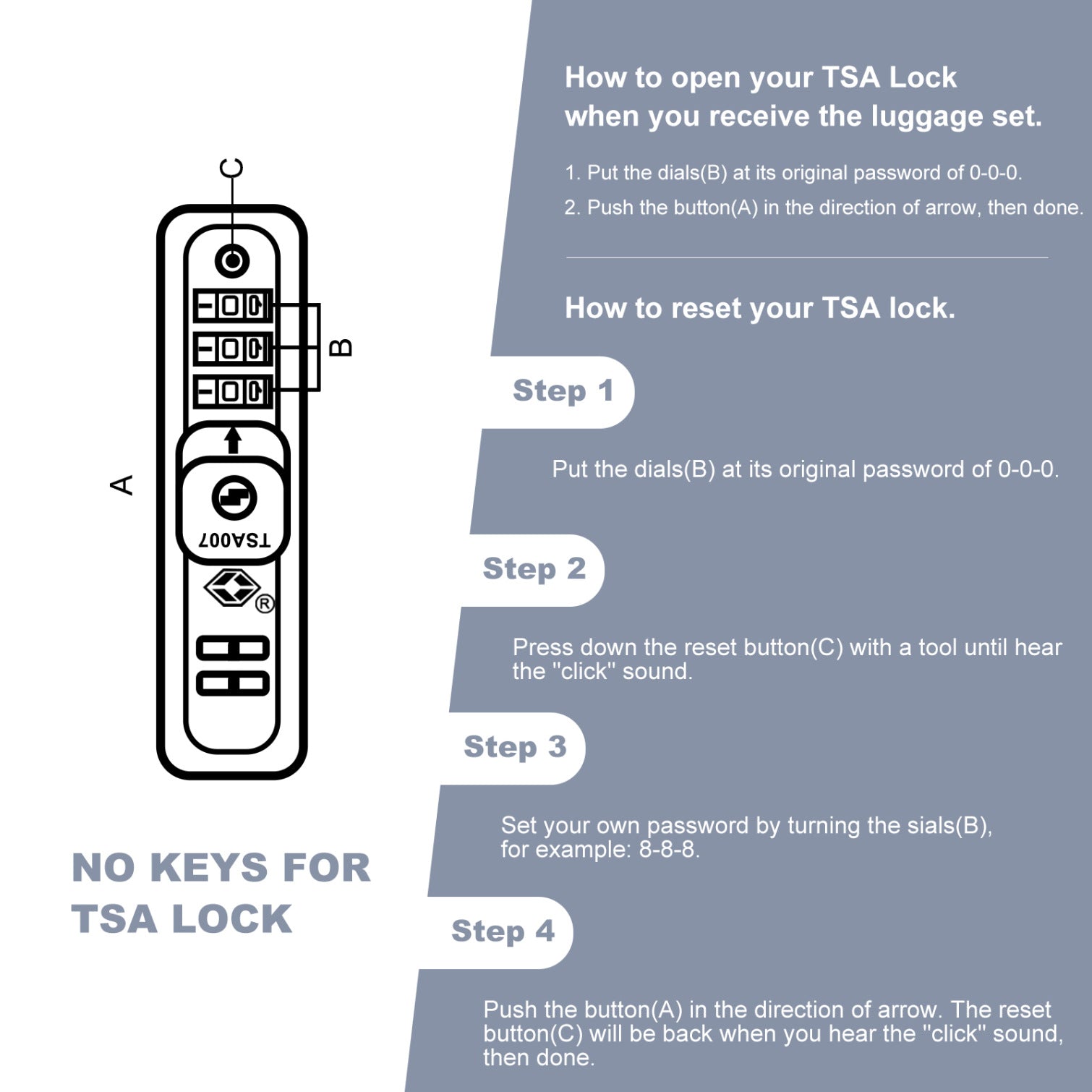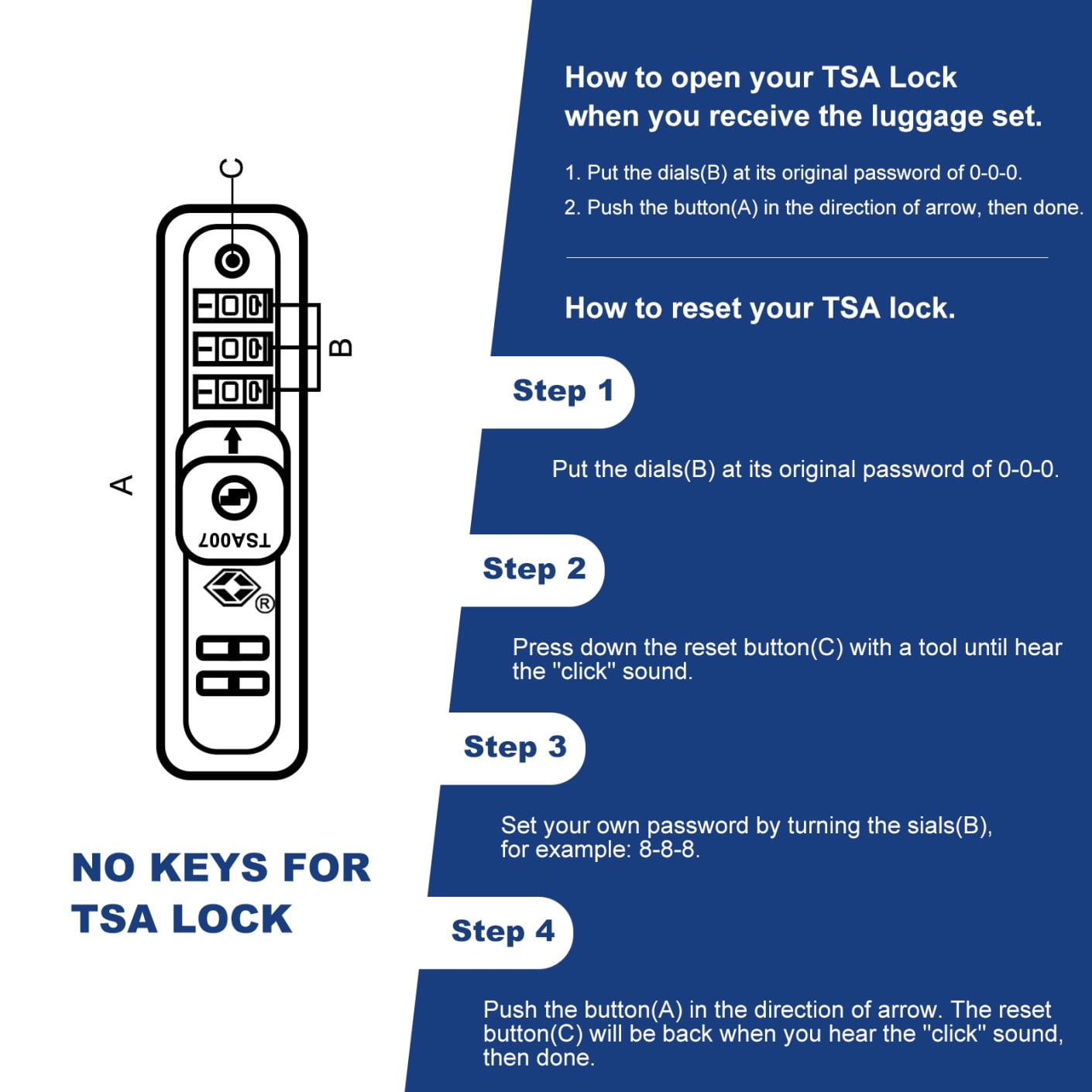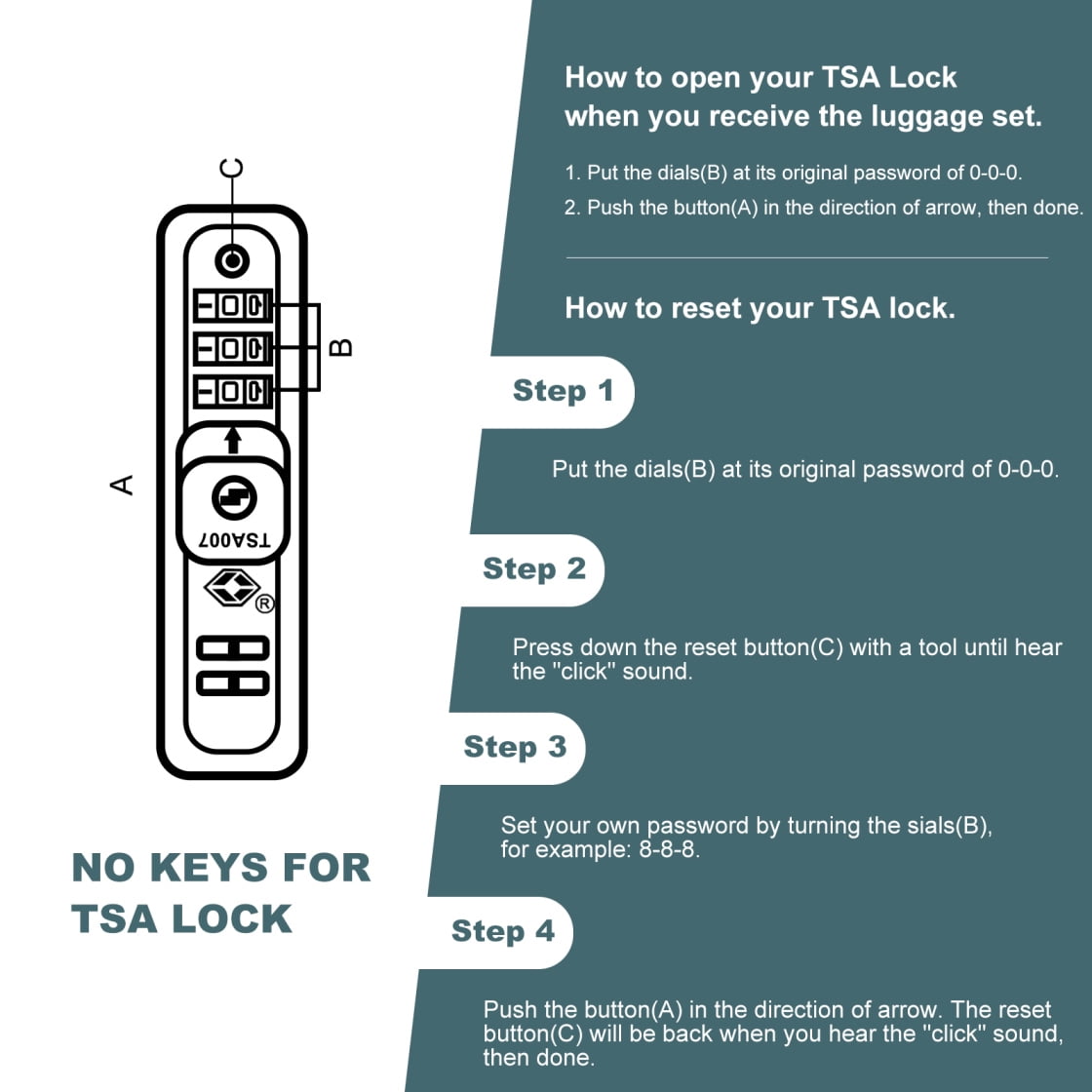 - [Secure TSA Lock]TSA lock allows only customs agents to inspect your luggage without damaging the lock when traveling and protects your stuffs in luggage and privacy more better. Simply set the combination. No keys are required.