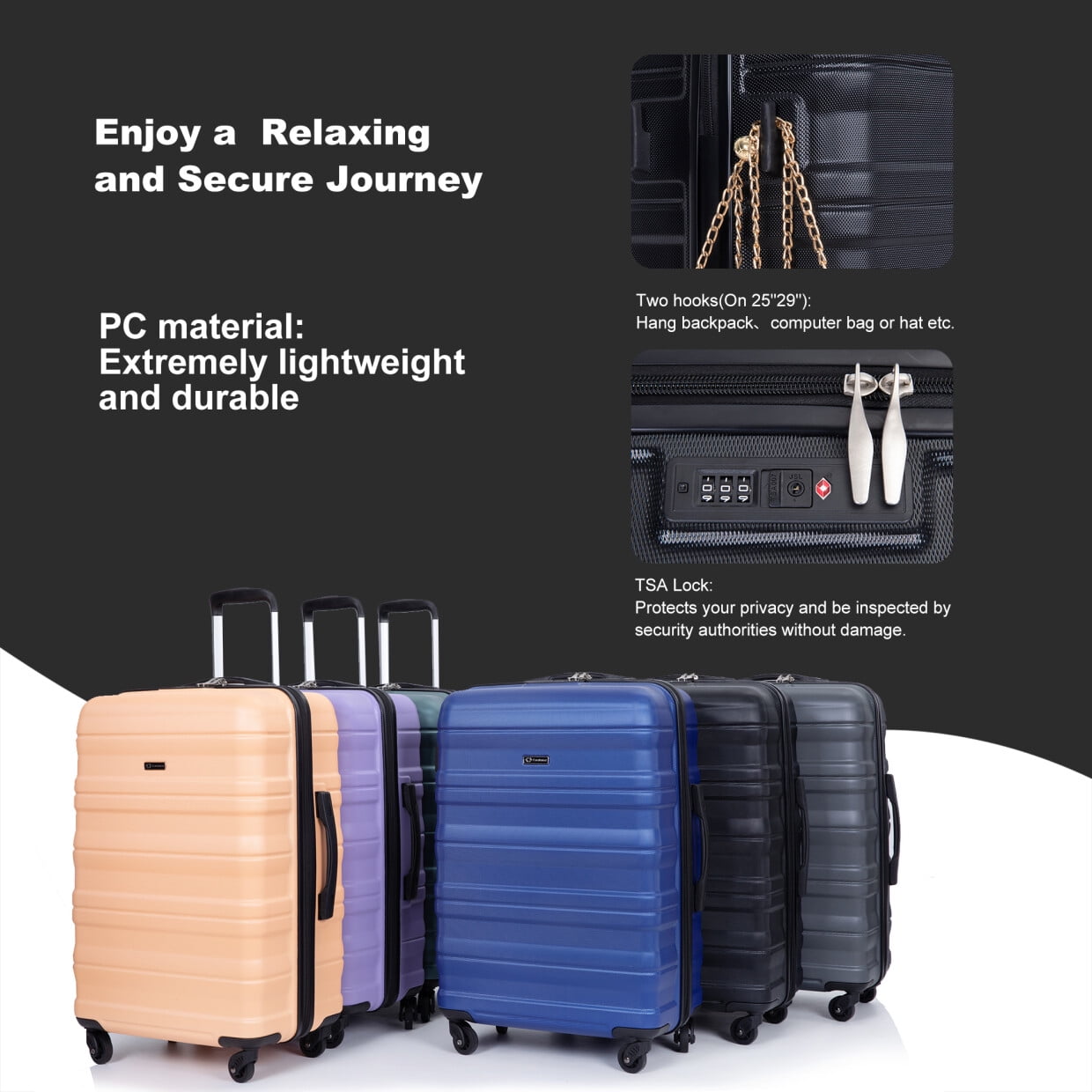 - [High Quality]Top quality luggage sets, PC material for hardshell, which makes the luggage more durable, lighter and impact-resistant.The fully lined luggage includes a handy divider and an interior organizer with zippered pocket for smaller items.These suitcases are perfect for carry-ons and long travel needs.