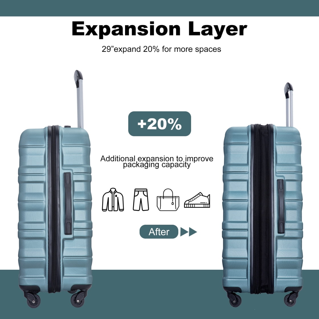 - [3 Piece Luggage Set]Set includes 21″ carry-on(convenient to carry to the aircraft), 25″ and 29″ checked(Suitable for long-distance travel, hold more clothes, shoes, etc.).21″ is best for carry on, 29″ expands 20% for more spaces.Two Hooks (25″ 29″ ) which can hang your computer bag, backpack, hat, etc., help you relieve fatigue during your journey.
