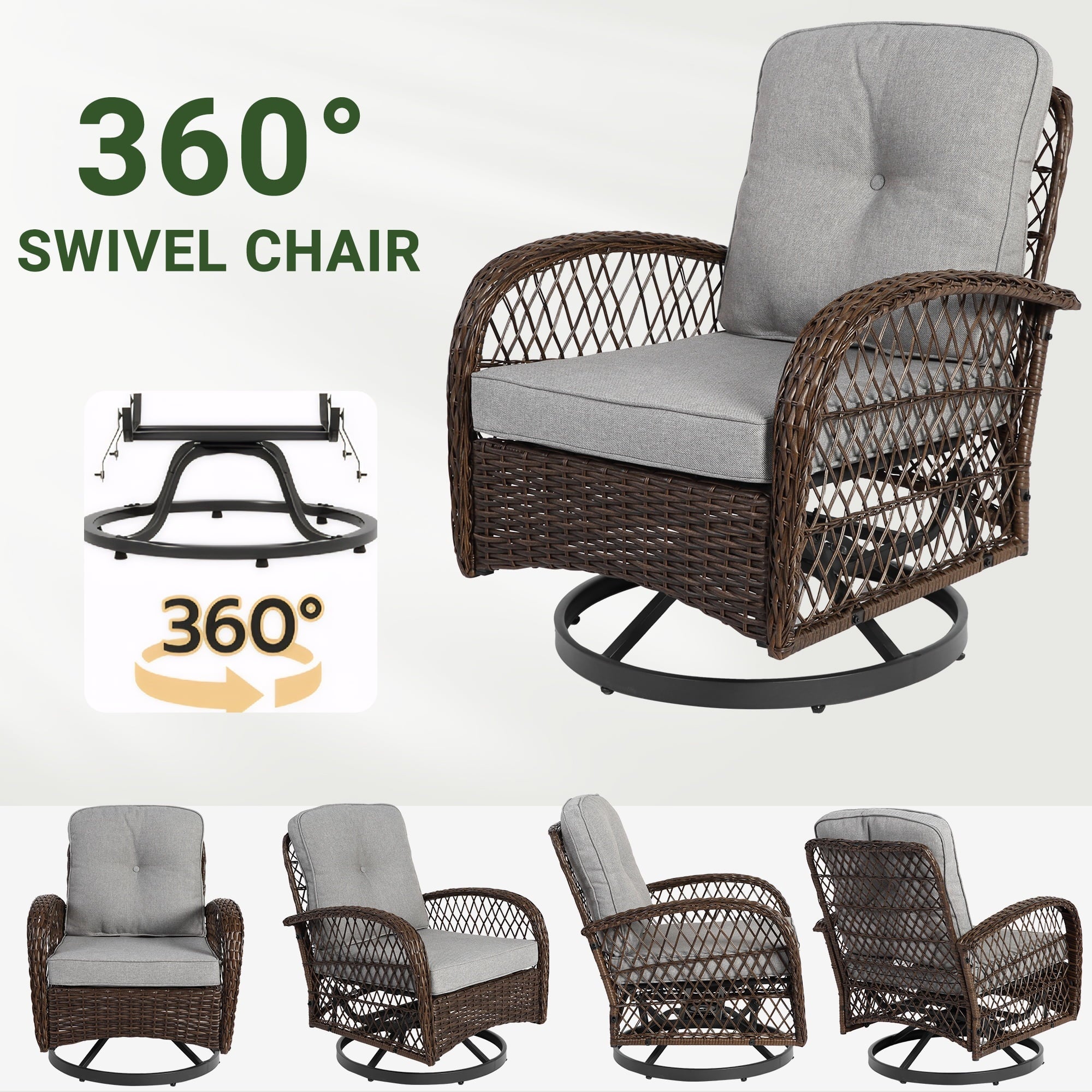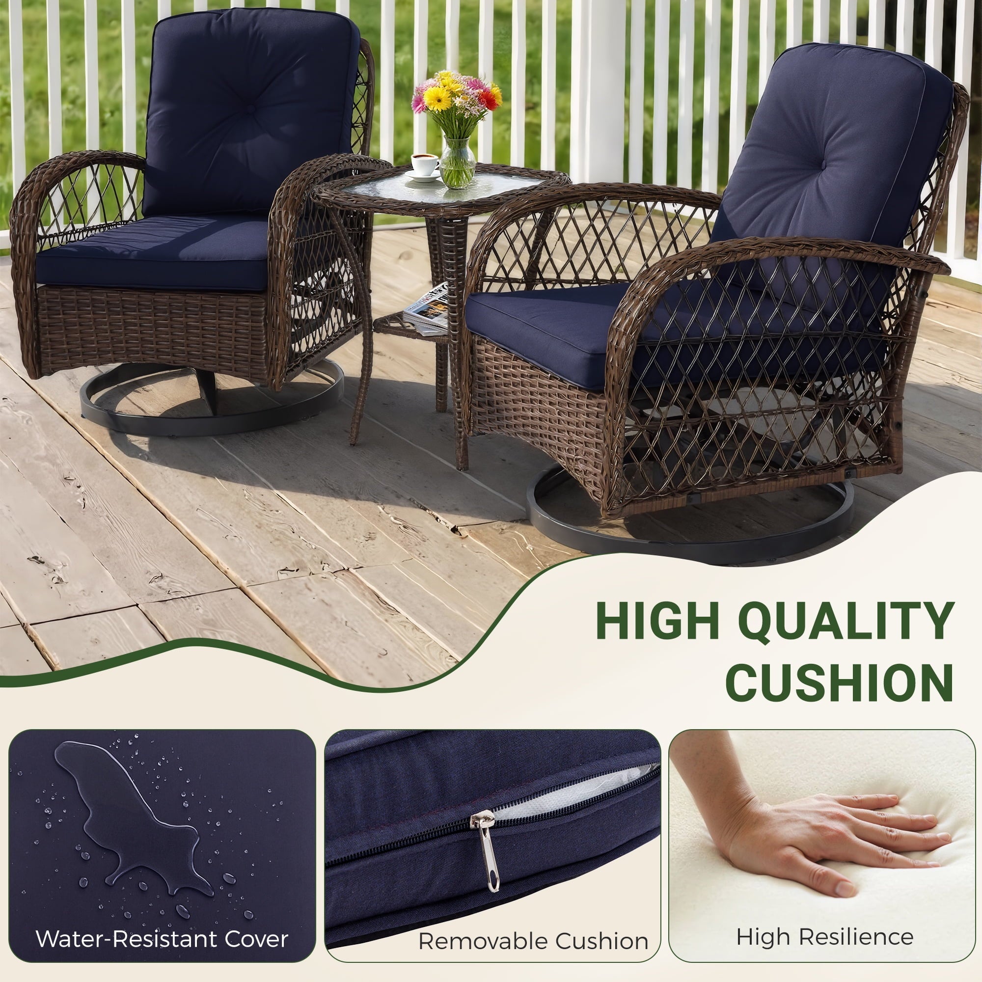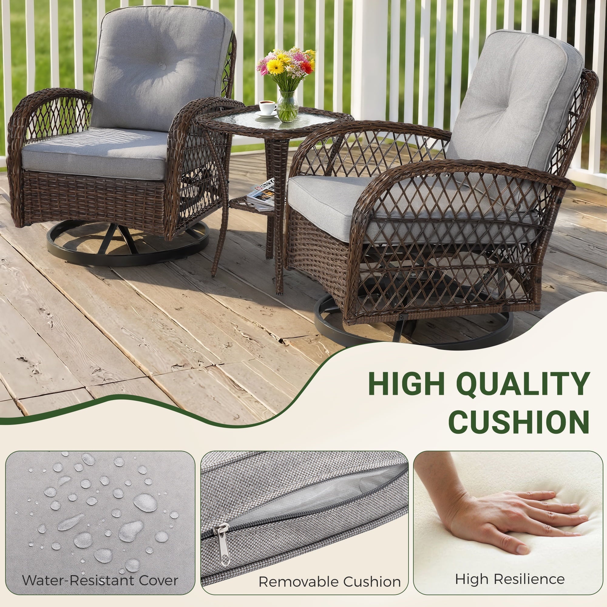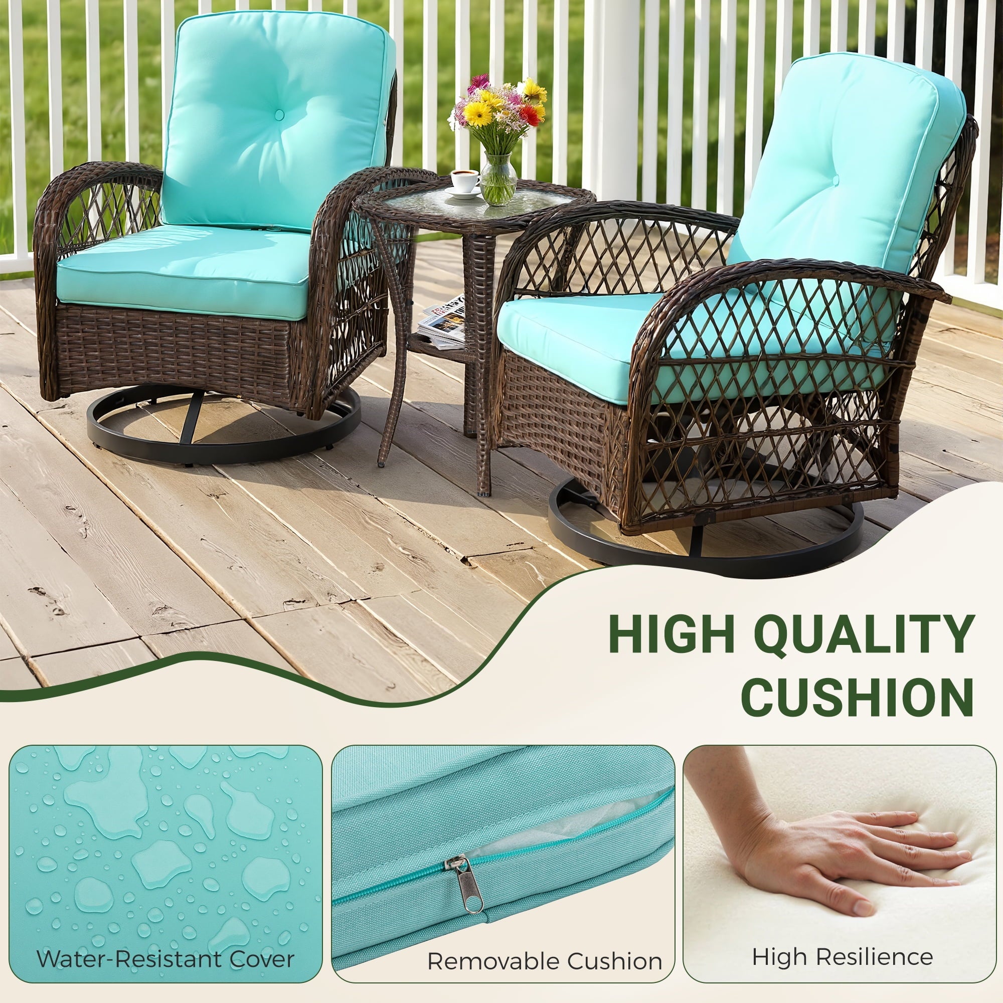With a modern design, our swivel chair sets are perfect for indoor and outdoor use. With it, you can enjoy the cozy summer in the garden, deck, porch, poolside and yard.