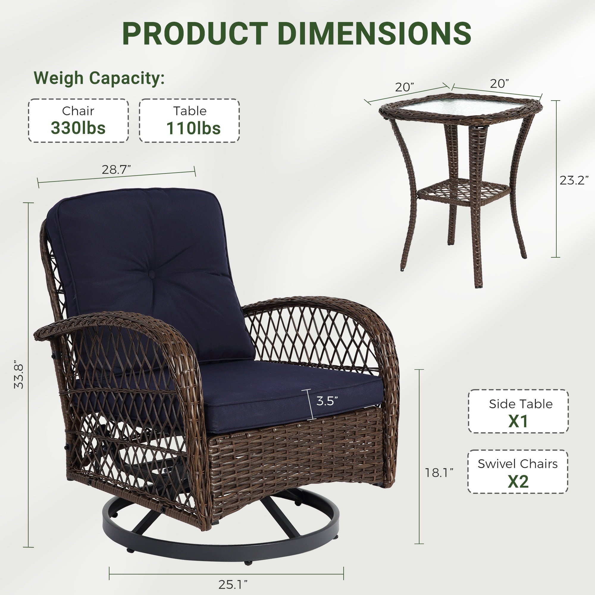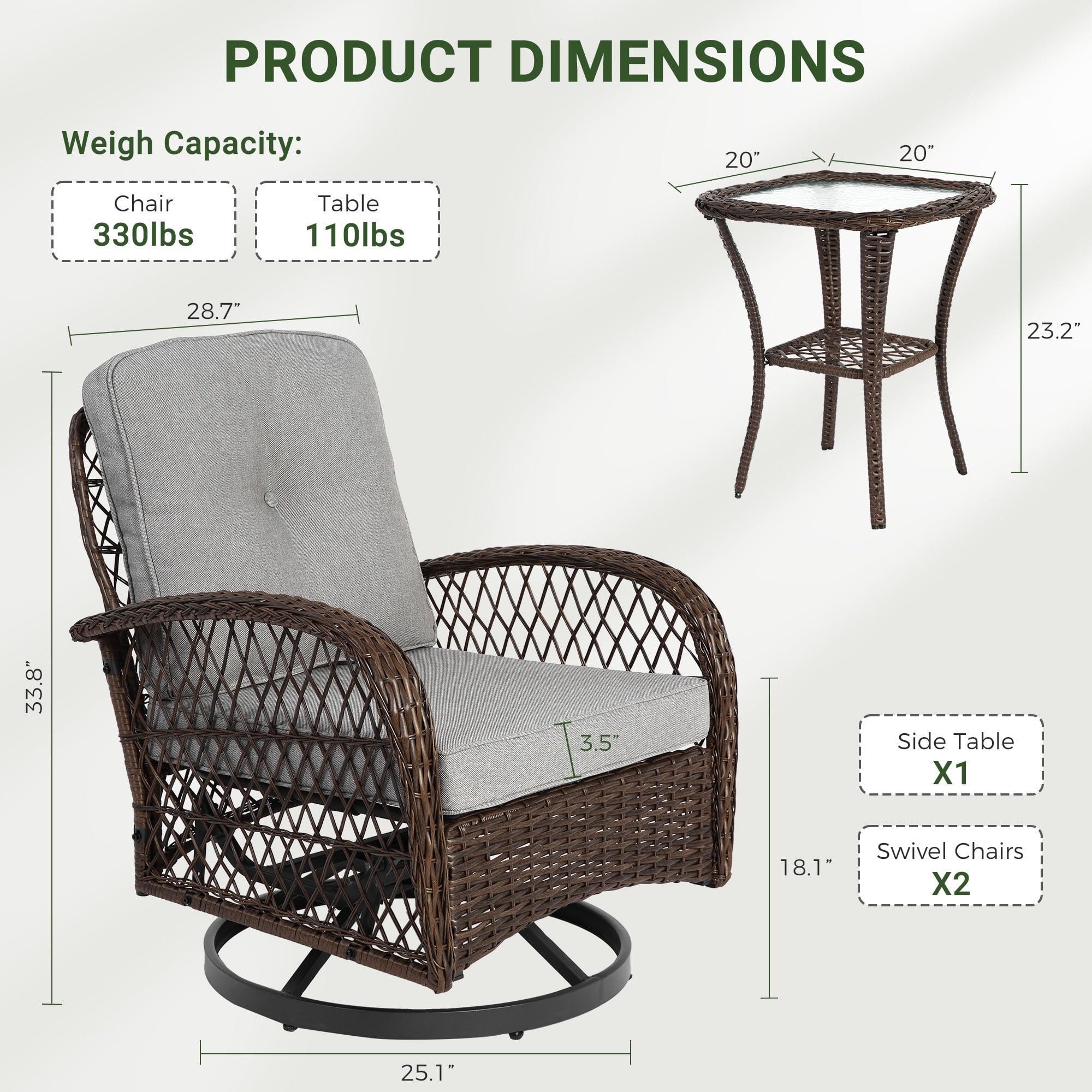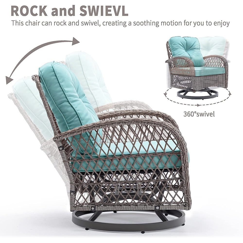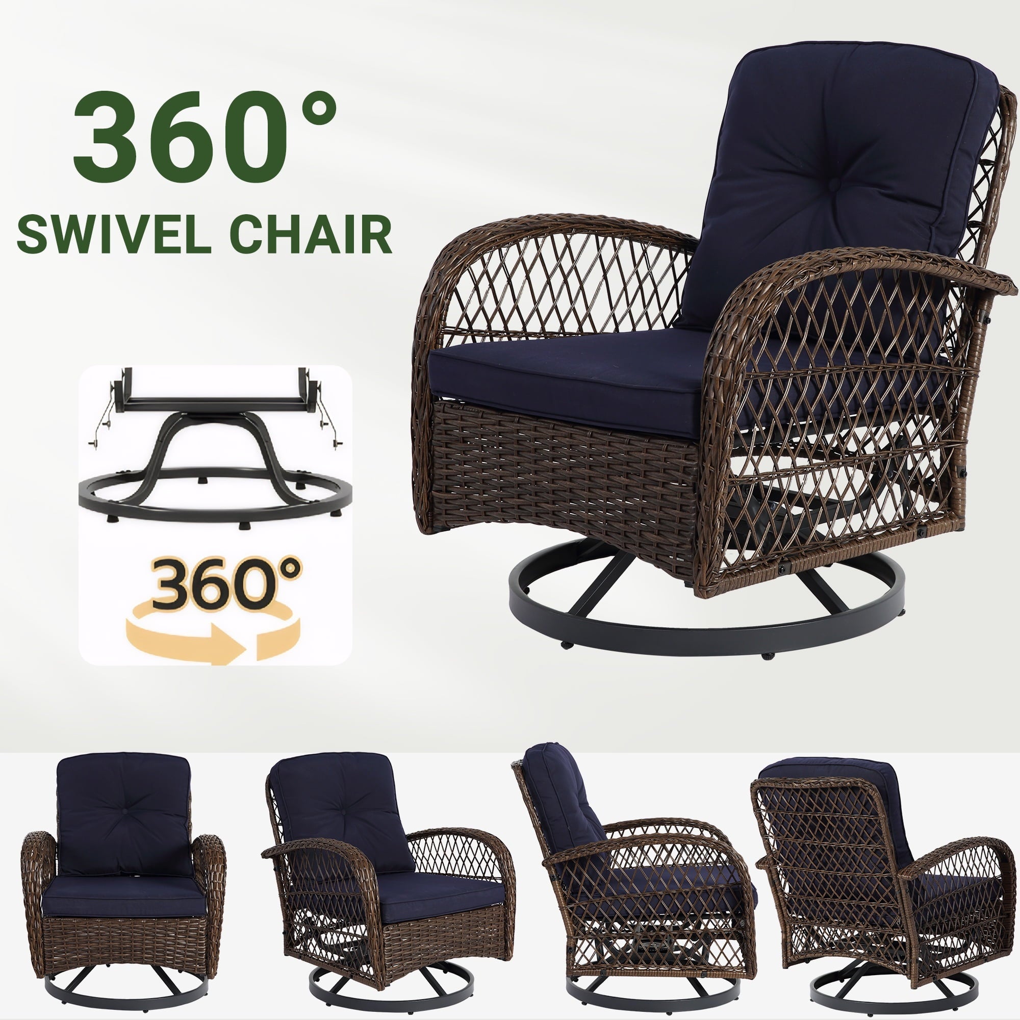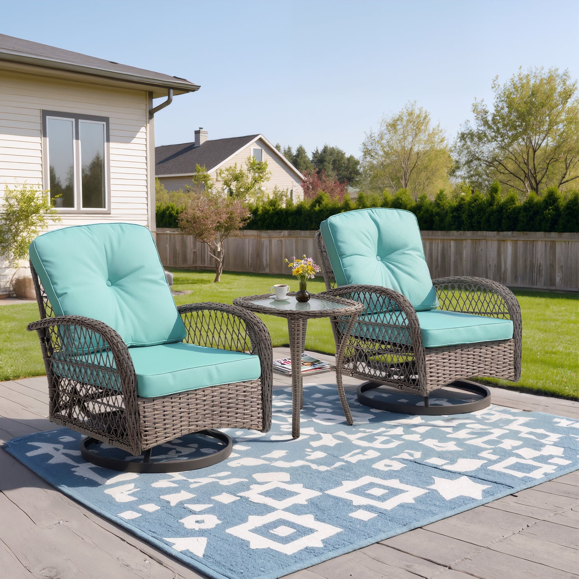 With a modern design, our swivel chair sets are perfect for indoor and outdoor use. With it, you can enjoy the cozy summer in the garden, deck, porch, poolside and yard.