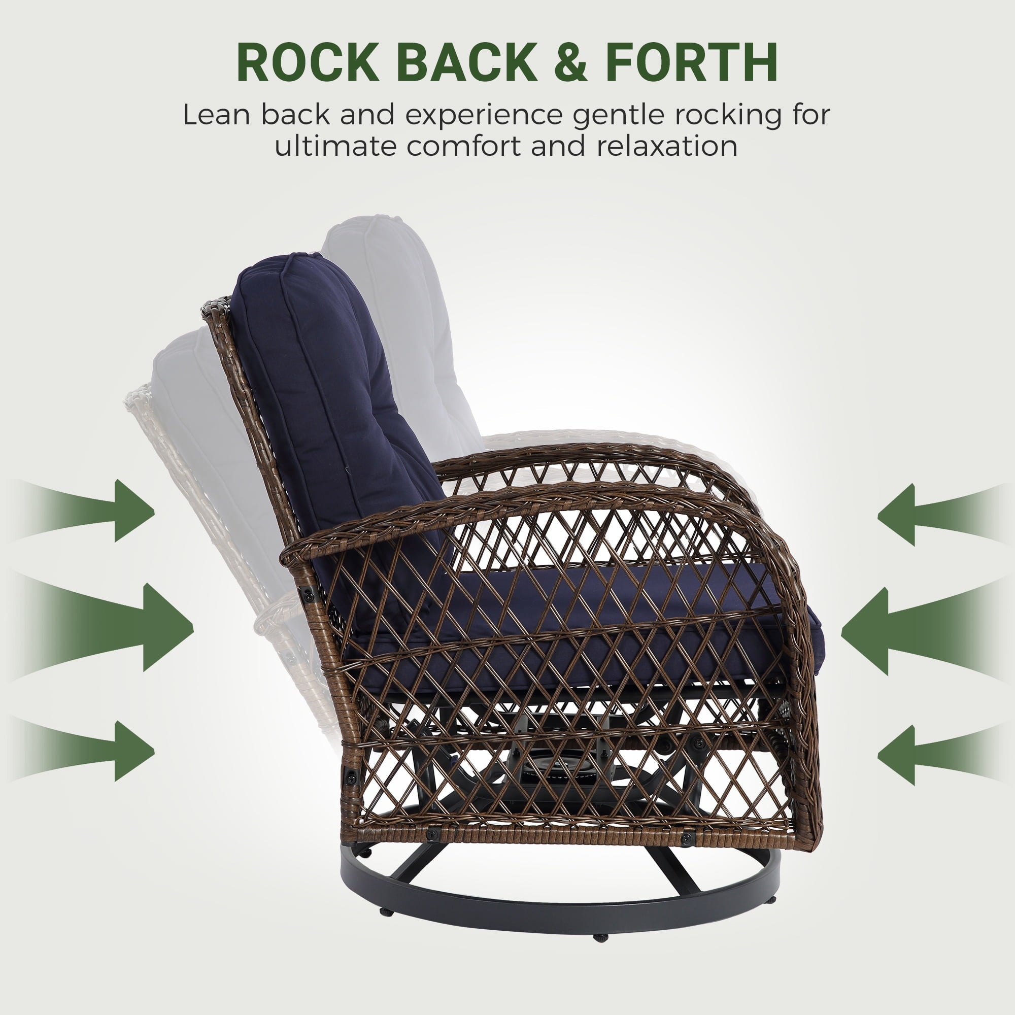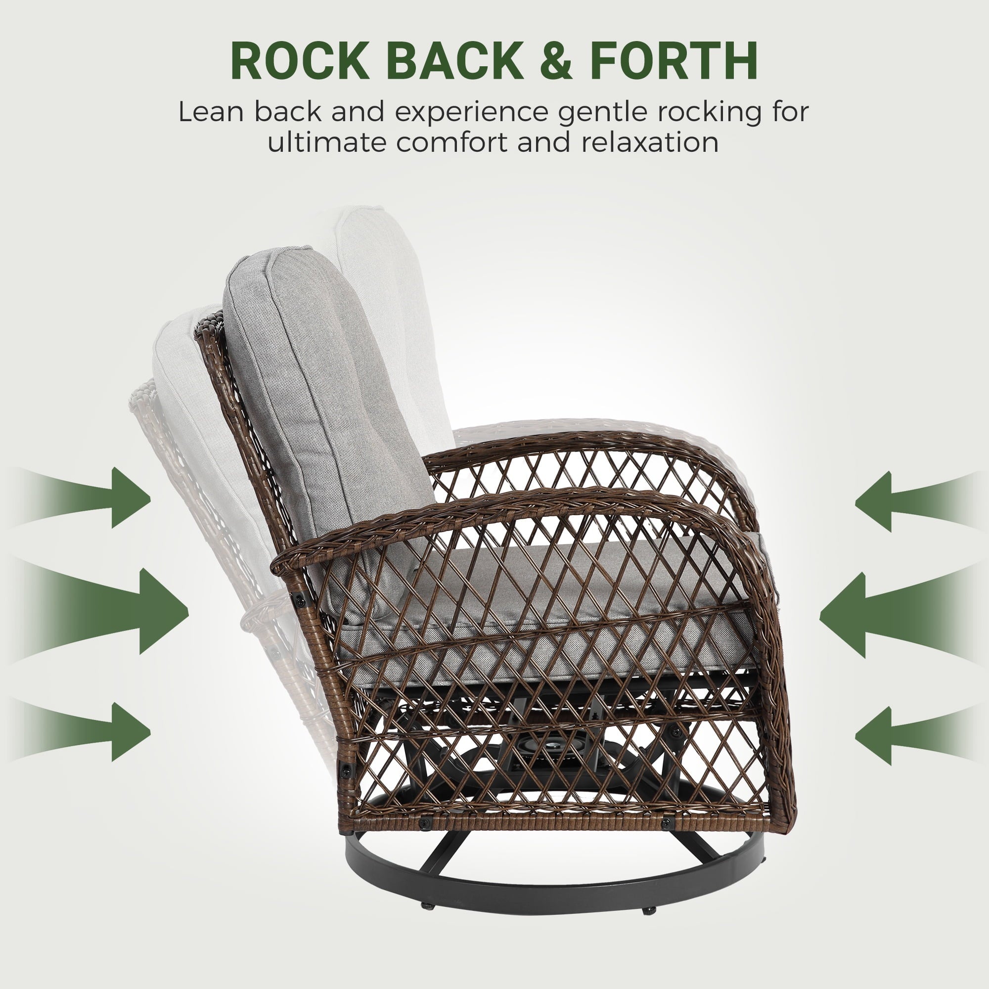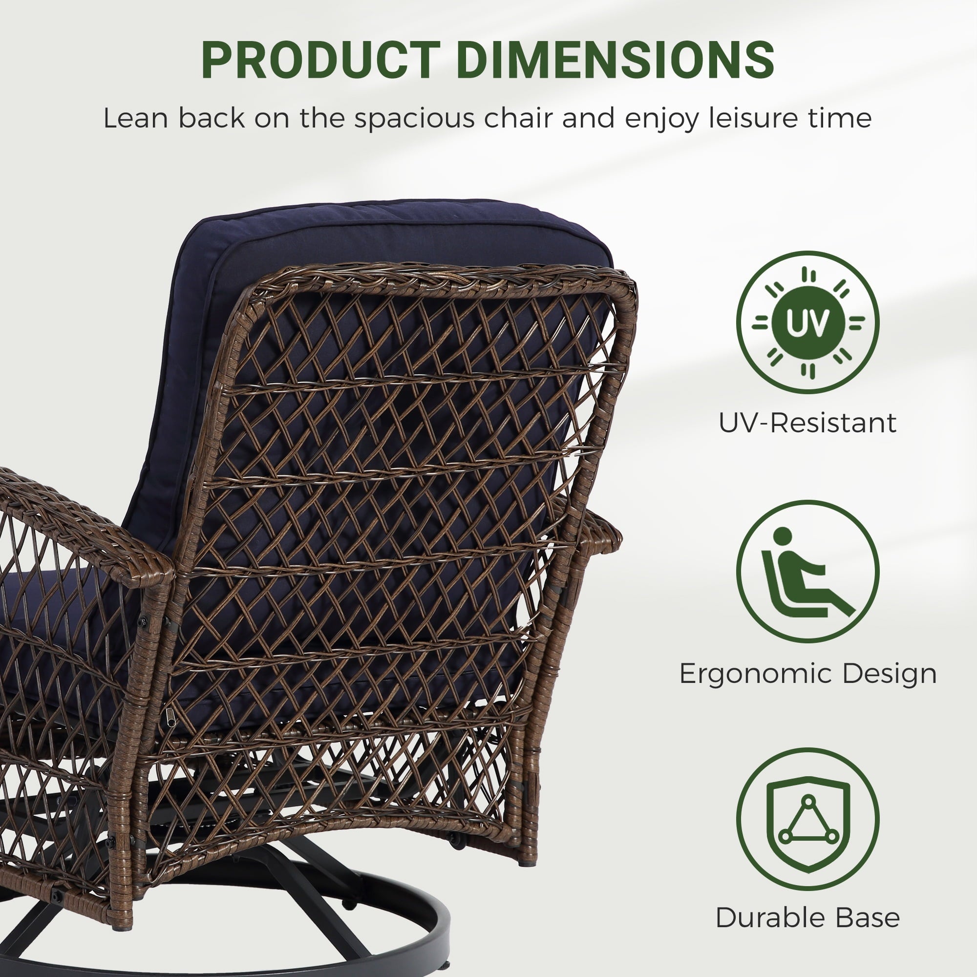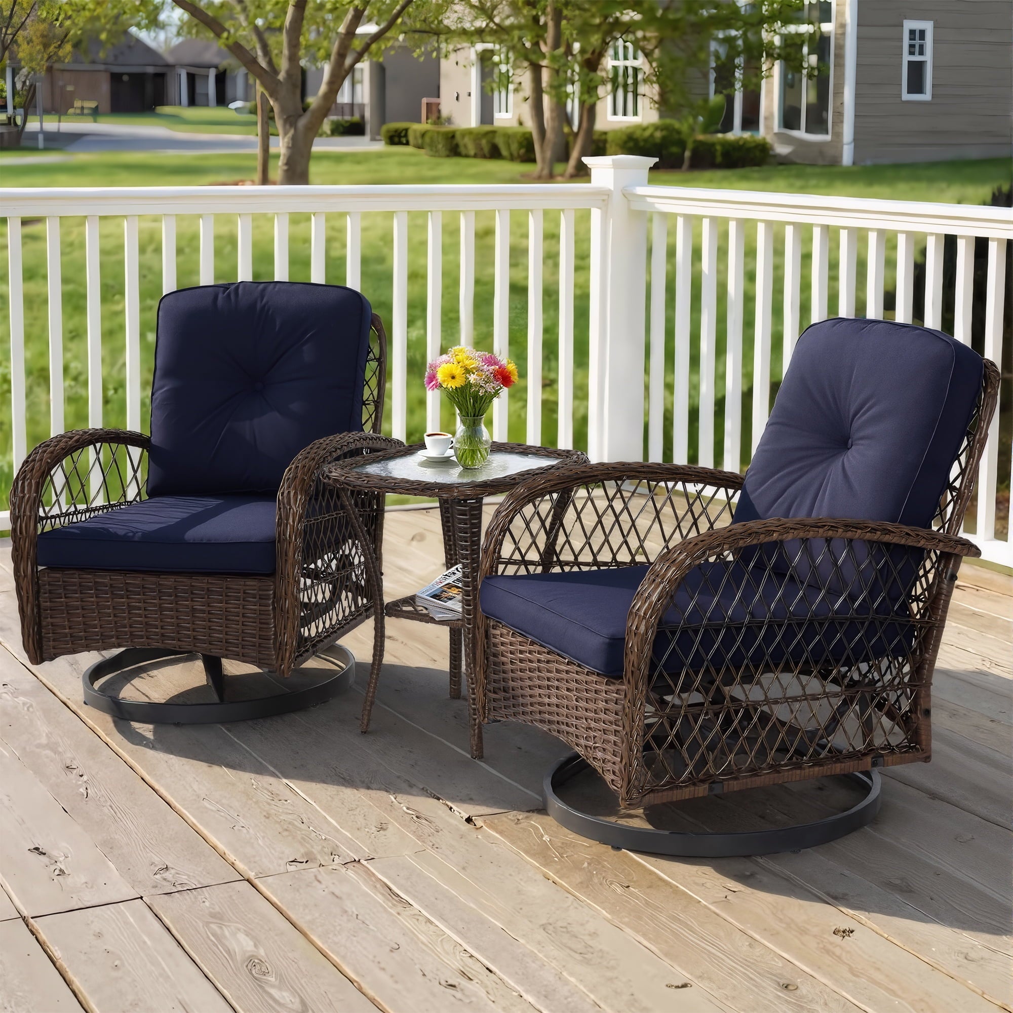 With a modern design, our swivel chair sets are perfect for indoor and outdoor use. With it, you can enjoy the cozy summer in the garden, deck, porch, poolside and yard.