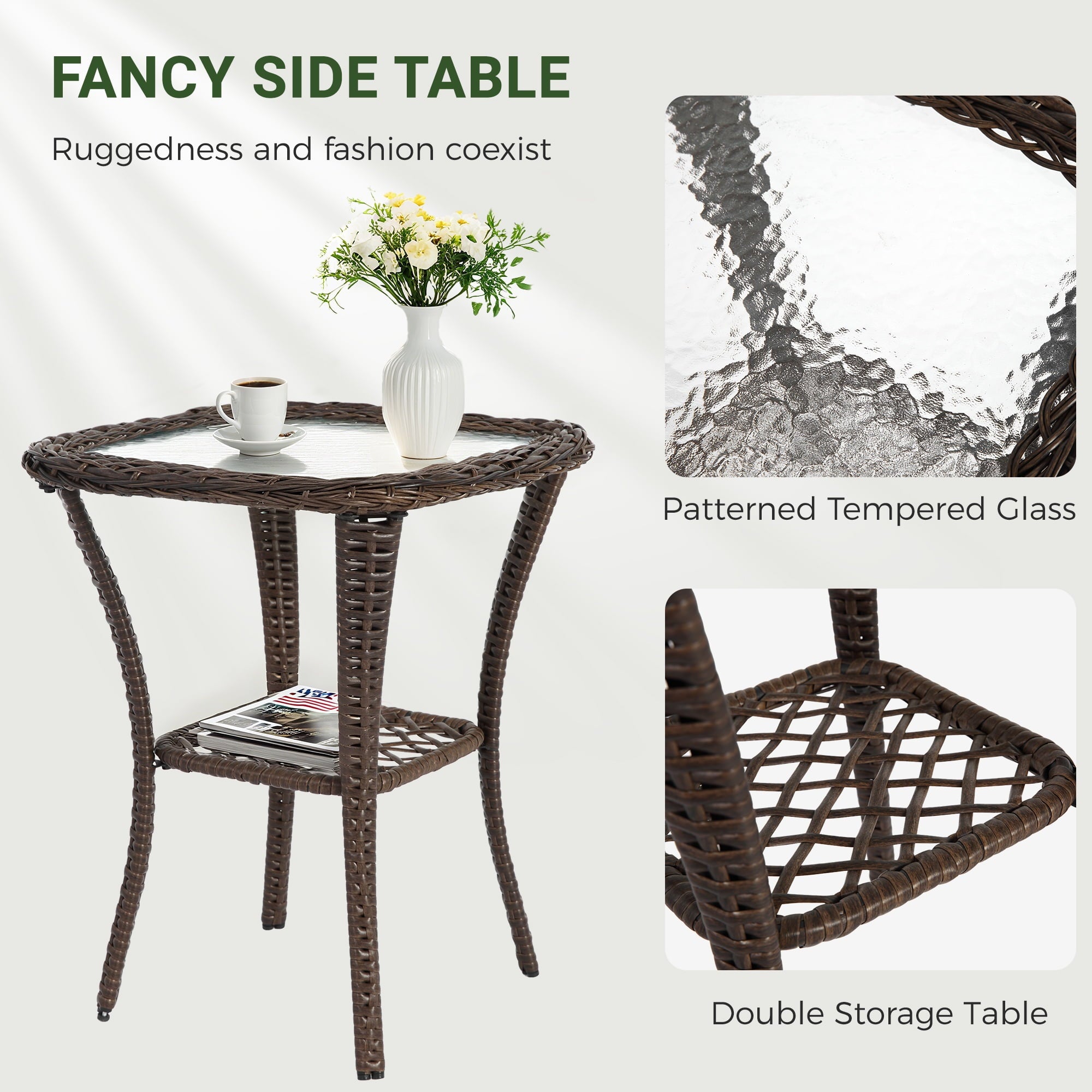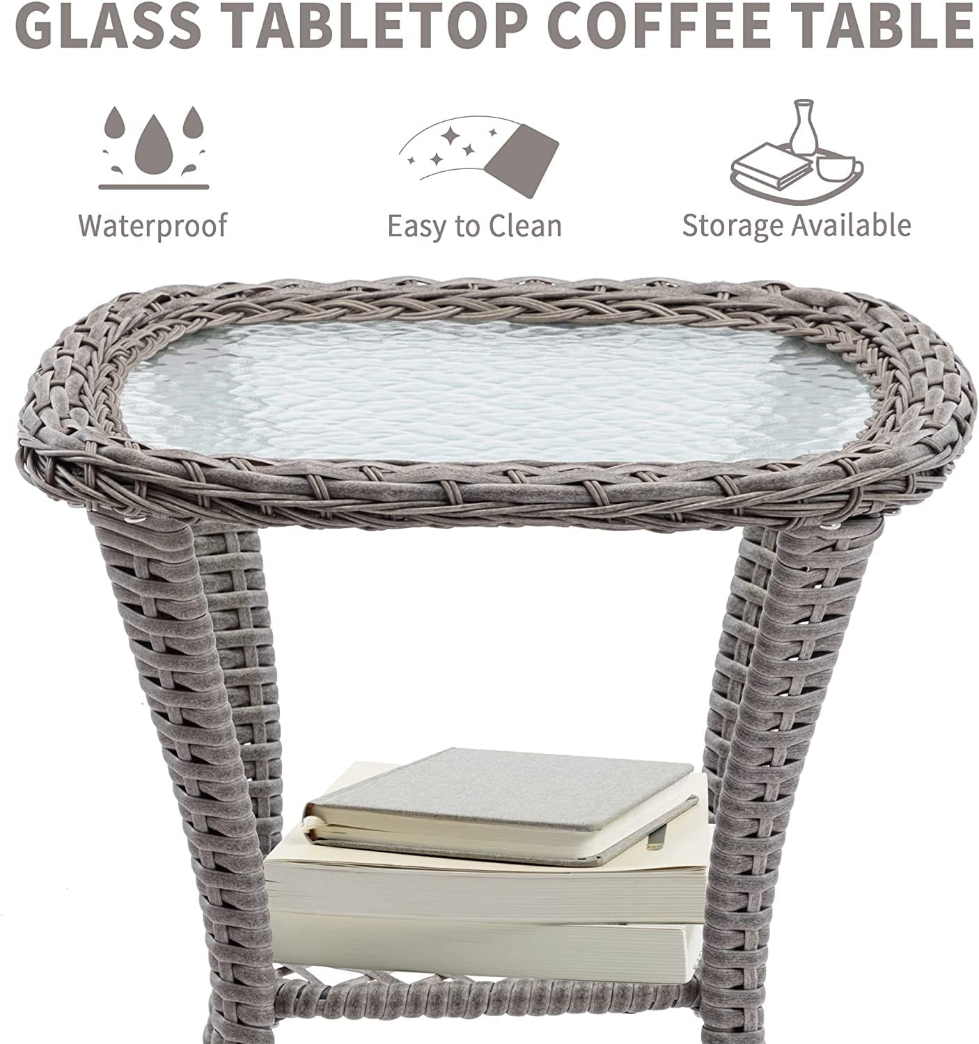 PE rattan wicker is incredibly durable and lightweight, making this outdoor furniture set easy to carry and move. Covers of the two-seat cushions can be removed for convenient washing. Glass on the tabletop has a smooth surface for you to wipe the dirt off as well.