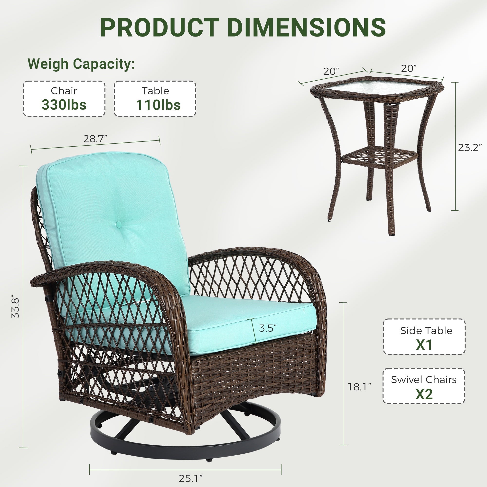 This set includes 2 swivel chairs and a glass top table. Table: 20.0″ Dia x 23.2″ H, Swivel Chair: 28.7 ” W x 25.10” D x 33.8 ” H. Each chair weight capacity: 330 lbs, and the table weight capacity: 110 lbs.