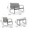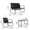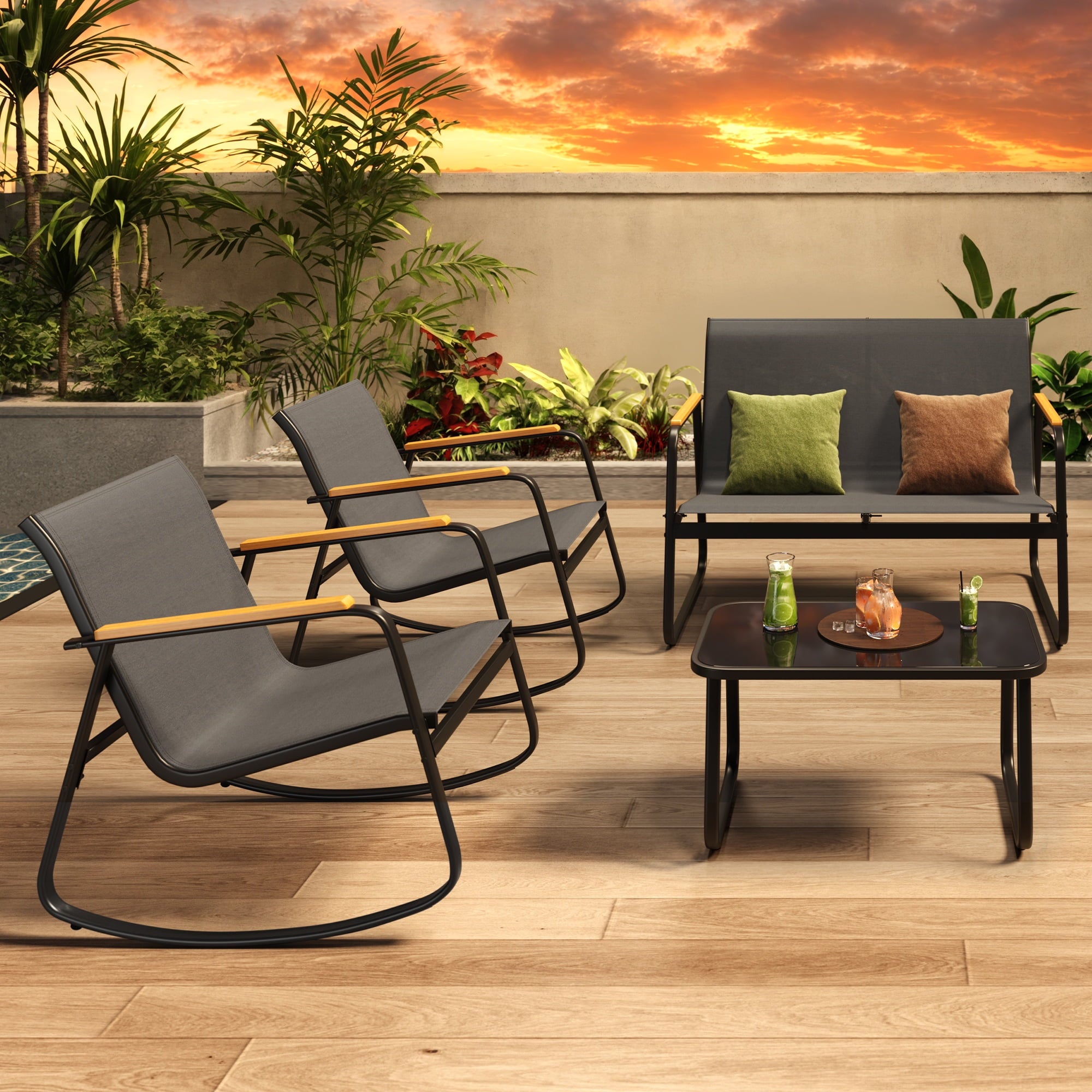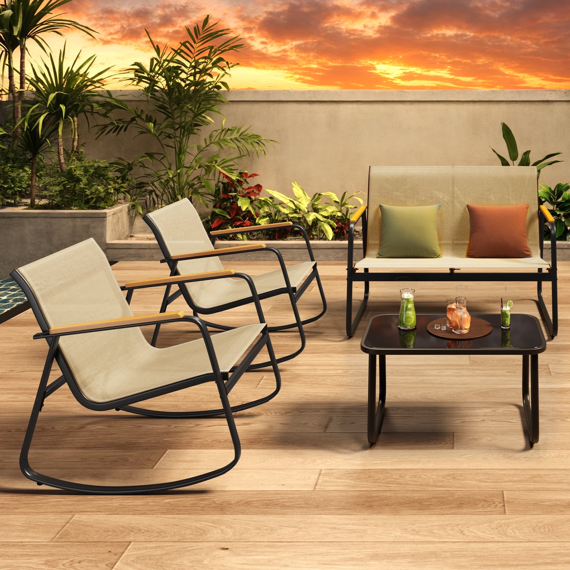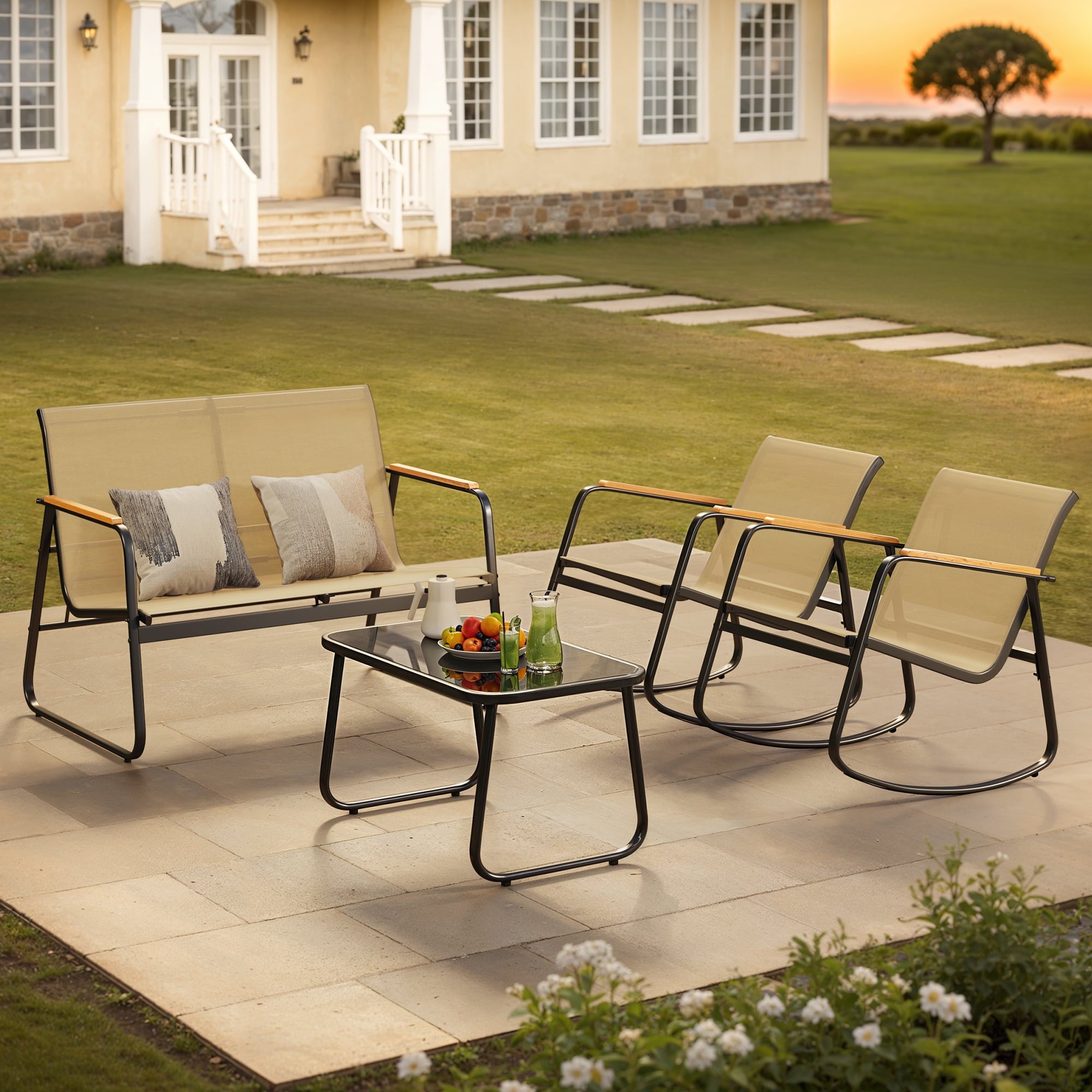 We considerately create a 4-piece patio bistro set for your summer outdoor needs, including two comfortable rocking chairs, a table and a high-quality Loveseat. This patio set not only focuses on comfort, but also displays an elegant and stylish design. High-quality steel and high-quality wood craftsmanship make the overall look natural and fresh, which not only allows you to relax comfortably, but also adds a touch of chic style to your outdoor space. Whether chatting with family and friends, or reading a good book alone, this set of furniture will make your outdoor time more comfortable and enjoyable, meeting your diverse needs!
