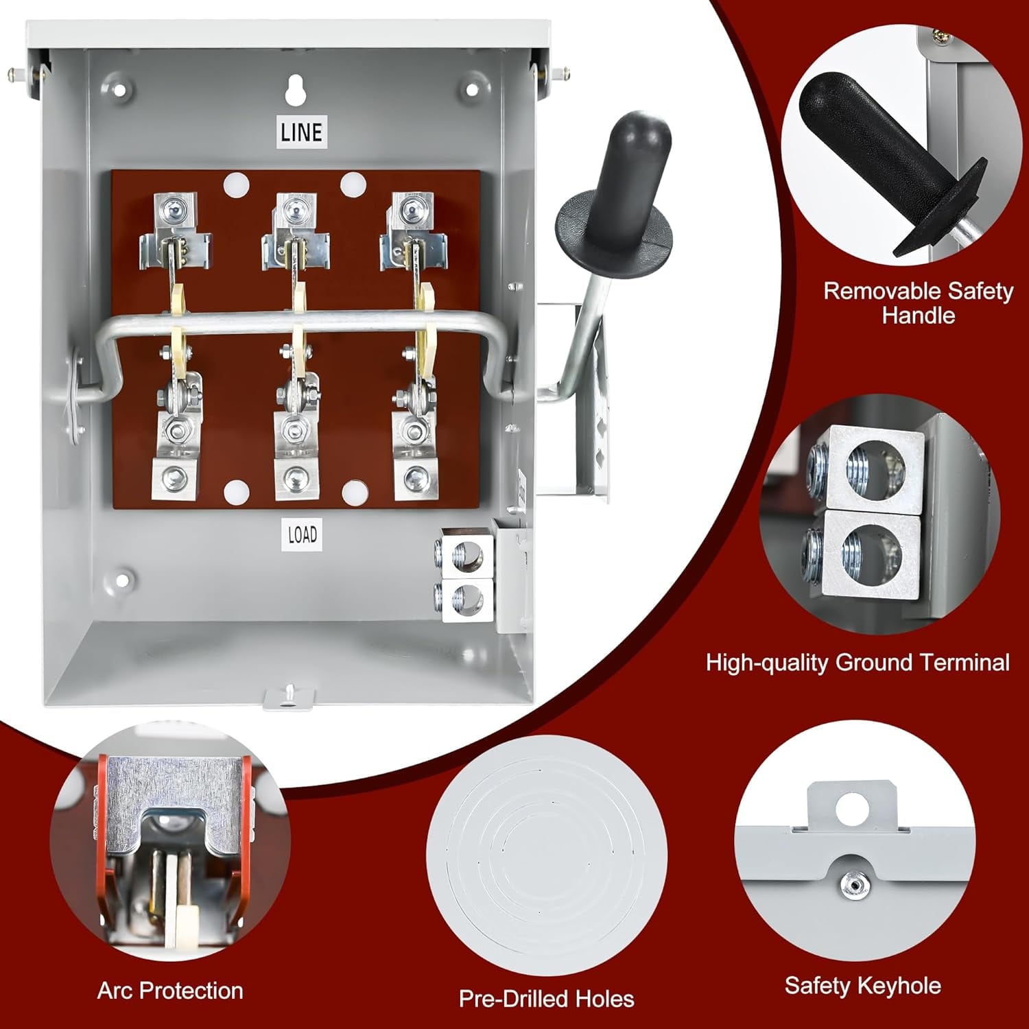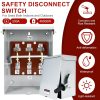 - Easy to Install and Maintain: This 200A disconnect switch come with pre-drilled holes of various sizes to meet your needs; Clamshell design, easy to operate; For your safety, we strongly recommend installation by a professional electrician