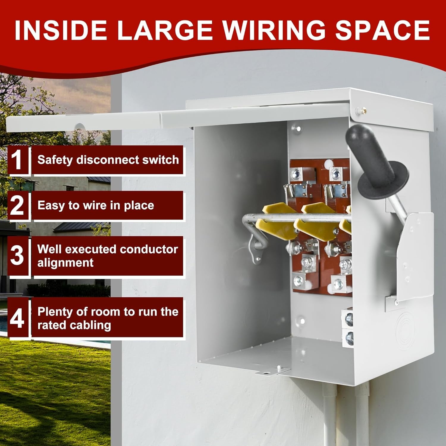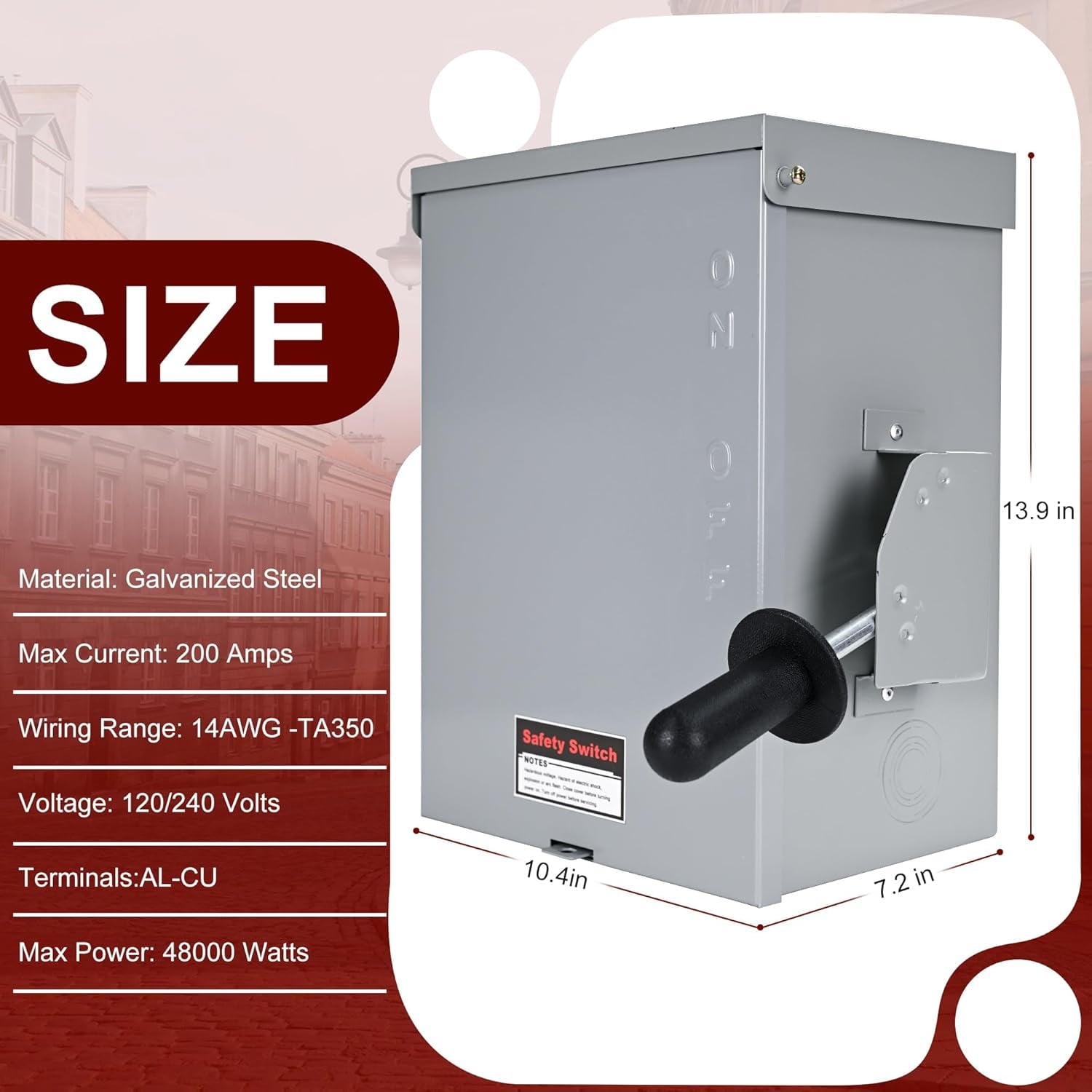- Double Safety Protection: The 200A disconnect switch has a visible ON/OFF indication and an upgraded handle prevents accidental activation and intentional tampering, ensuring safe use. An internal designated grounding location prevents accidental electrocution. The wiring range is 14AMG-TA350 with plenty of wiring space