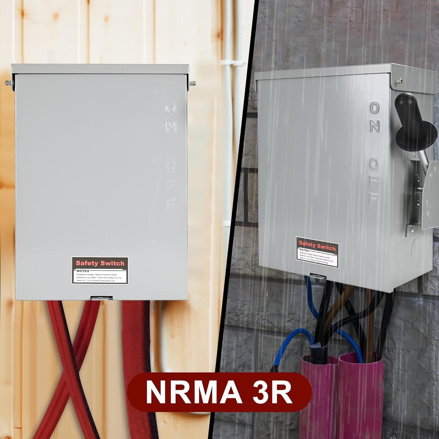- Meeting NEMA 3R Standard: Our 200 amp, 3 Pole disconnect switch box is made of heavy-duty galvanized steel with upgraded thickness of 1.2 mm and a protective coating on the surface. The disconnect switch box can withstand harsh weather such as rain, snow, hail, wind or sunburn, your best choice for outdoor electricity