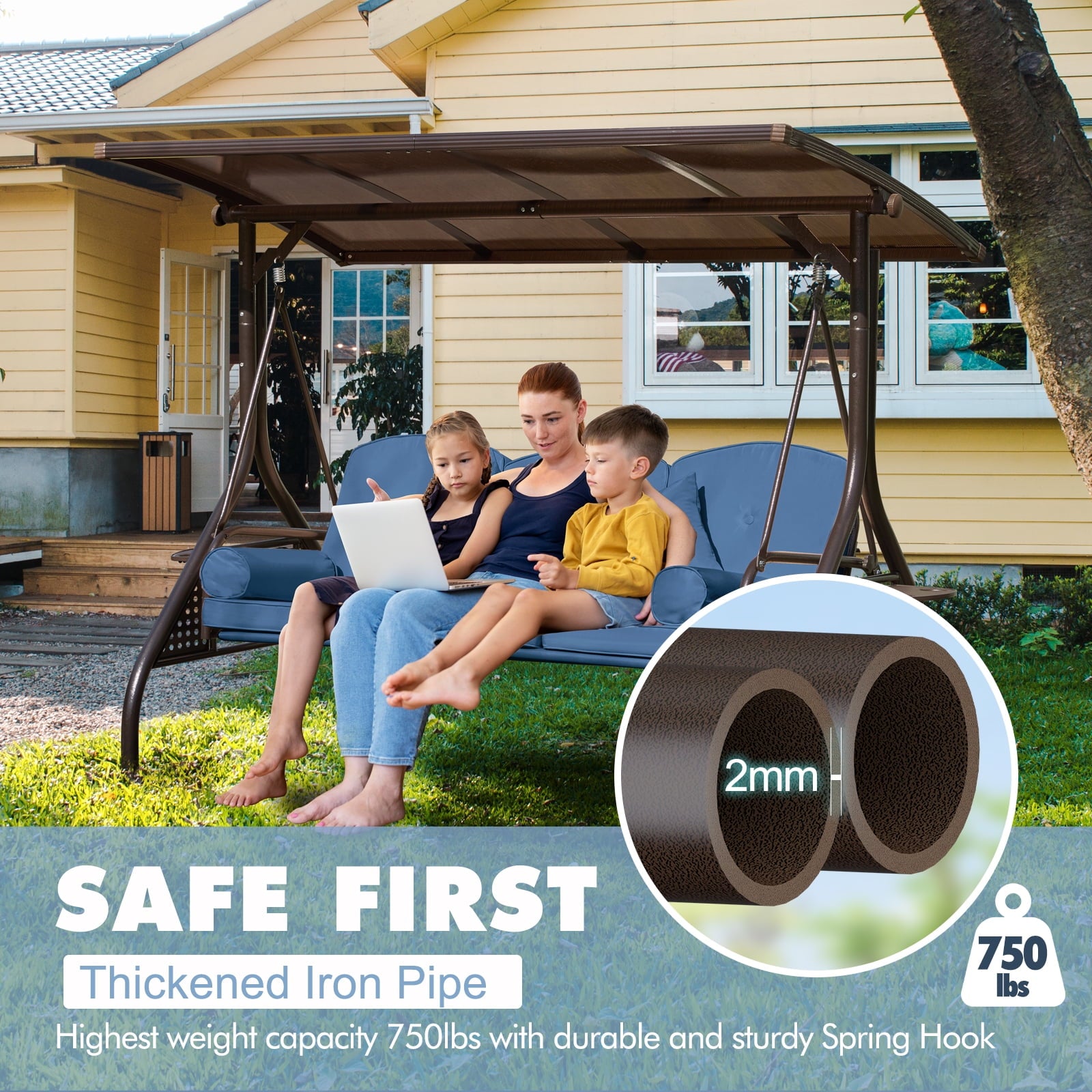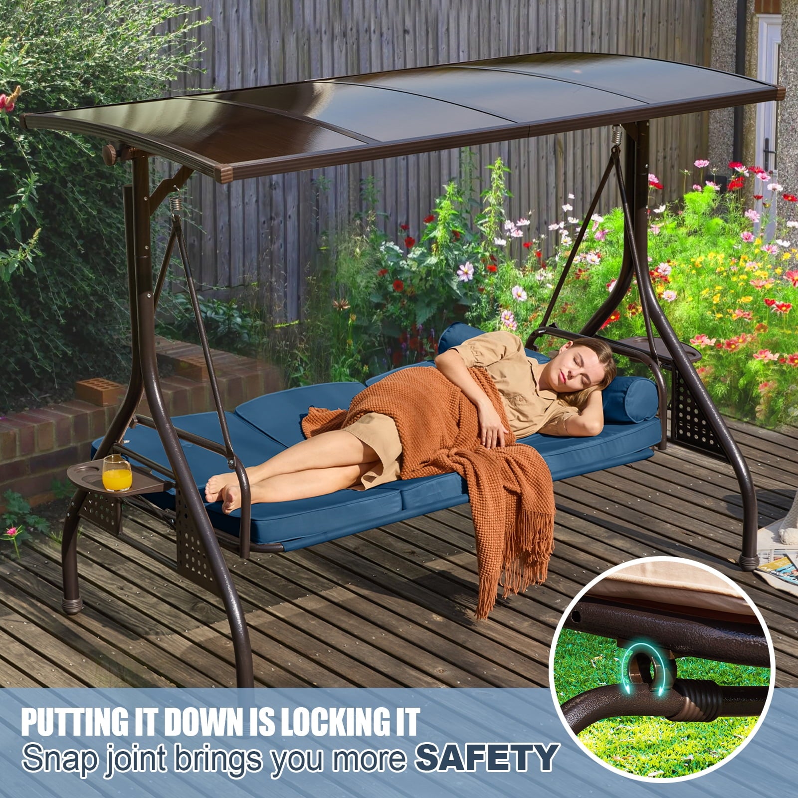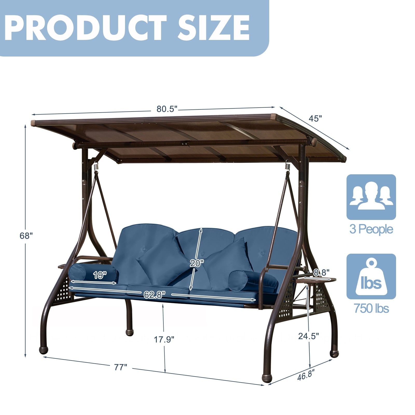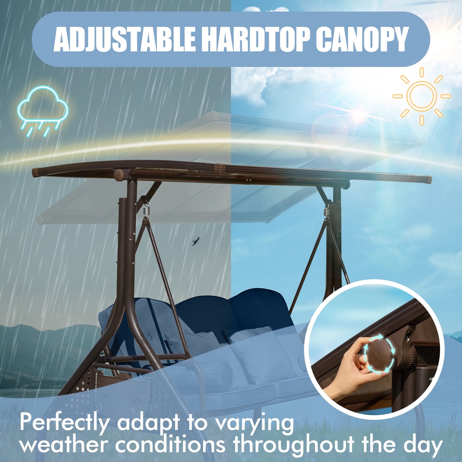 - ☀️【135 Degrees Adaptable Canopy】: The 3-seat patio swing provides adjustable hardtop, allowing customers to read, nap, or relax on porch swing without being affected by glaring rays. The outdoor patio porch swing with adjustable PVC canopy design ensuring comfort in any weather. And you could easily adjust the suitable angle of the porch swing canopy by the sturdy knob.