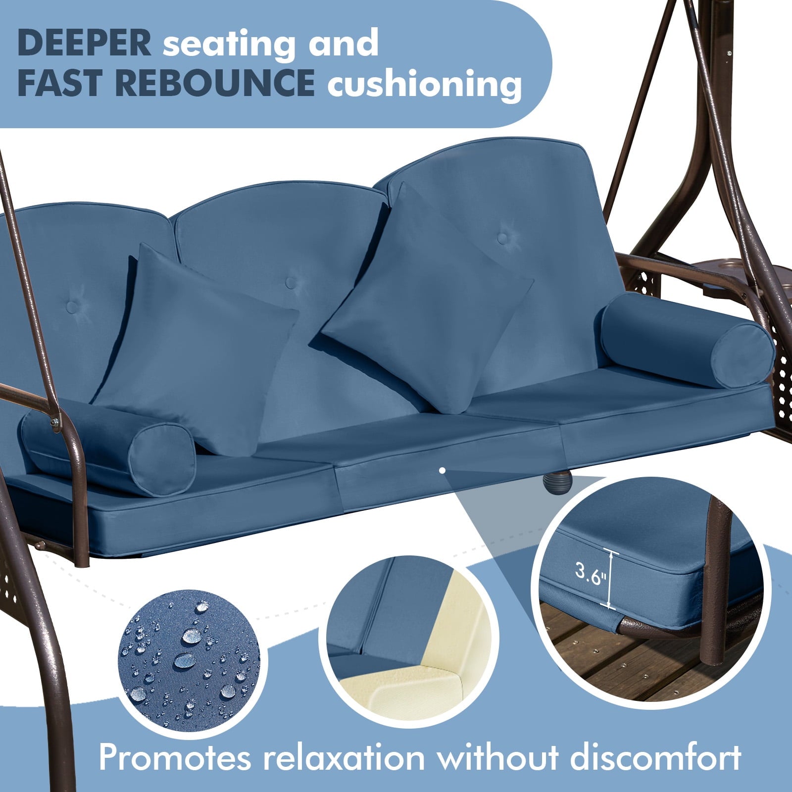 - ☕【3.6-inch Ultra Comfort, Shared Relaxation: The thicken cushion (3.6-inch) of porch swing is filled with pure sponge material and outdoor swing chair offers exceptional elasticity and rapid rebound. Ensuring specious place and ample seating depth. And 2 cylindrical pillows of backyard swing serve as headrests when the outdoor swing is reclined, provide neck support.