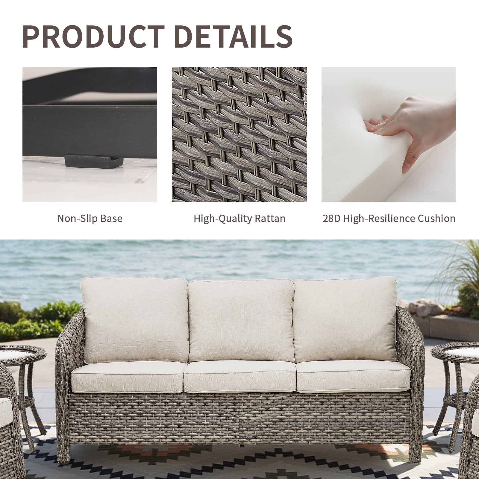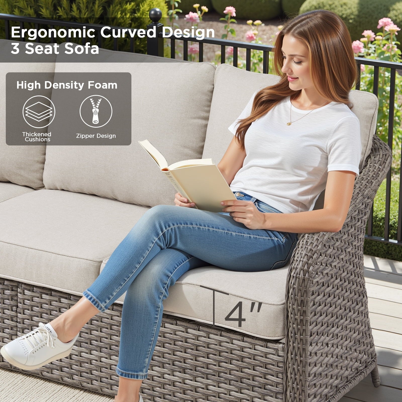 【Patio Sofa】Our 3-seat outdoor sofa can be seated three persons for friends hang out, daily talk, movie time, great fit for a patio, deck, conservatory, pool, porch, garden, atrium, terrace, or balcony.