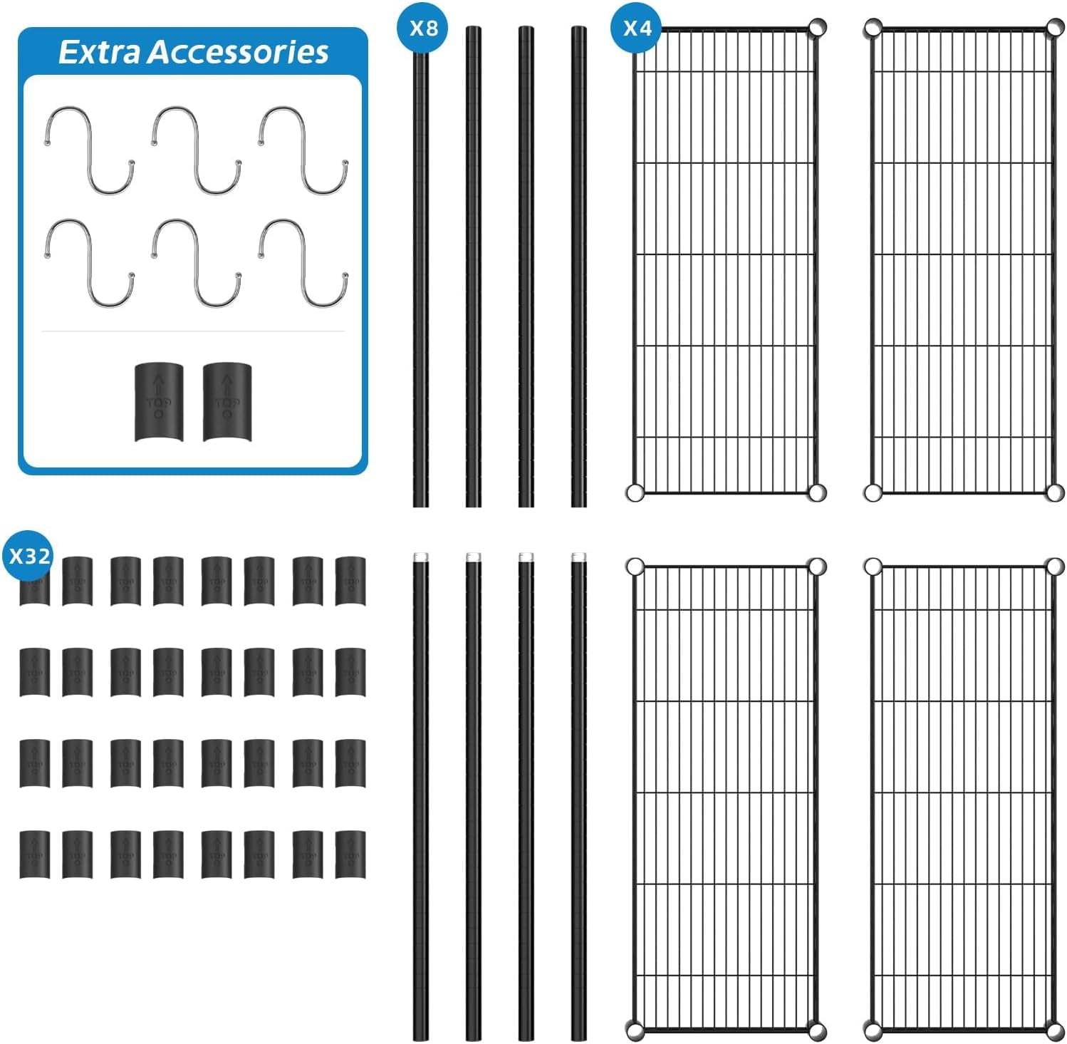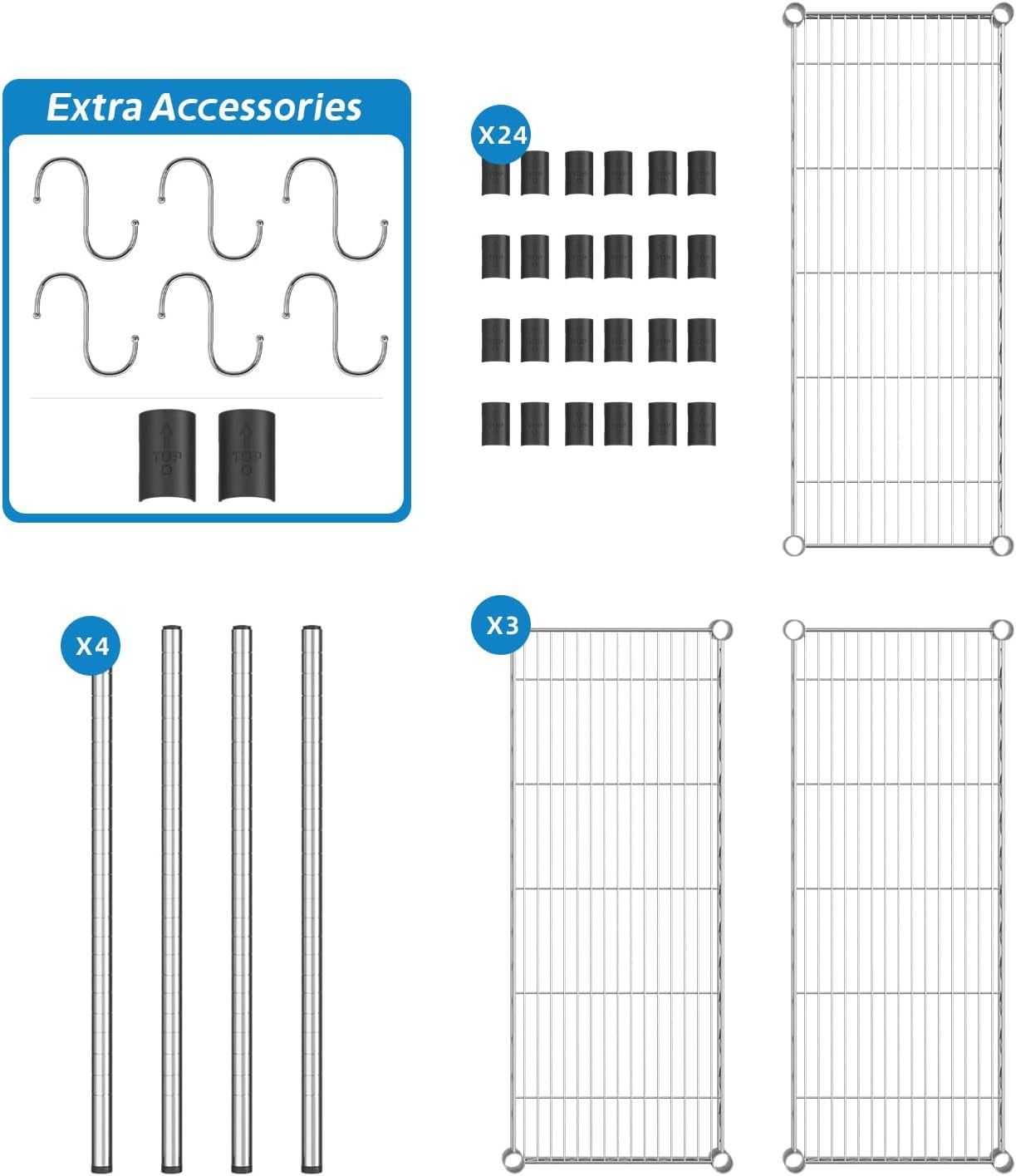 - What You Will Get: This Wire Shelving include: 3 pieces of Metal Mesh Board, 4 pcs Pole, 24 pcs Clips; Additionally, an additional 2 clips and 6 metal hooks are included