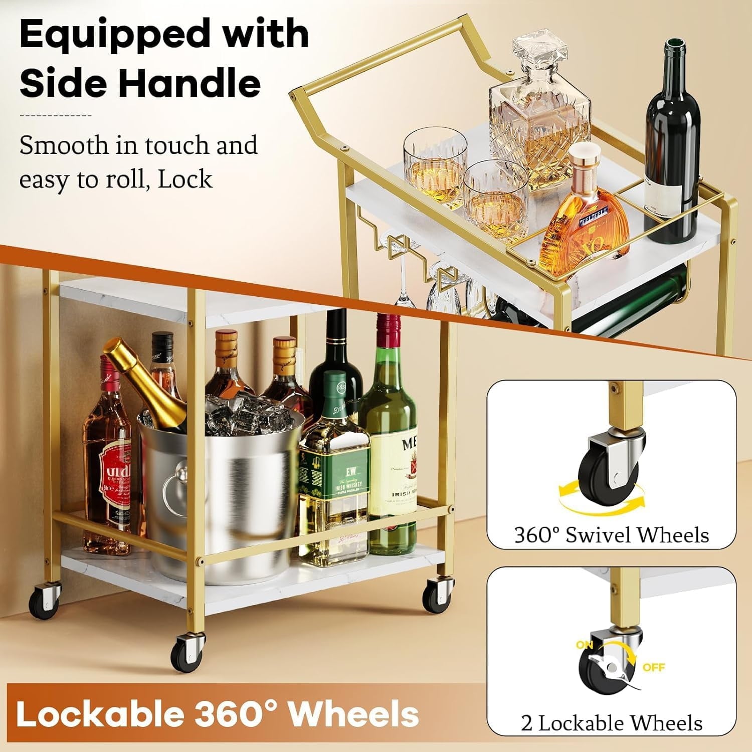 LARGE STORAGE CAPACITY: Designed with wine rack and glass holder, the wine bar cart can hold 2 bottles of wine and 6 wine glasses. Ideal for wines, glasses, ice buckets, liquor, food, it helps keep your area tidy and optimized. Ideal for daily organization and small gatherings.
