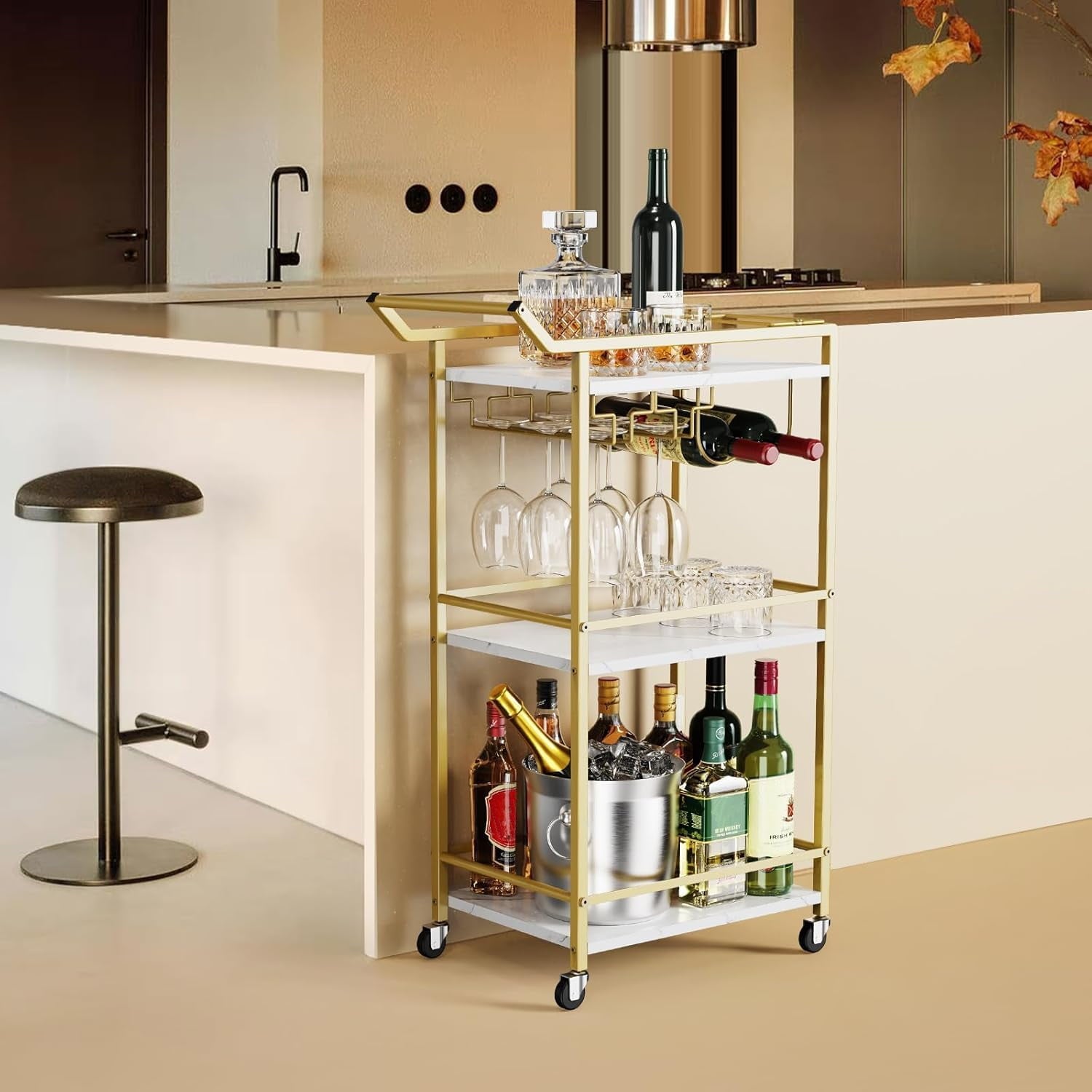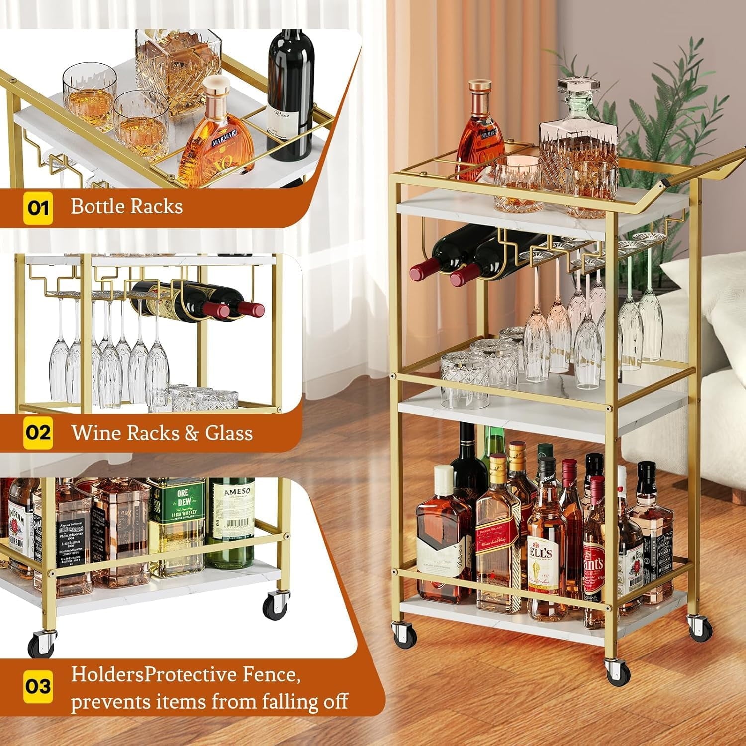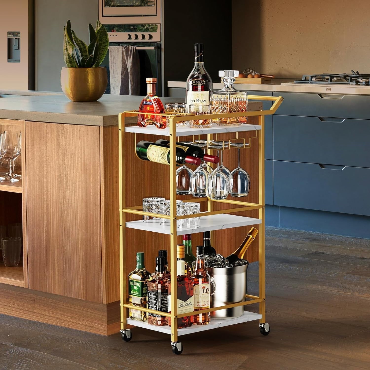 MULTI-FUNCTIONAL ROLLING BAR CART: Size of the 3-tier bar cart: 15.7”L x 13.2”W x 34”H. Serving Cart for Home bar, Drink Cart, Mobile Kitchen Shelf with Wine Rack and Glass Holder. It is suitable for home, bar, living room, kitchen, party, etc.