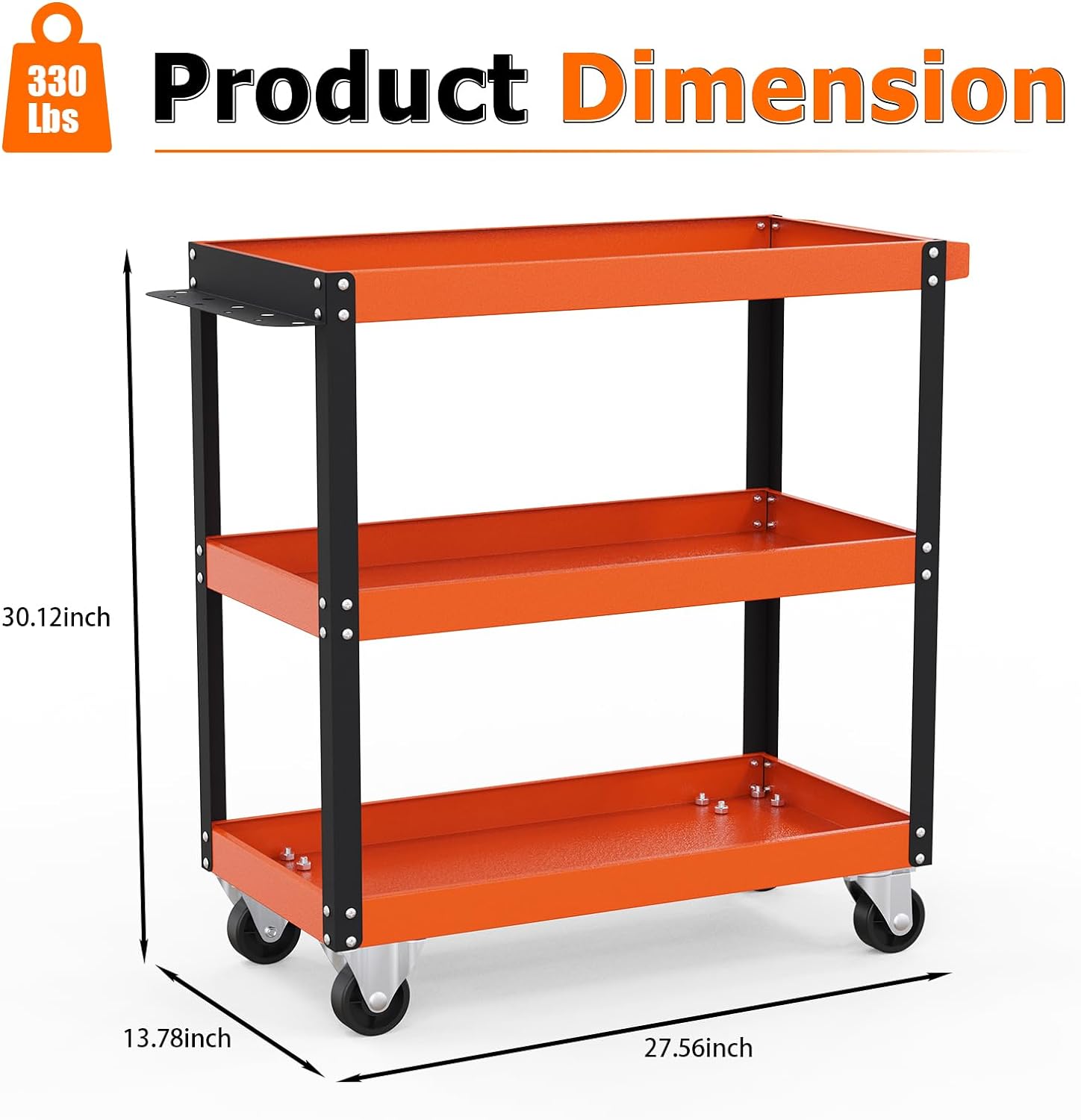 【Large Size Service Cart】This tool cart on wheels size is: 30.93″(L) x 13.79″(W) x 30.34″(H). 330 Lbs Weight Capacity. The distance between each shelf provides great storage space and saves you space.