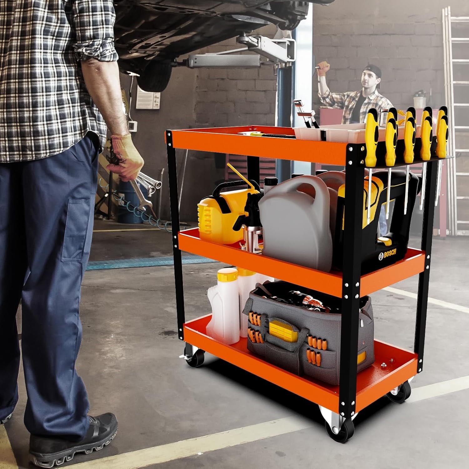 【Various Application】Constructed with a versatile design, this cart can be utilized in the garage, warehouse, workshops, repair shops, etc. With the ergonomic handle and rolling wheels, you can move it everywhere for ornamenting your space