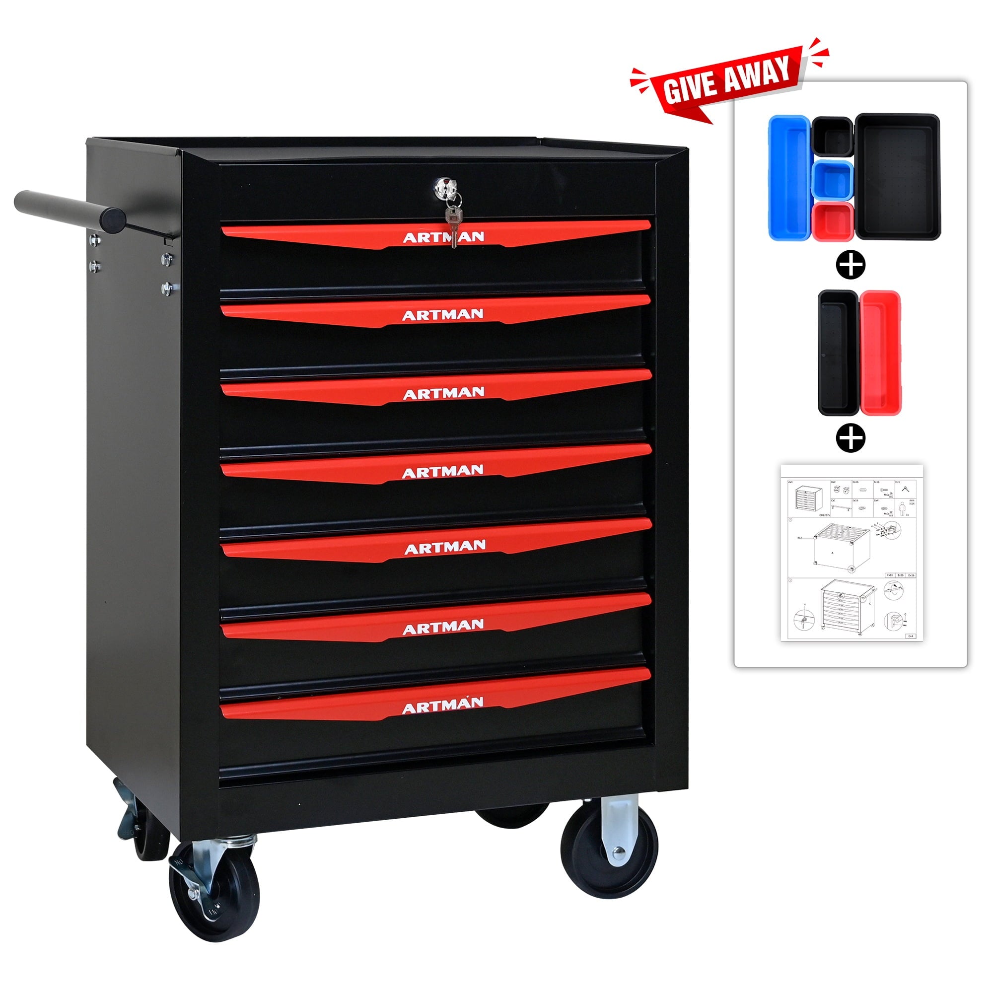 Seizeen Toolbox Series – Your Best Storage Solution With its sleek and compact design, Seizeen rooling toolbox offers you the perfect solution to keep your tools organized and easily accessible. But that’s not all! The 7 DRAWERS Rolling Tool Box is not just about lockable functionality, it’s also about convenience. Equipped with smooth-rolling wheels, this toolbox effortlessly glides across any surface, making it easy to transport your tools wherever they’re needed. Whether you’re working in the garage, on a construction site, or in the backyard, this toolbox ensures that your tools are always within reach. 🧰➤Features: 1. Heavy-duty rolling tool box & storage cabinet. 2. Anti-rust and anti-corrosion cold rolled steel 3. with side screwdriver shelf 4. Interlocking system for 7 drawers 5. Lockable drawers with anti-slip linner. 6. 4 universal wheels, two can be fixed. 🧰➤Specifications: Product Name: 7 Drawers Tool Box on Wheels Color: Red/Blue/Black Material:Cold Rolled Steel Surface Finish: Powder Coating Casters:3″ Casters (2PCS with brake and 2PCS without brake) 5 Drawers Dimension:20.9×9.6×3.2 IN 2 Drawers Dimension:20.9×9.6×2.5 IN