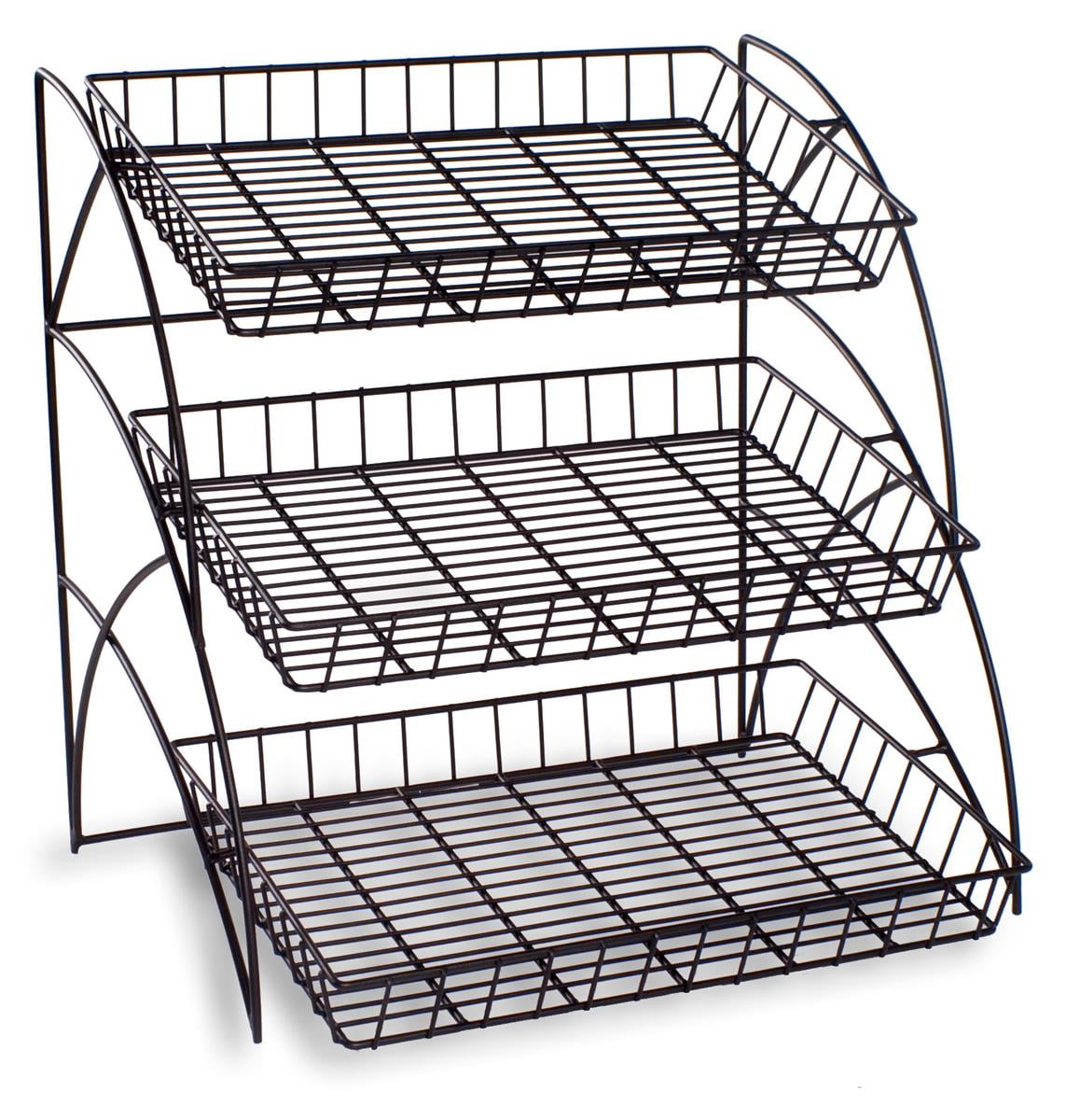 This tiered wire display rack has a simple, 3-level design for storing various supplies and products on top of a table or a counter. The entire tabletop shelving unit measures 20.5 inches wide by 21 inches high by 18 inches deep. The tired wire display rack optimizes countertop space by providing 3 shelves on which to store various items. The tabletop shelving unit is constructed from gauge wire and features a silver finish to blend in with any environment. The tiered wire display rack can even be used inside of a cabinet to keep items more easily accessible. The wire display rack presents each shelf at an angle for optimal visibility. There is approximately 5 inches in-between each level. This 3-level wire display rack ships unassembled to lower costs. Setup is easy and should only take a few minutes to complete.