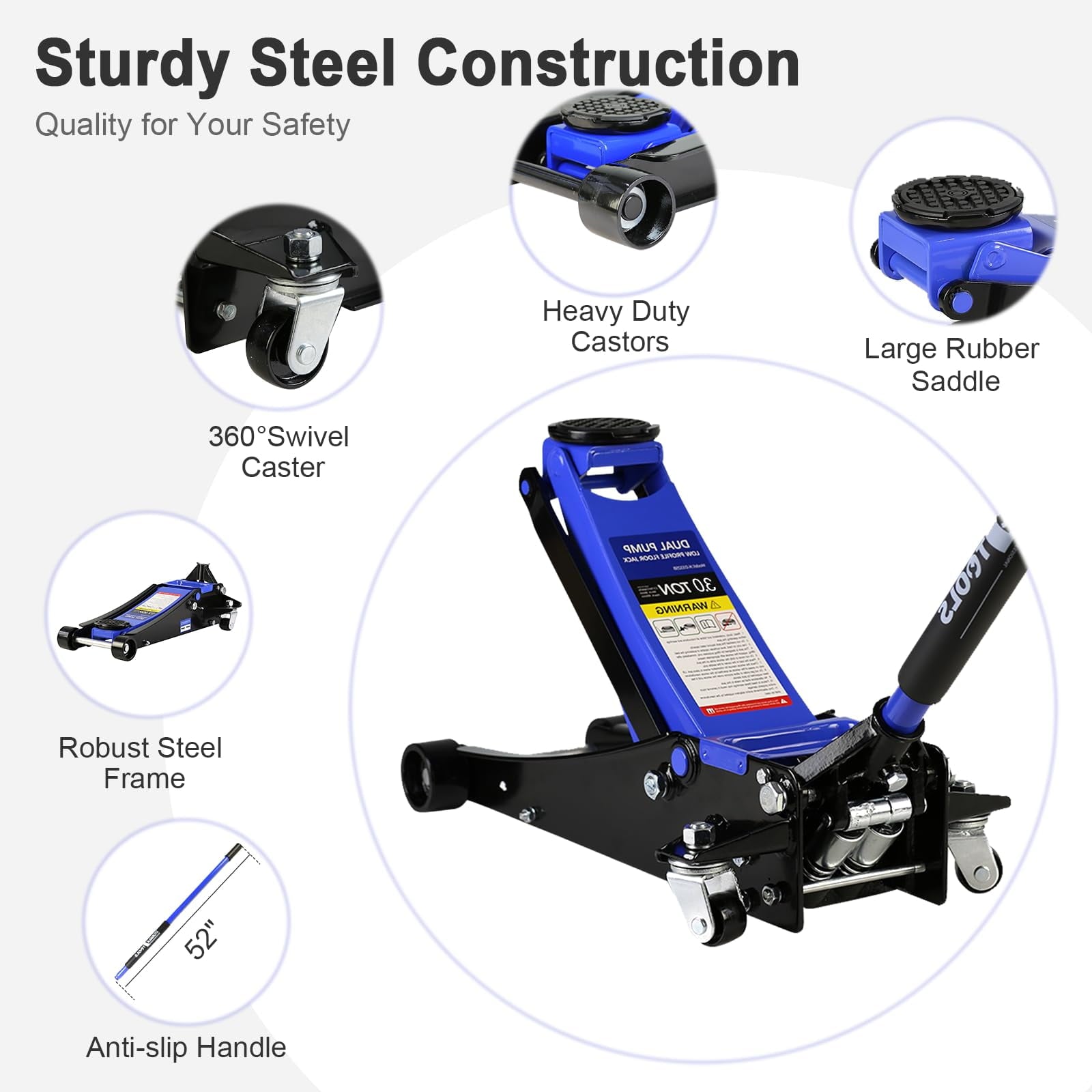 [Flexible Wheels]— Equipped with four flexible wheels, a pair of steel front casters, and a pair of swivel wheels, which help the car jack to be positioned and make the jack easy to maneuver, turn or roll.