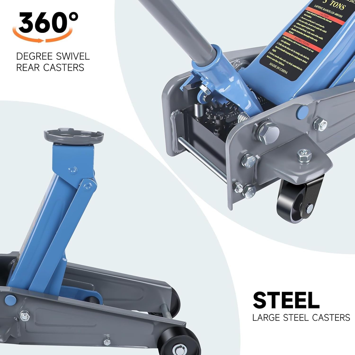 - 【Easy Maneuverability with 360° Swivel Casters】Move and position the jack with minimal effort. It’s equipped with 2 large front wheels and 2 rear 360-degree swivel casters for smooth rolling and precise placement on any garage floor or workshop surface. This design saves you time and energy during setup.