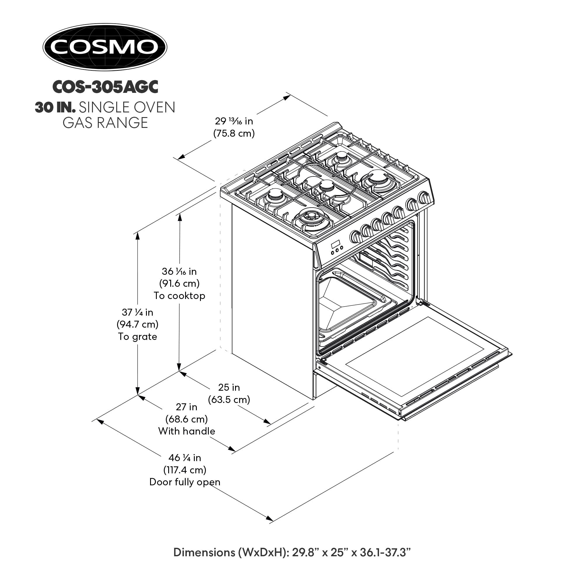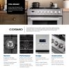 Cosmo’s COS-305AGC freestanding single oven gas range in stainless steel features 5 high-performance burners to allow you to create culinary masterpieces from start to finish. Designed with a large 5.0 cu. ft. oven to bake and broil meat to a flavorful crispness on the outside while maintaining tender juiciness inside. Rapid Convection from Cosmo delivers superior results that can be tasted with more flavorful cooking. Our single oven gas range cooktop features one 18,000 BTU Burner, one 8,800 BTU Burner, two 6,900 BTU Burners and one 5,000 BTU Burner. A built-in display and electronic controls let you set the clock and timer for precision cooking. For added versatility, an optional Liquid Propane Conversion Kit is sold separately to convert our freestanding gas range to run on propane.