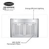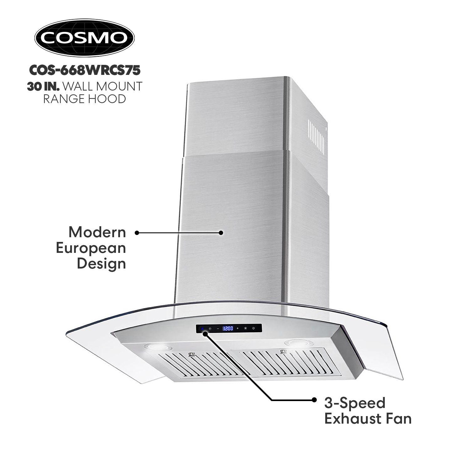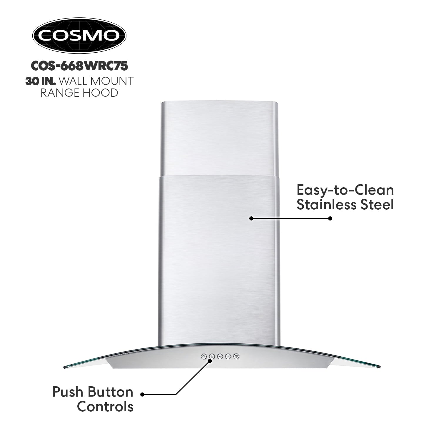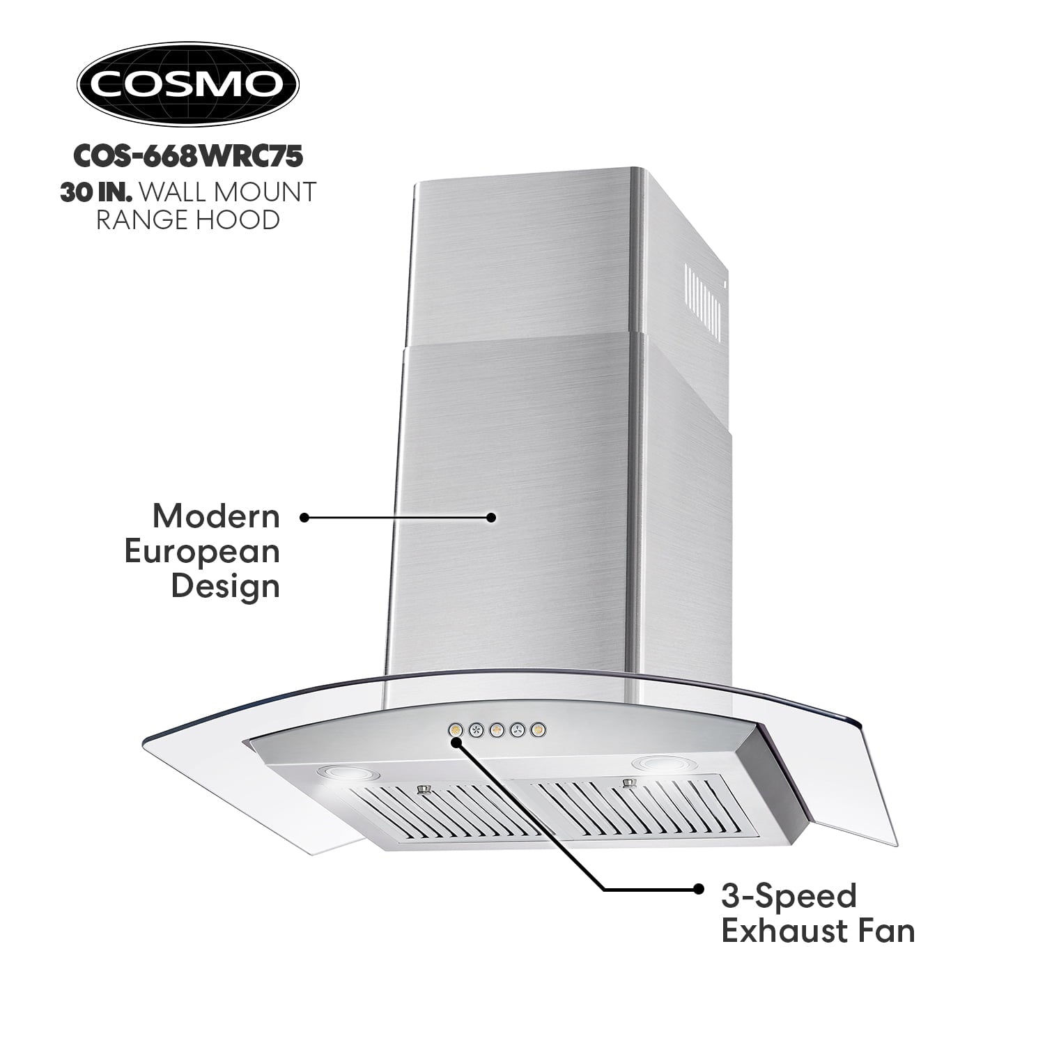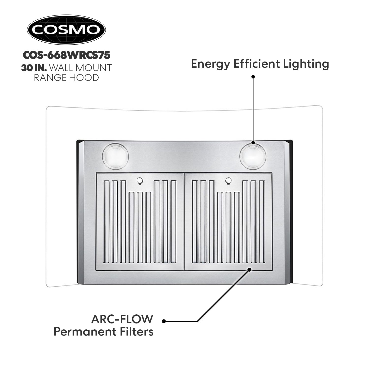 Cosmo’s COS-668WRC75-DL combines curved glass and stainless steel perfect for any modern kitchen. The flowing designs of our ductless 30″ wall mount range hood come with a 380 CFM centrifugal motor that traps smoke and fumes from lingering in your home. Cosmo Range Hoods include ARC-FLOW Permanent Filters, the only filters that provide greater airflow and are dishwasher-safe for easy clean-up. Push button controls manage multiple functions, including 3 fan speeds and LED lighting for added visibility. This ductless range hood includes a 3-prong power plug for easy use. Part of the Vista Collection bringing enhanced functionality and design, offering a well-rounded option for those looking for more convenience and style in an appliance.