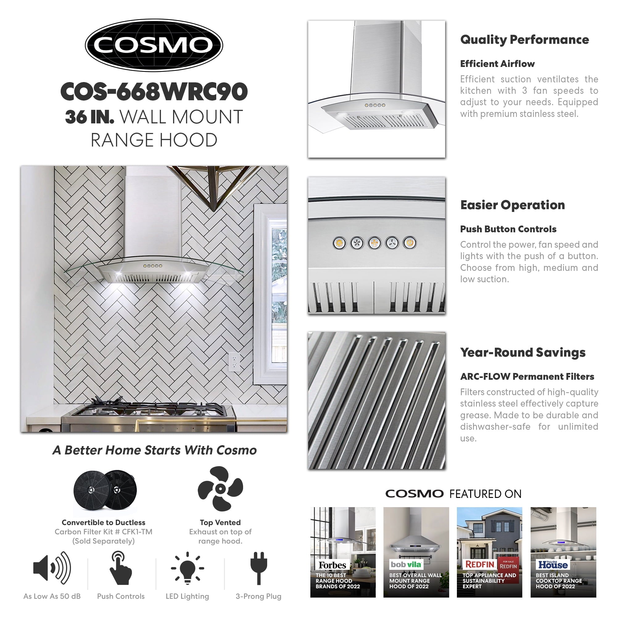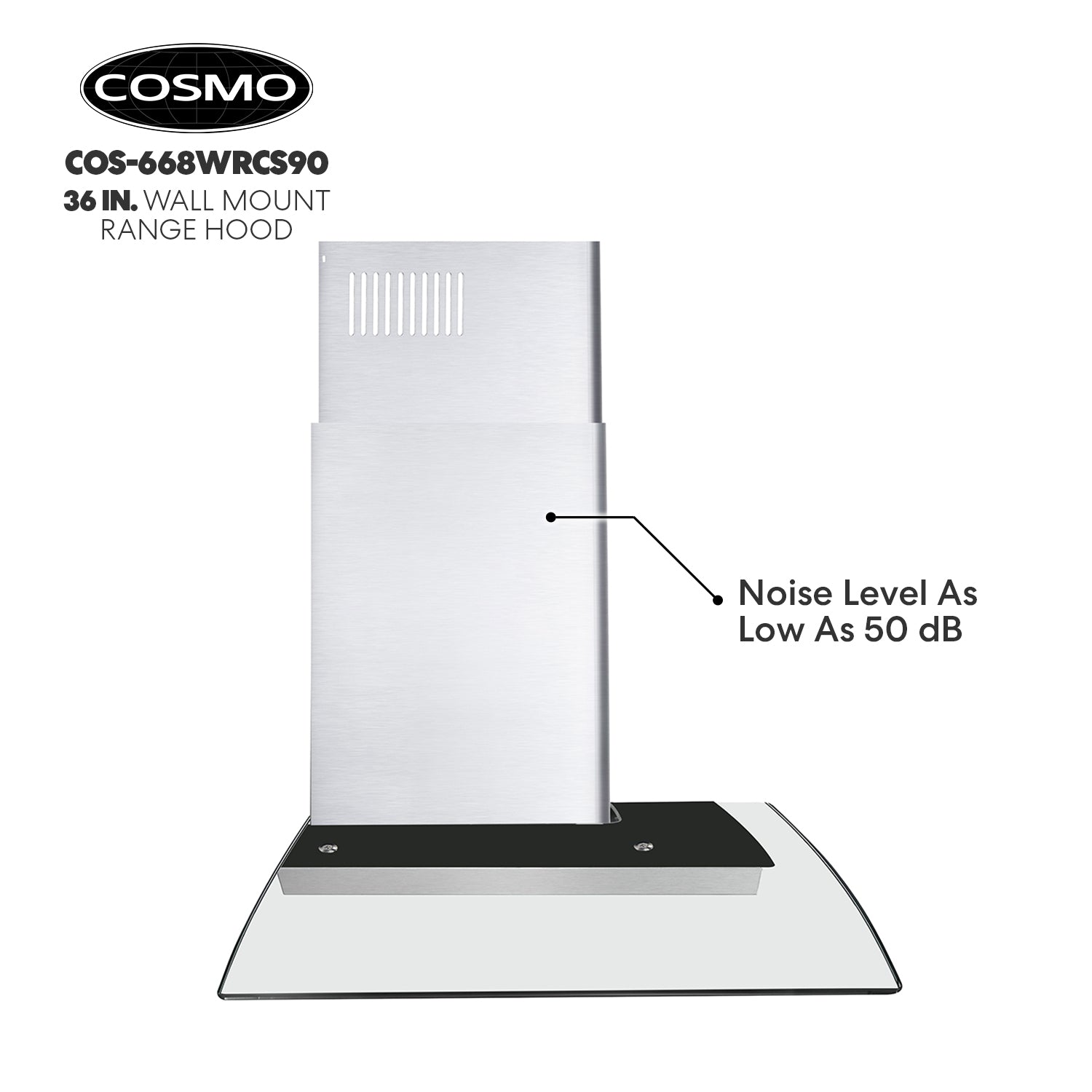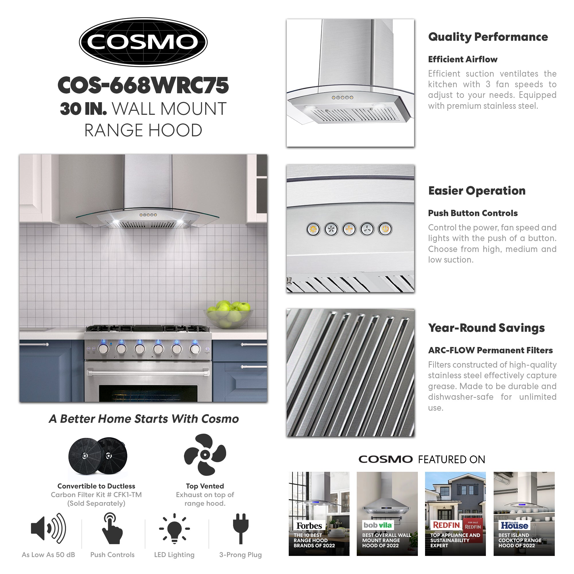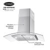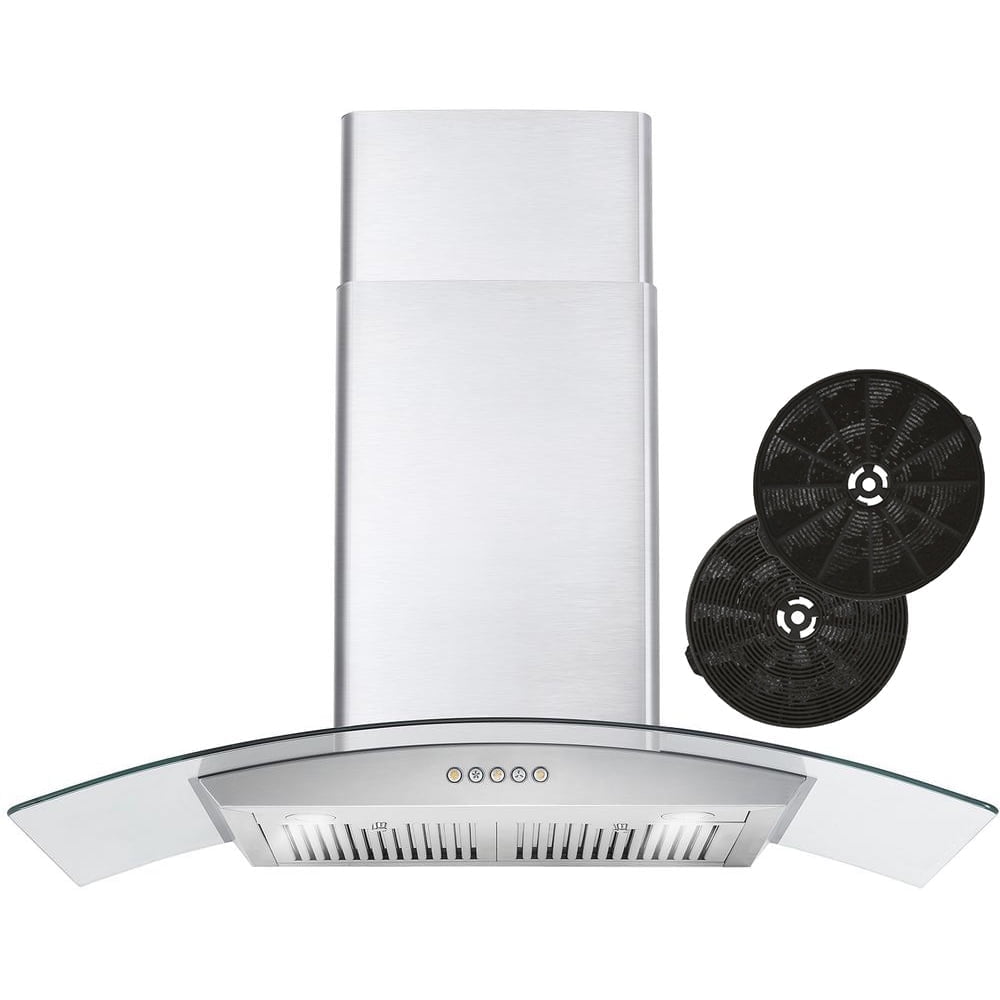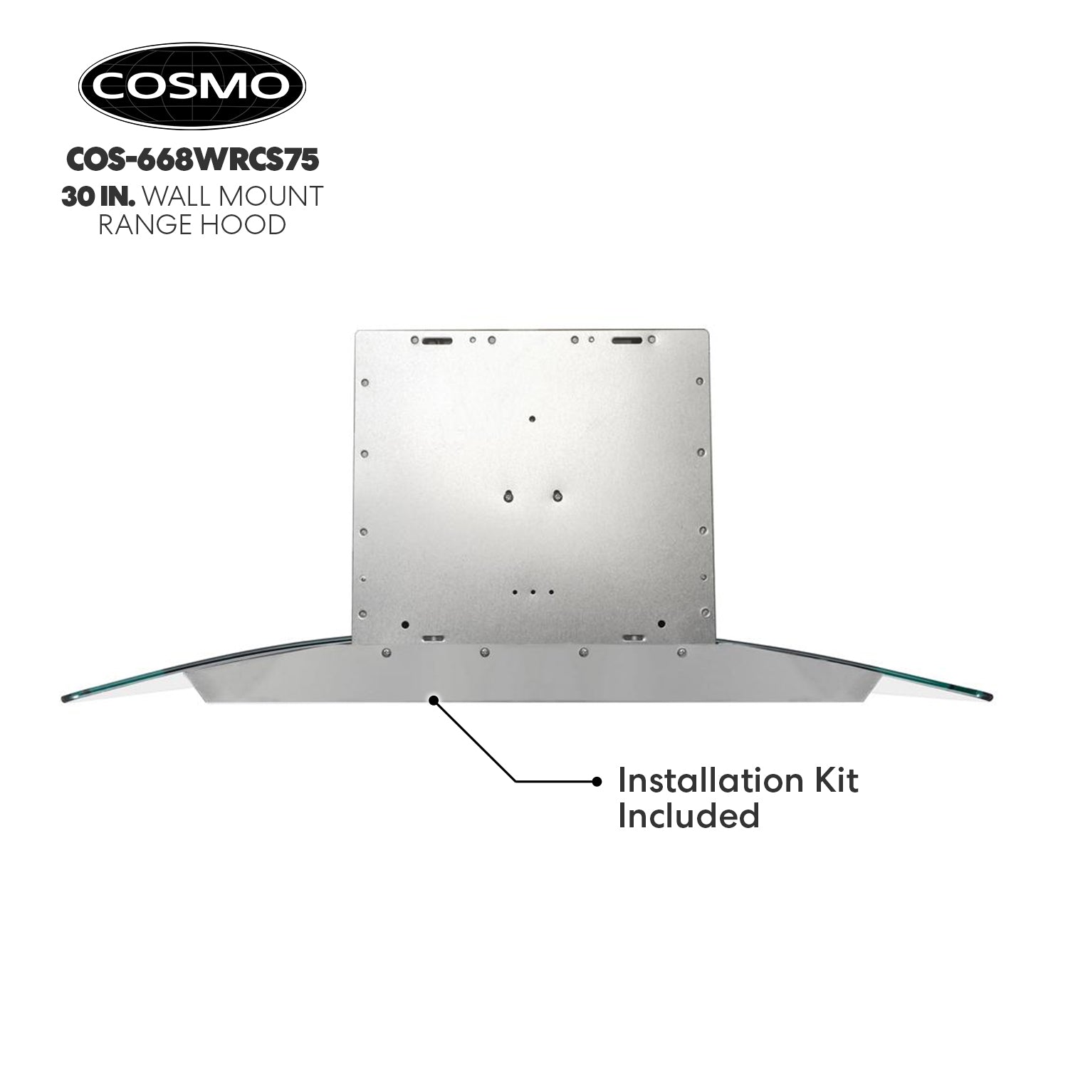 Cosmo’s COS-668WRC75-DL combines curved glass and stainless steel perfect for any modern kitchen. The flowing designs of our ductless 30″ wall mount range hood come with a 380 CFM centrifugal motor that traps smoke and fumes from lingering in your home. Cosmo Range Hoods include ARC-FLOW Permanent Filters, the only filters that provide greater airflow and are dishwasher-safe for easy clean-up. Push button controls manage multiple functions, including 3 fan speeds and LED lighting for added visibility. This ductless range hood includes a 3-prong power plug for easy use. Part of the Vista Collection bringing enhanced functionality and design, offering a well-rounded option for those looking for more convenience and style in an appliance.
