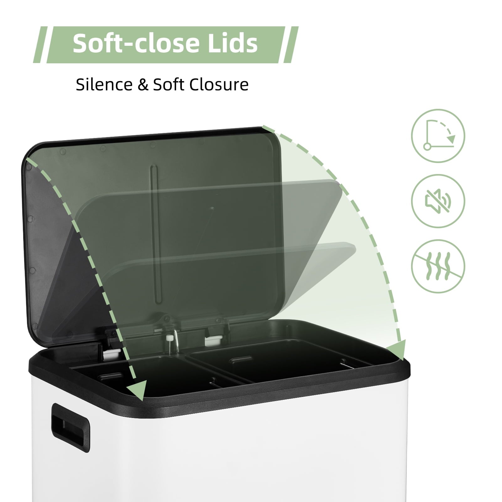 Home Garbage Cans & Wastebaskets 30 Liter/8 Gallon Trash Can, Rectangular Hands-Free Dual Compartment Recycling Kitchen Step Trash Can with Soft-Close Lid, Stainless Steel Garbage Can with 2 x 15L Inner Buckets, White