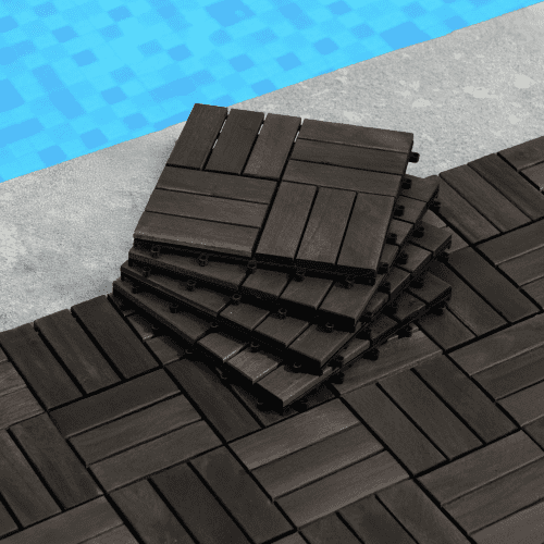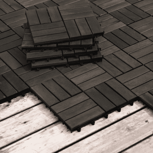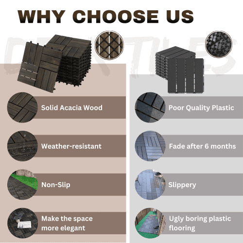 - Waterproof & Anti Mildew and Mold: Wood Deck Tiles were sanded with 240-grit sanding paper and then finished with water-based oil, which helps them Waterproof & Anti Mildew and Mold