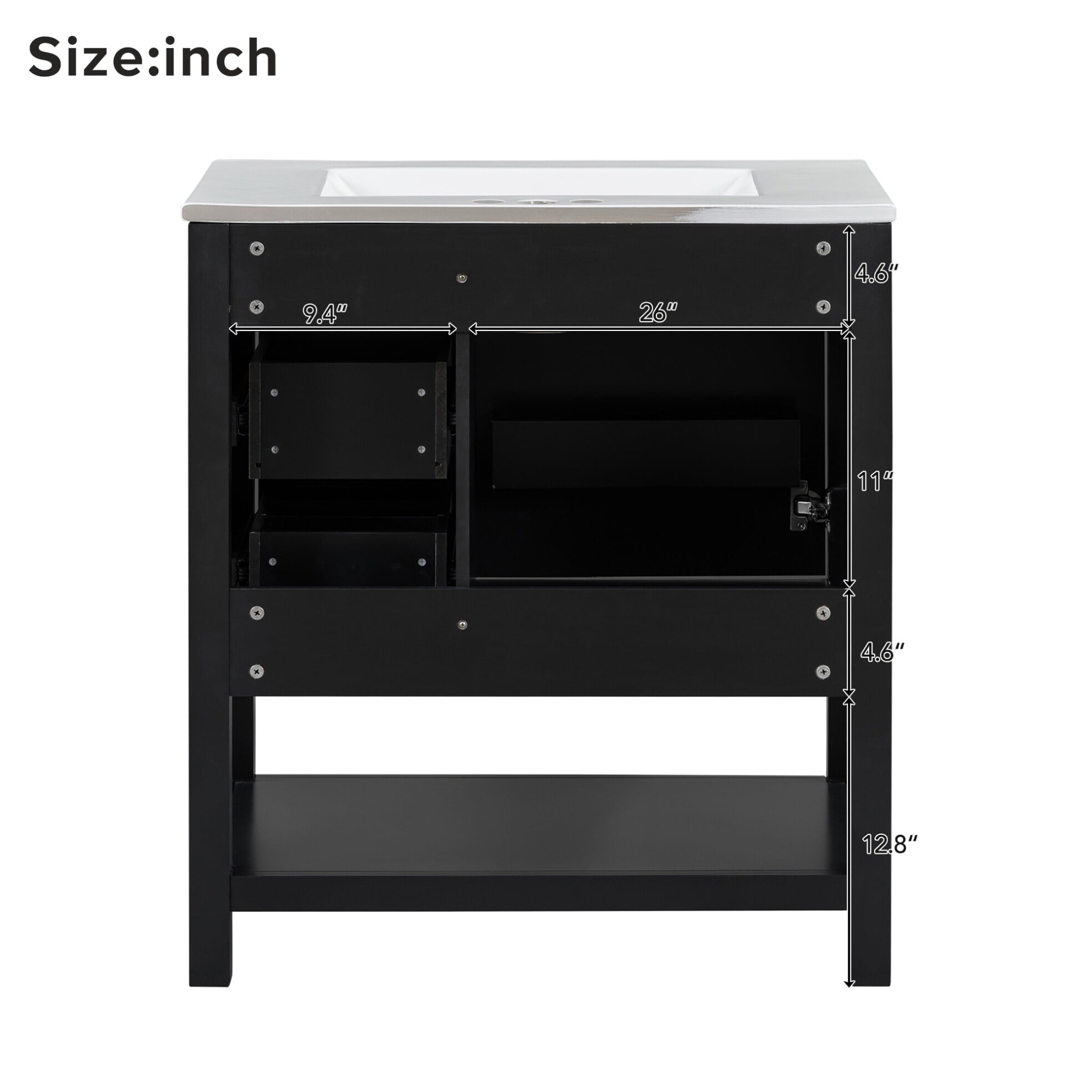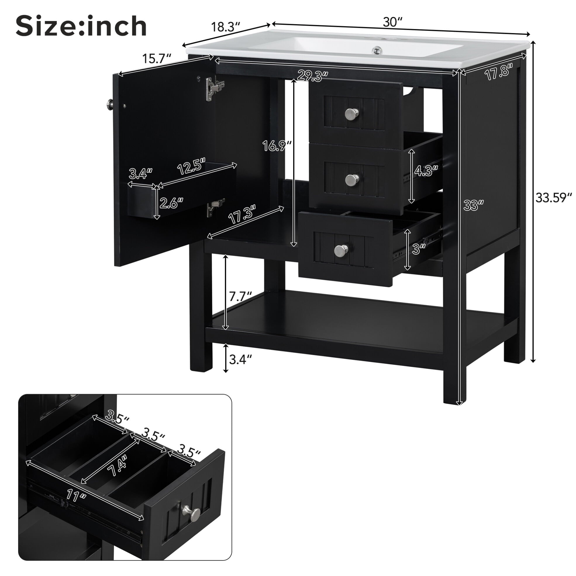 Transform your bathroom into a stylish and functional space with this 30″ Transitional Green Bathroom Vanity and Sink Combo. Designed for modern aesthetics, this freestanding unit combines durable construction with smart storage solutions. Crafted from solid wood and MDF with a waterproof painted finish, it resists moisture damage while maintaining a sleek green appearance. The vanity features dual-depth drawers with organizational partitions: an upper deep drawer stores tall items like toiletries, while the lower compartment organizes small essentials. An interior cabinet shelf and open base towel shelf maximize storage efficiency. The undermount glazed ceramic sink includes overflow protection for easy cleanup, featuring a non-porous surface that resists water stains and mineral buildup. Soft-close mechanisms on drawers and cabinet doors ensure silent operation with dampened closing action. At 30″ wide x 18.3″ deep x 33.59″ tall, this transitional design blends modern and traditional elements perfectly. Includes illustrated assembly instructions with pre-drilled components for straightforward setup. Ideal for bathroom remodels needing quiet operation and space-saving storage solutions. Note: Faucet and drain assembly sold separately. Package dimensions: 36.61″L x 22.52″W x 19.84″H (106.26 lbs).