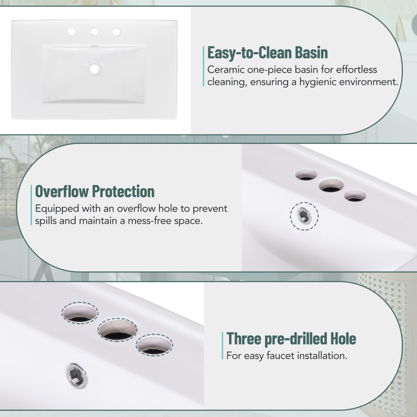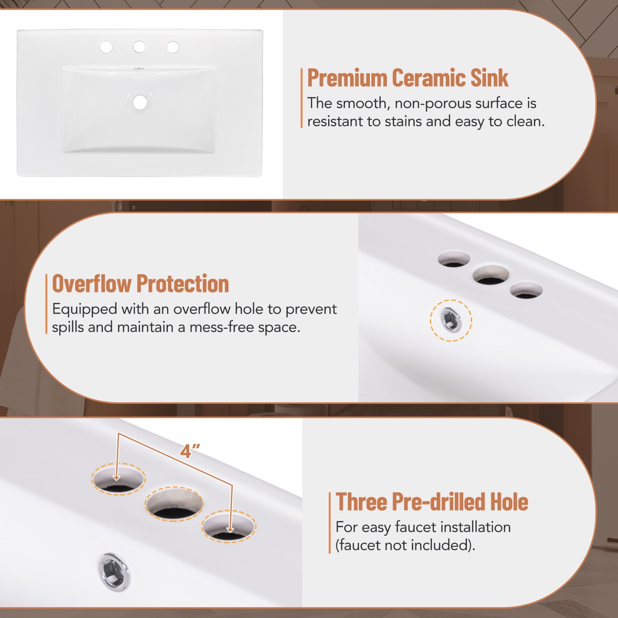 • Glazed ceramic sink with non-porous surface resists water stains and mineral buildup, featuring integrated overflow protection for effortless maintenance