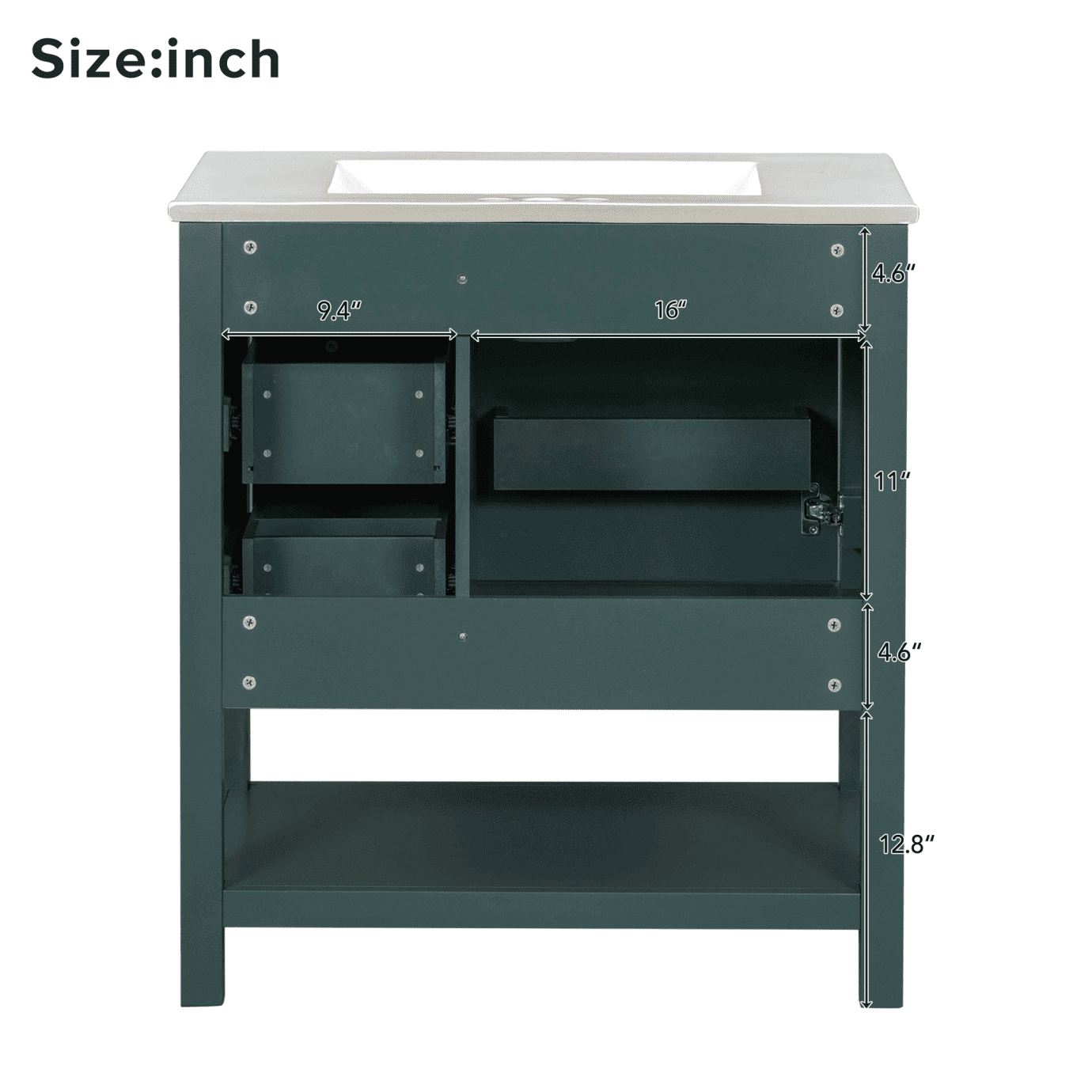 30″ Transitional Green Bathroom Vanity with Sink Combo, Solid Wood Storage Cabinet featuring Soft Close Doors & 2 Drawers, Open Shelf, Waterproof Design & Easy Assembly for Modern Bathrooms